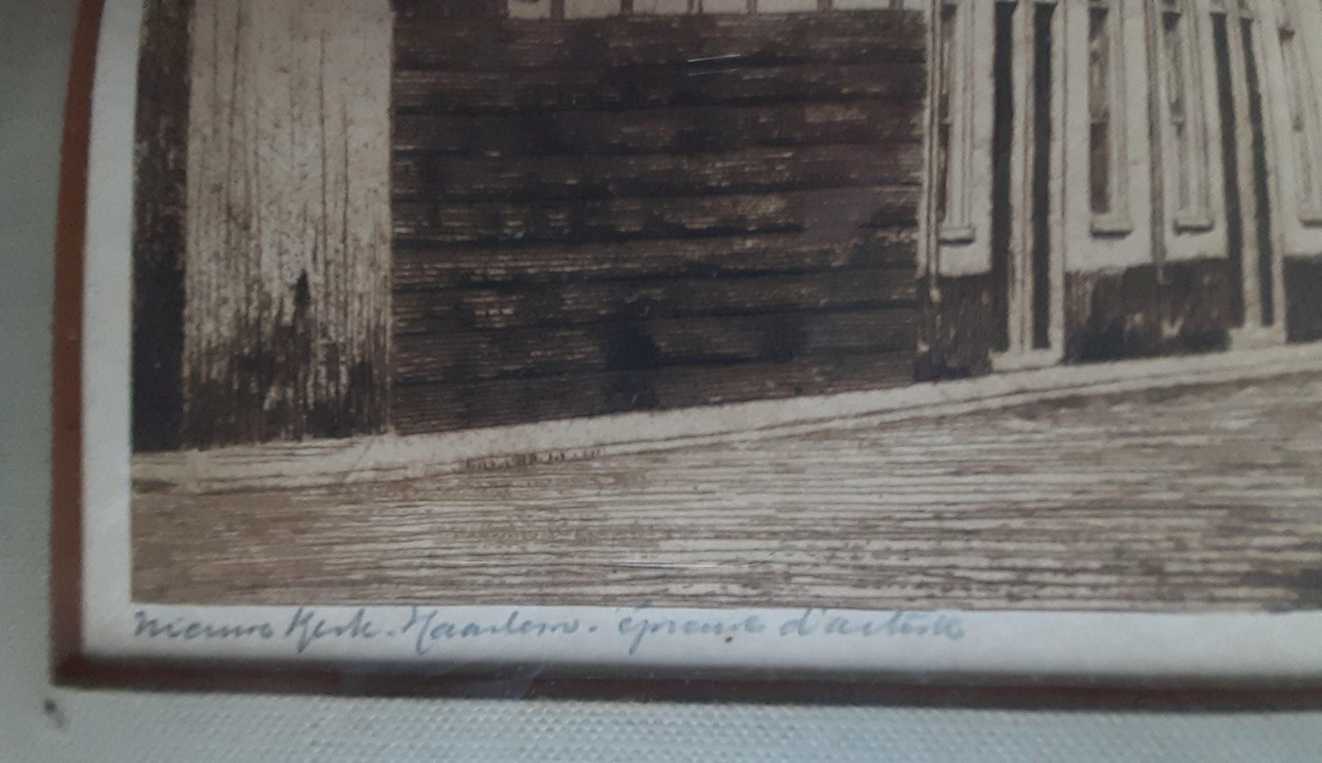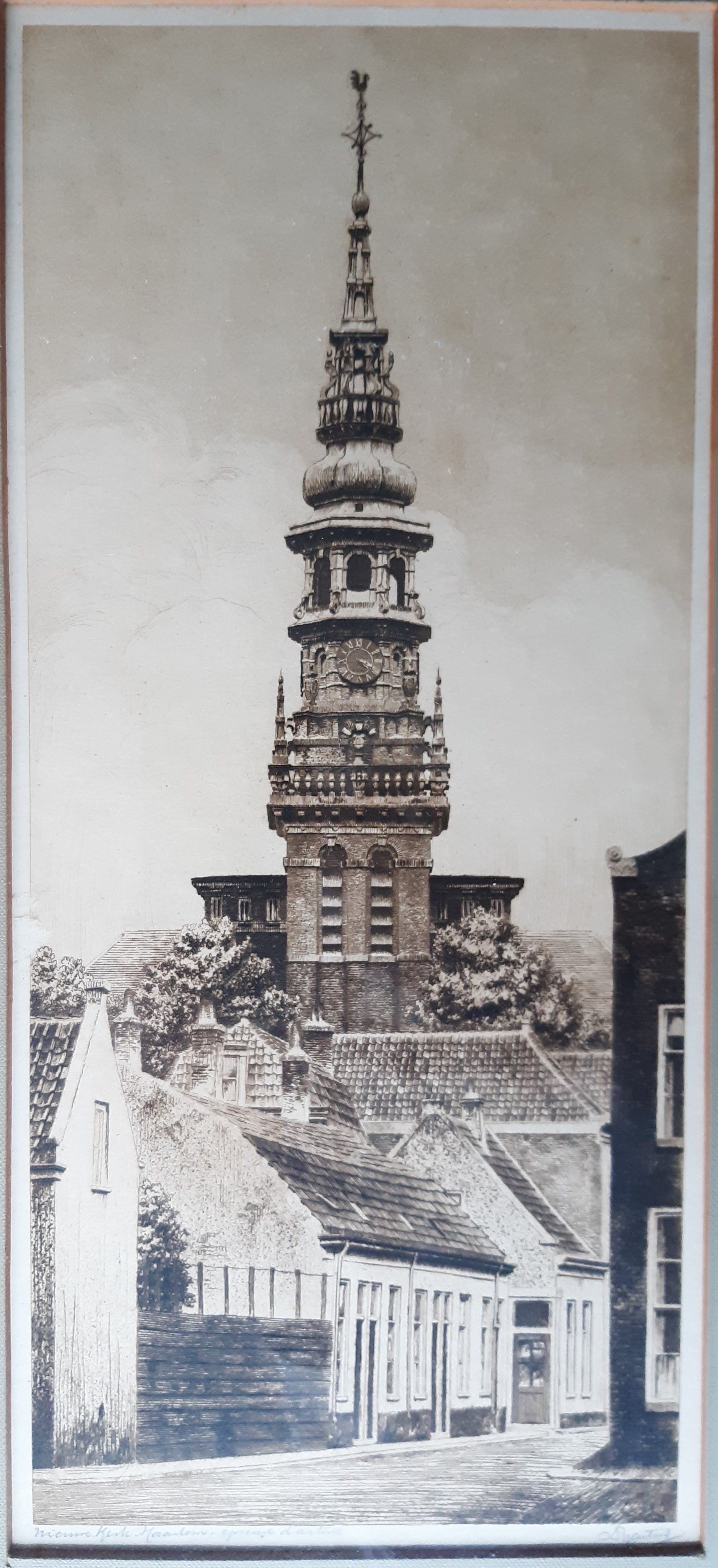Een gedetailleerde ets van de Nieuwe kerk te Haarlem met op de voorgrond huizen aan een straat.