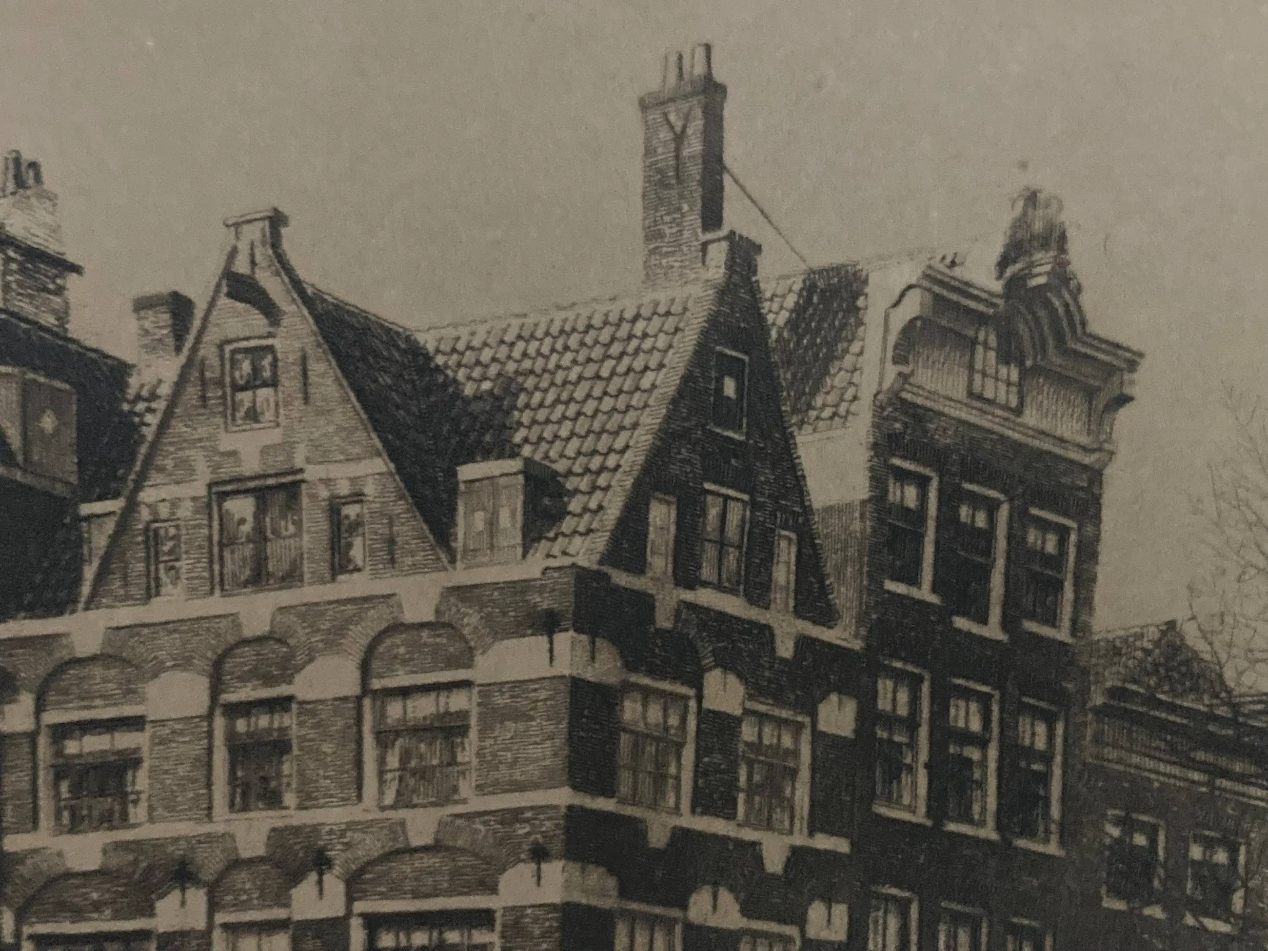 Ets van hoekpand aan de Prinsengracht (hoek Brouwersgracht) van Amsterdam fraai gedetailleerd werk van Dirk Harting. Ets is gesigneerd en onbeschadigd. Papierkleur chamois. Formaat wissellijst (simpel met glasplaat) 50 x 35 cm Formaat ets 32 x 22cm
