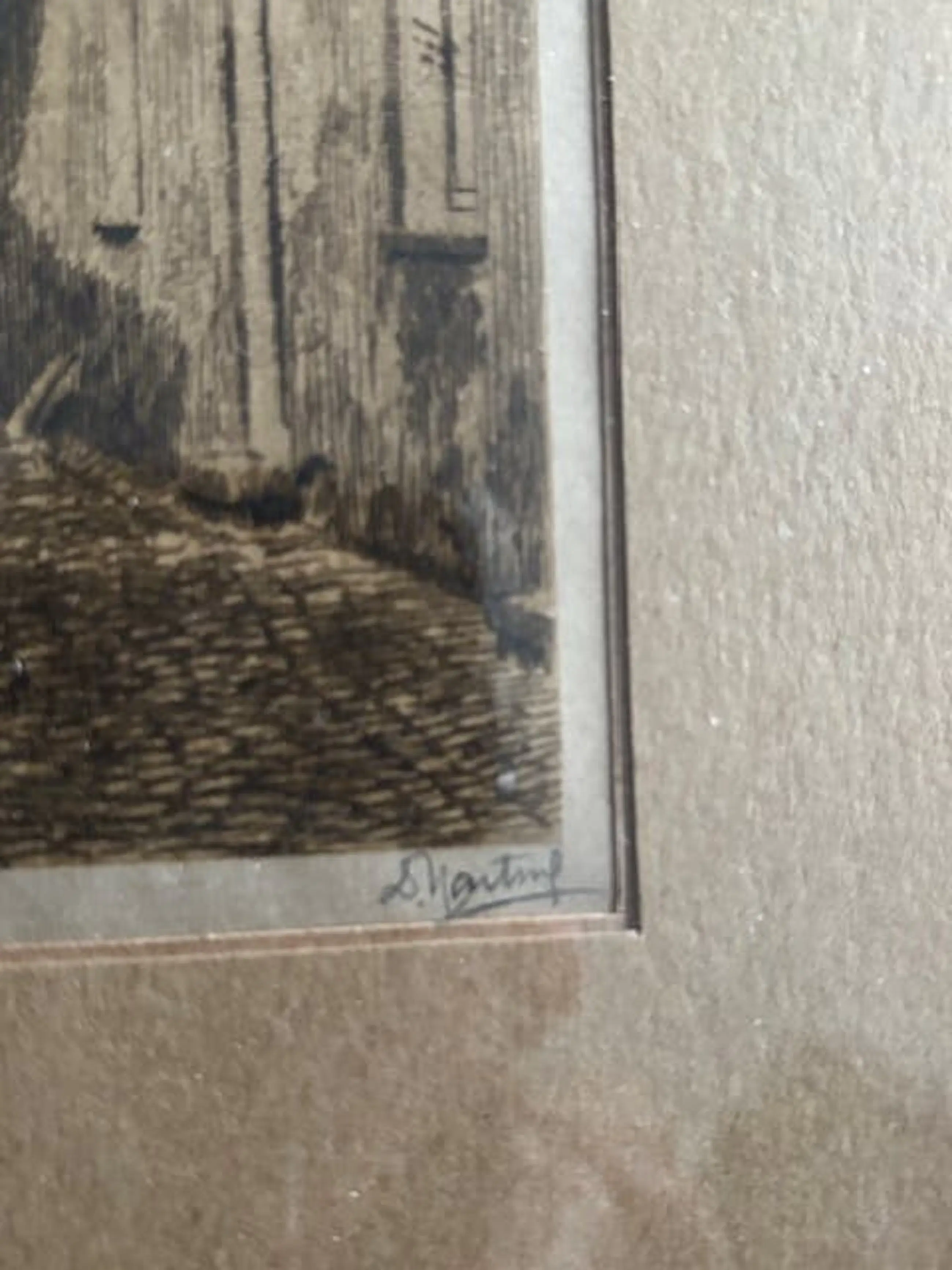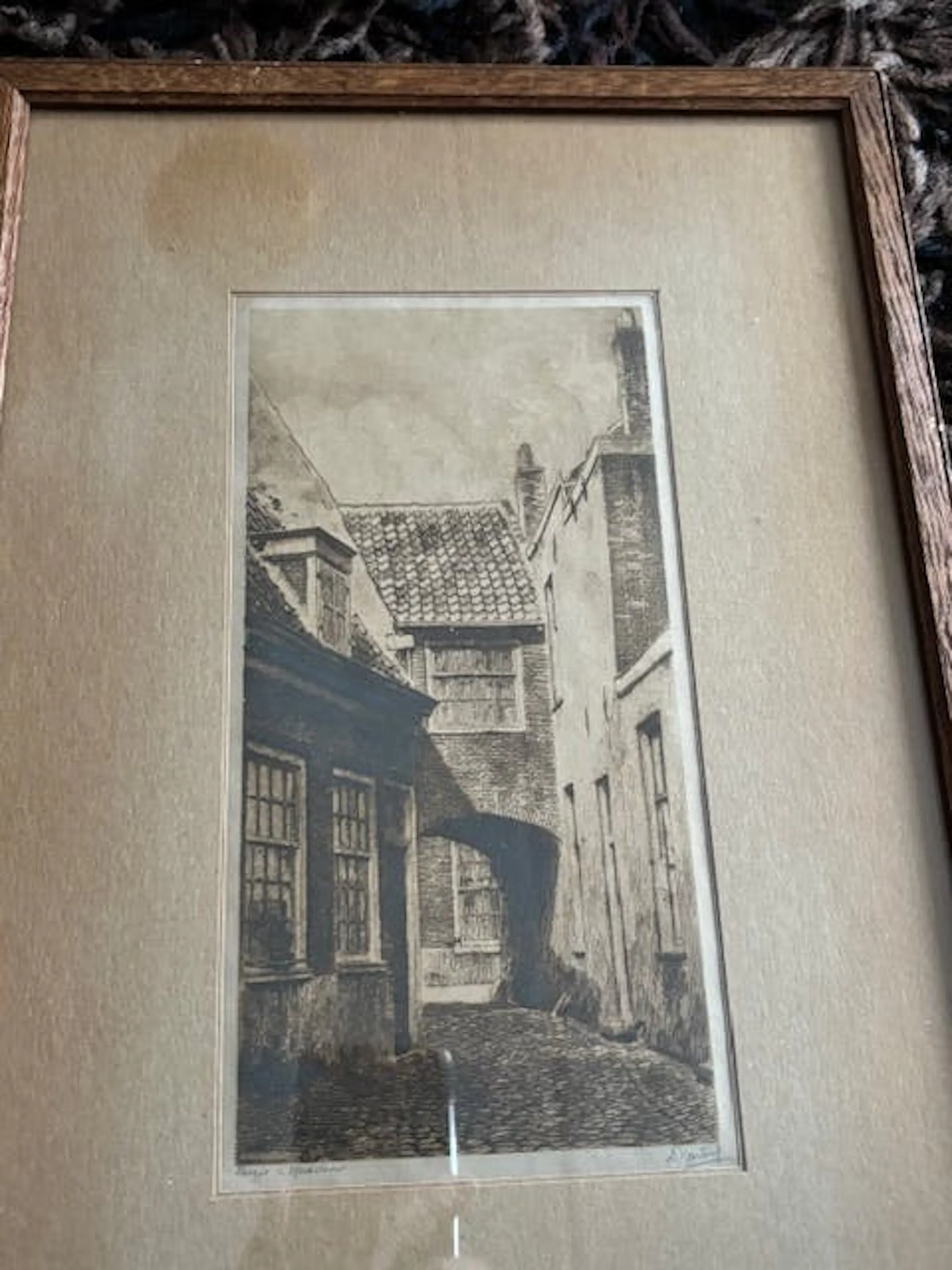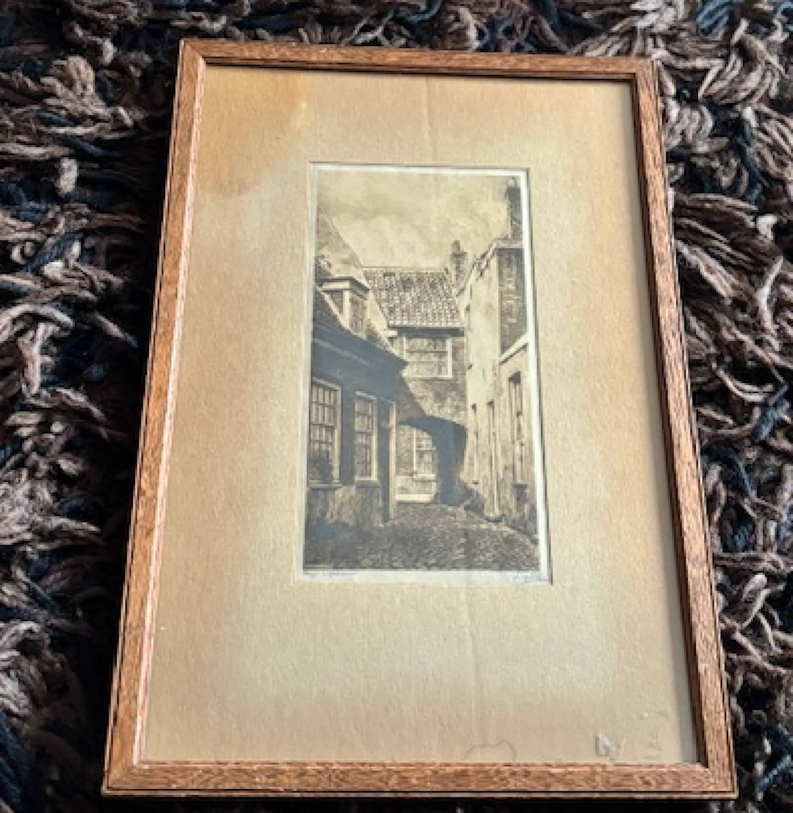 Een ets uit de eerste helft van de 20e eeuw van de Nederlandse kunstenaar Dirk Harting met voorstelling van een "steegje te Haarlem".