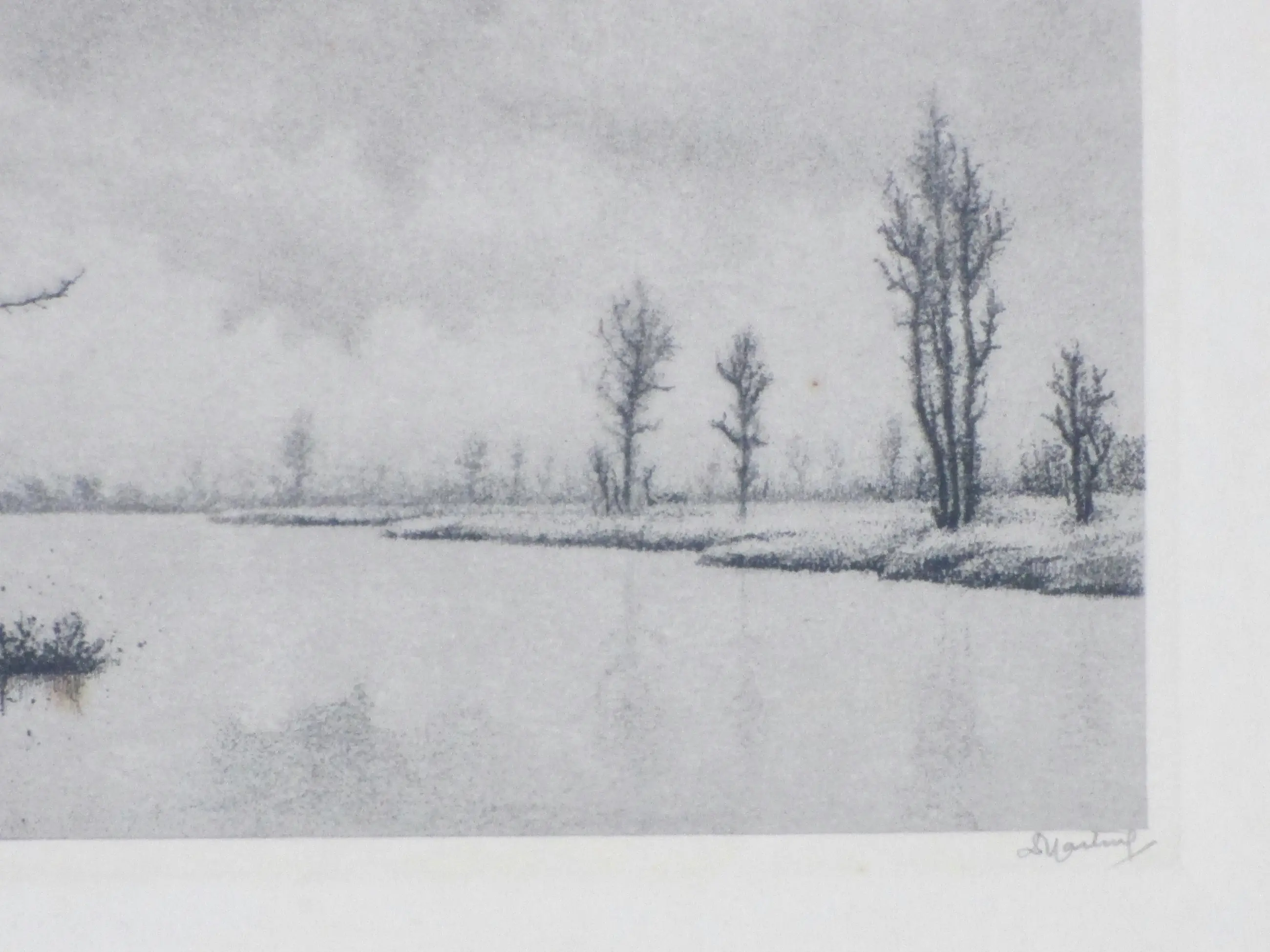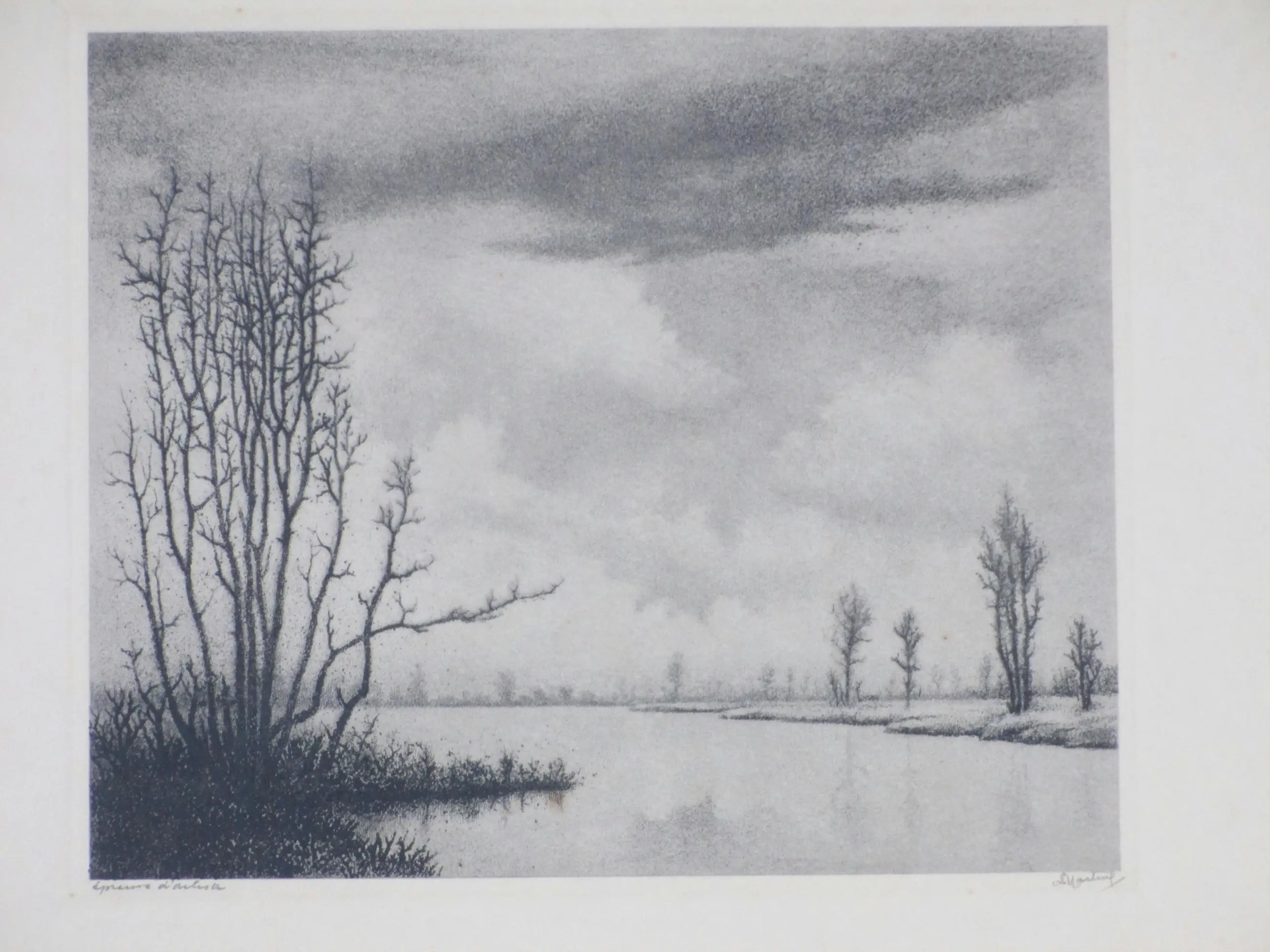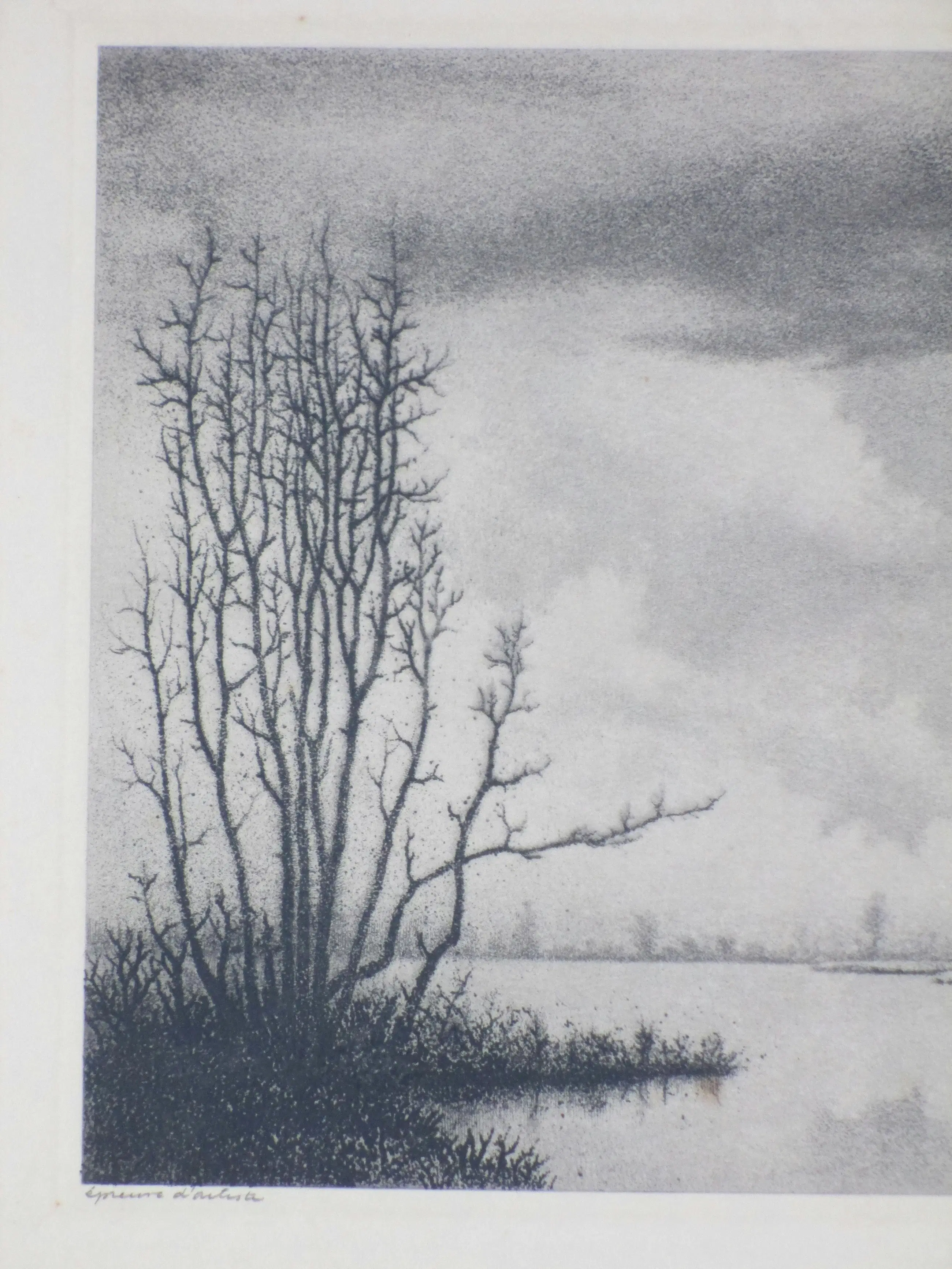 Klassieke ets door Dirk Harting Voorstelling van een waterlandschap met bomen aan de kant Losbladig, beeldmaat 15.5x18, bladmaat 25x30 Gesigneerd in potlood r.o.: 'D Harting' Annotatie in potlood l.o.: 'épreuve d'artiste' Authenticiteit volledig gegarandeerd