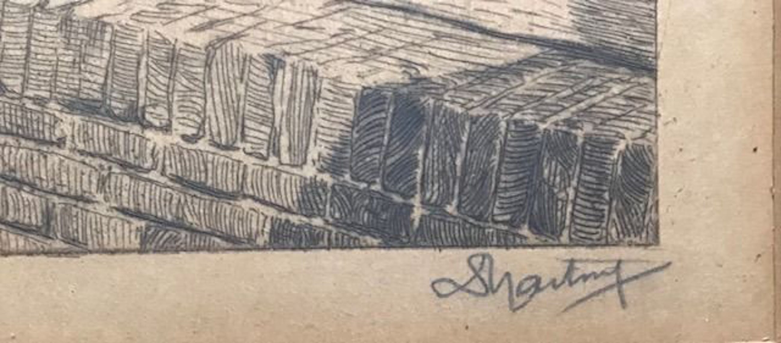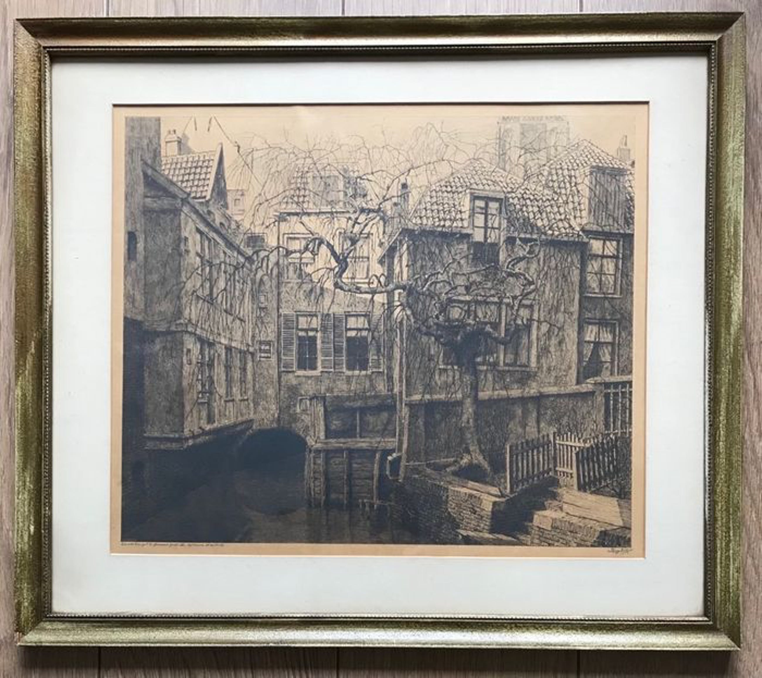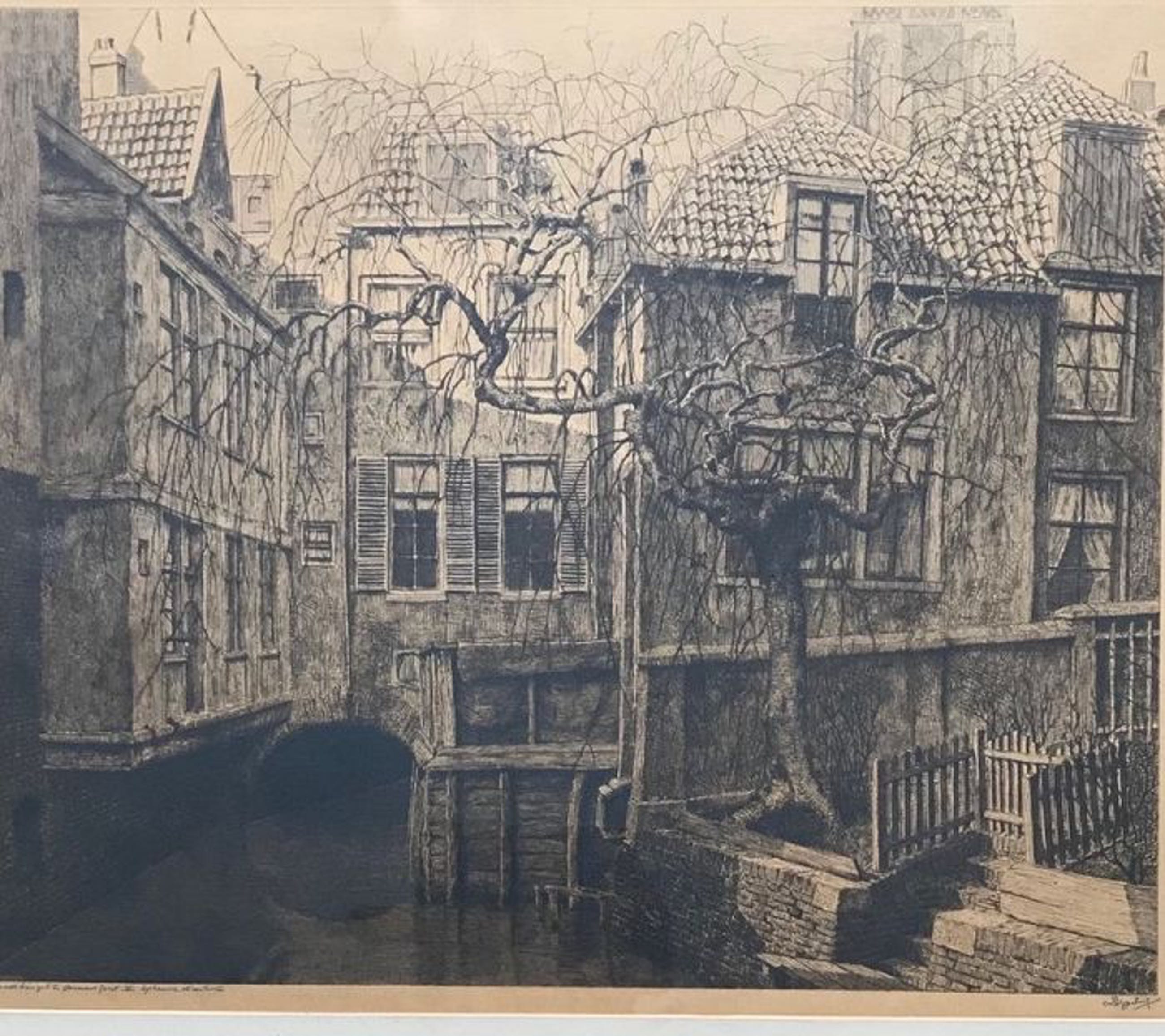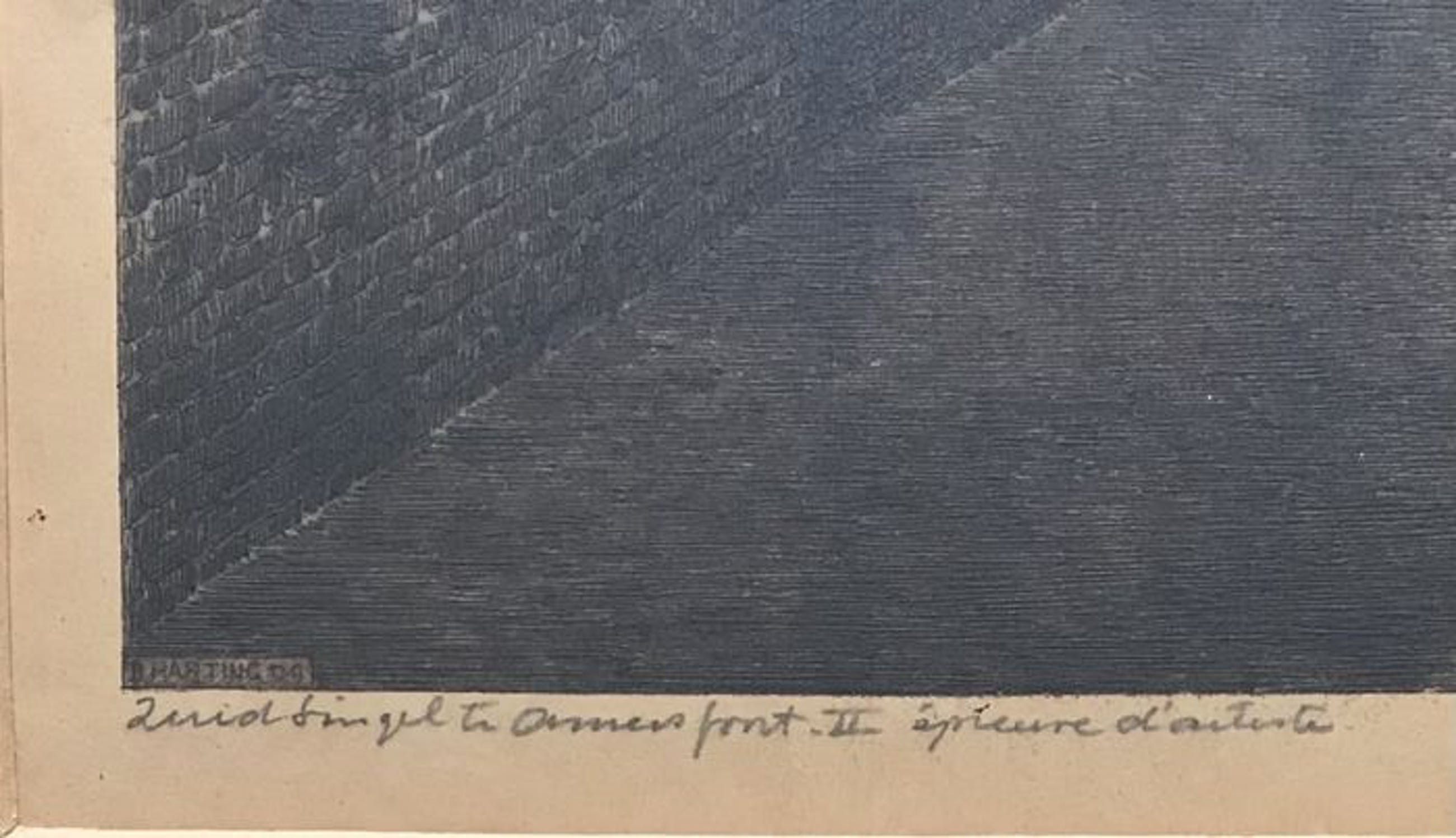Ets van de Zuidsingel in Amersfoort. Ets gemaakt in 1909. In het overzicht van 55 etsen van Dirk Harting uit 1927 werd deze ets aangeboden tegen de prijs van 25 gulden. Nog authentiek ingelijst. Beeldmaat 40 cm x 33,5 cm. Linksonder in de plaat D. Harting ’09. Met potlood épreuve d’artiste en betiteld. Rechtsonder met potlood gesigneerd.
