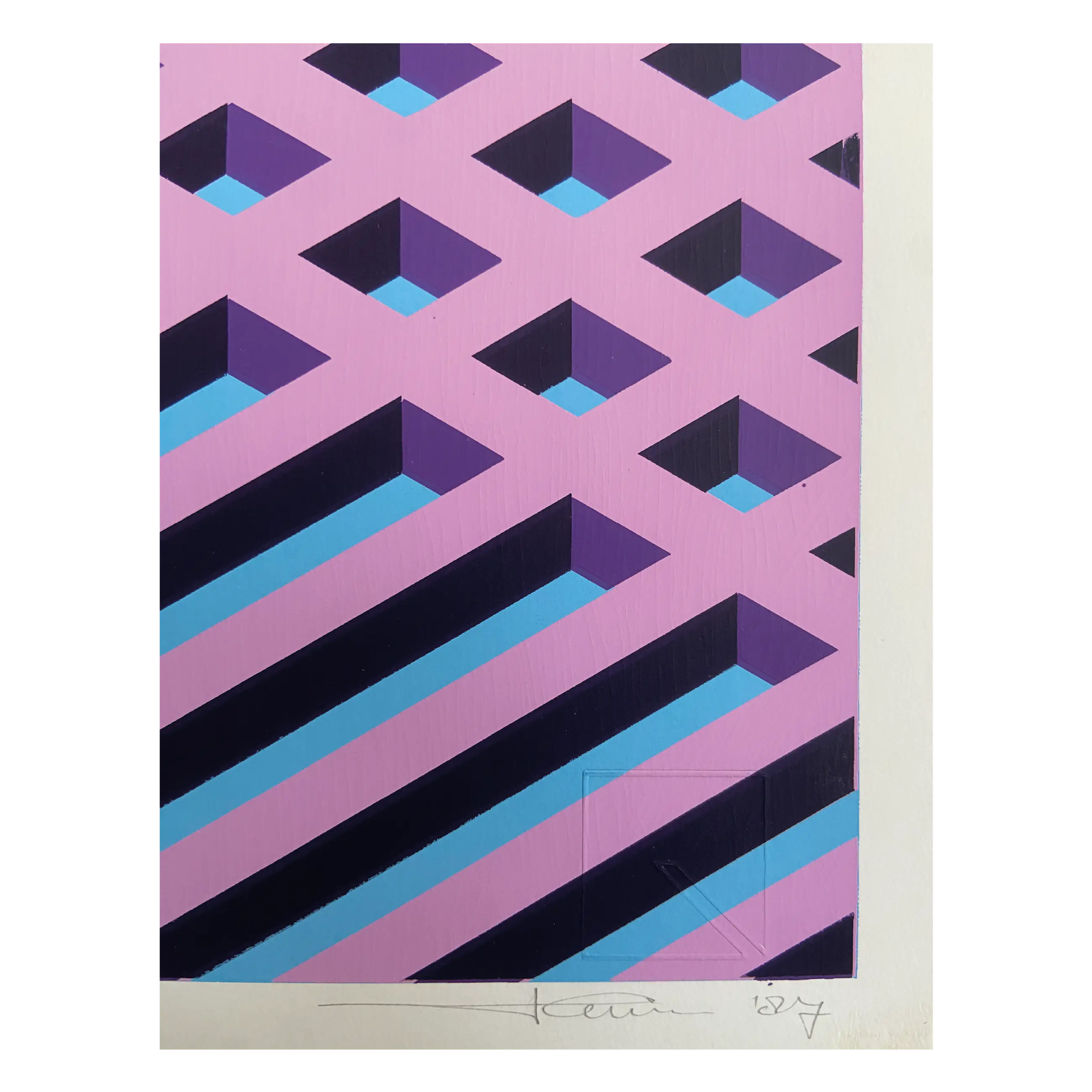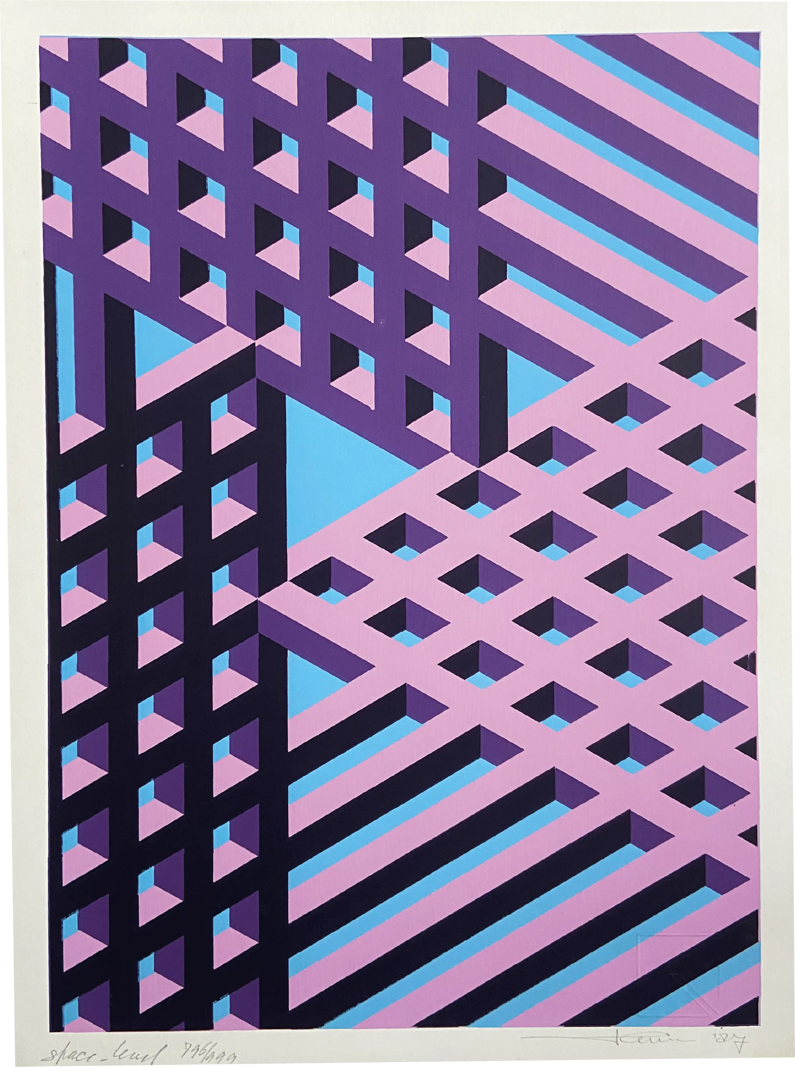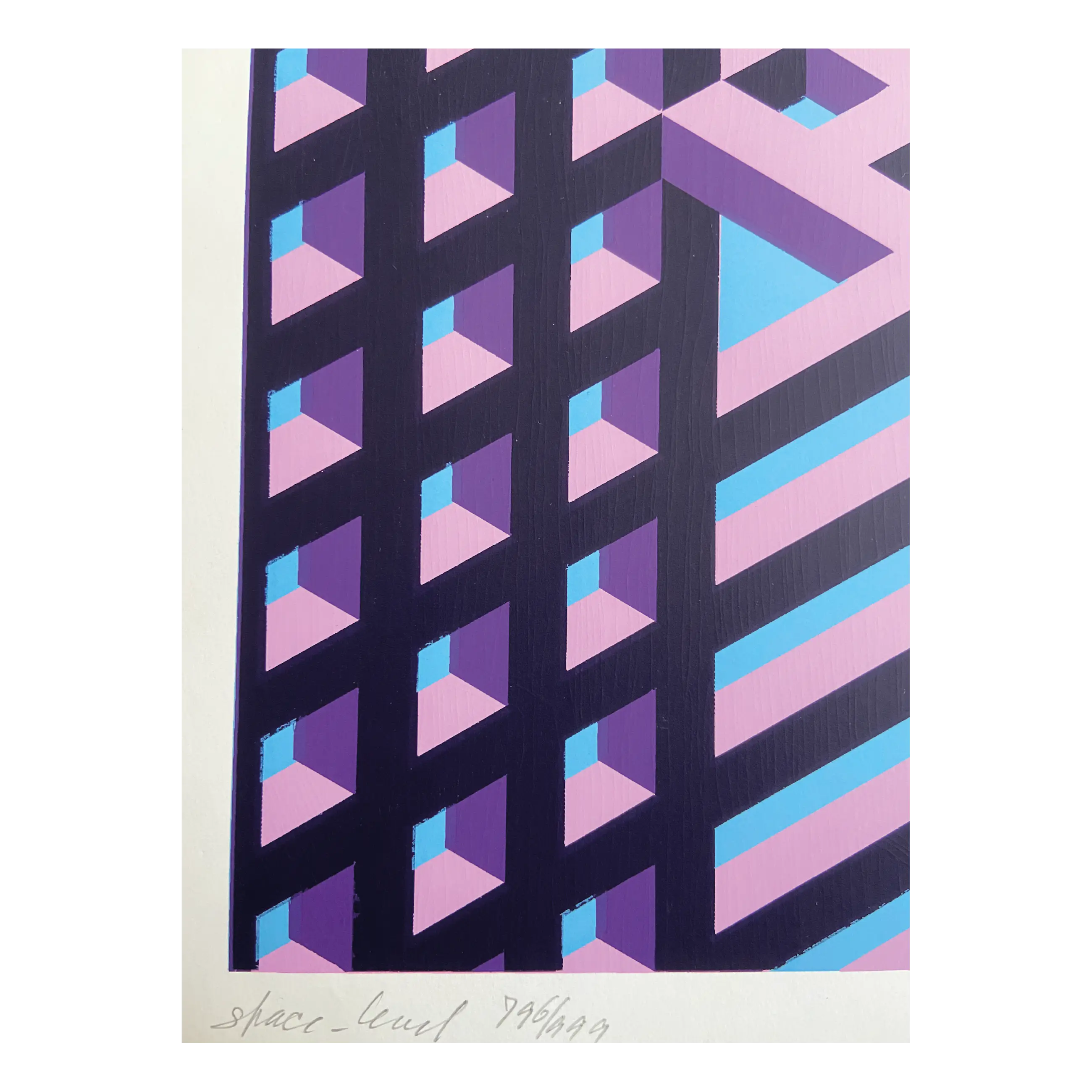 Deze prachtige zeefdruk, getiteld "Space Level," is vervaardigd in 1987 en met de hand gedrukt door meester zeefdrukker Wout van der Vet. Het werk is genummerd 796 van een oplage van 999 en is gesigneerd met potlood door de kunstenaar zelf. Dirk Huizer, geboren in Rotterdam, was een veelzijdig ontwerper en graficus, en zijn oeuvre weerspiegelt een diepgaande expertise in zowel autonome kunst als interieurontwerp.