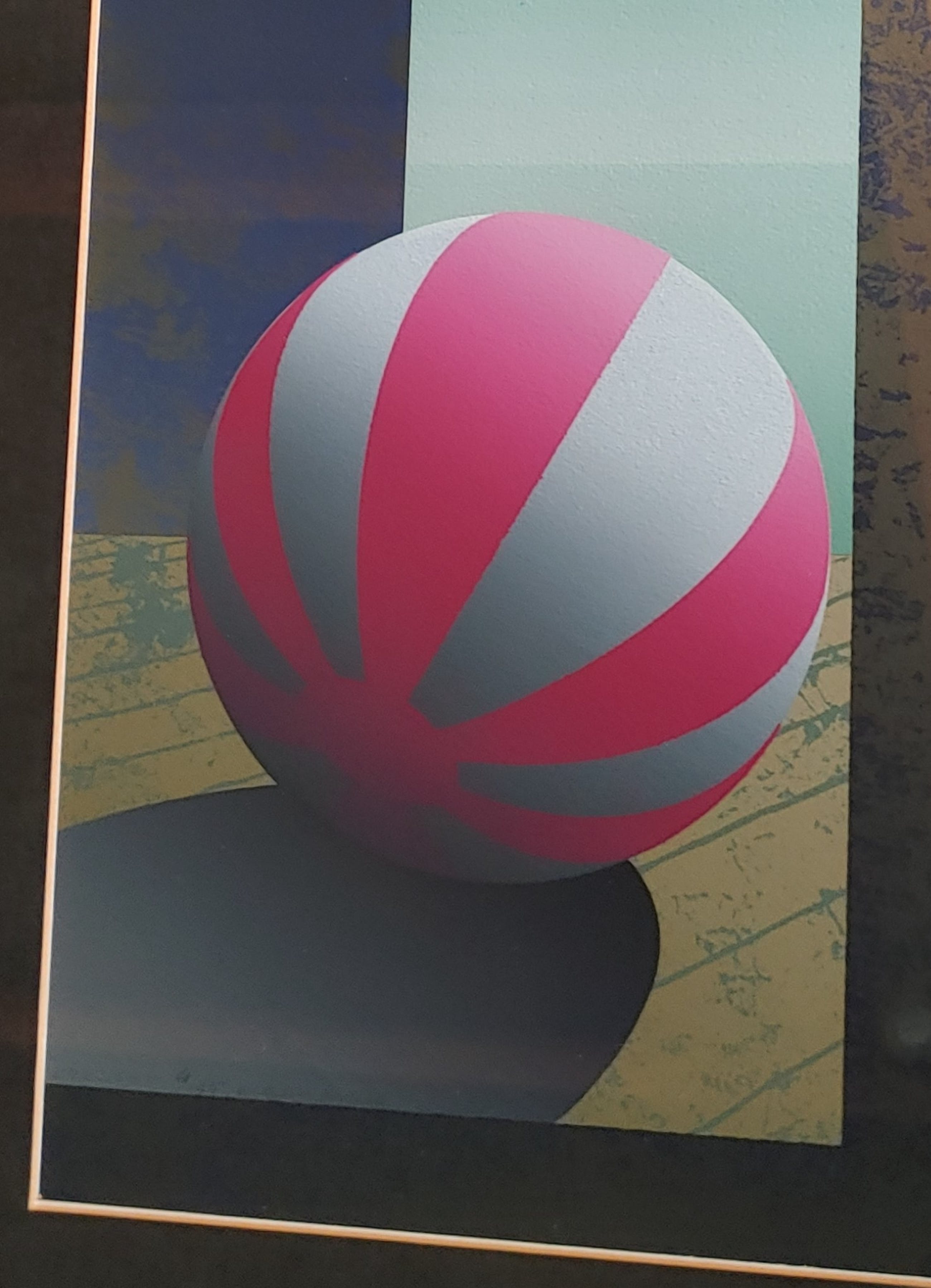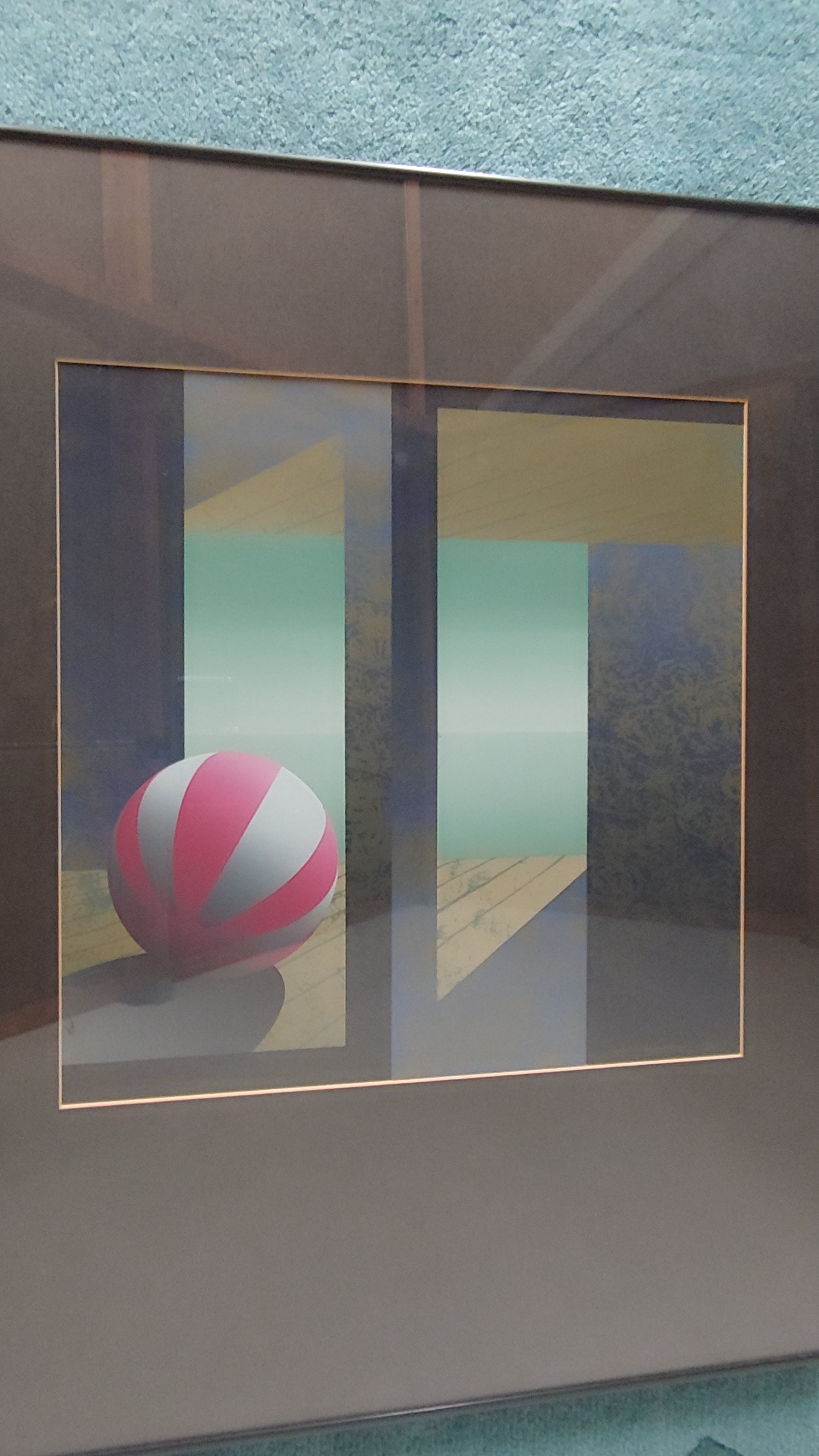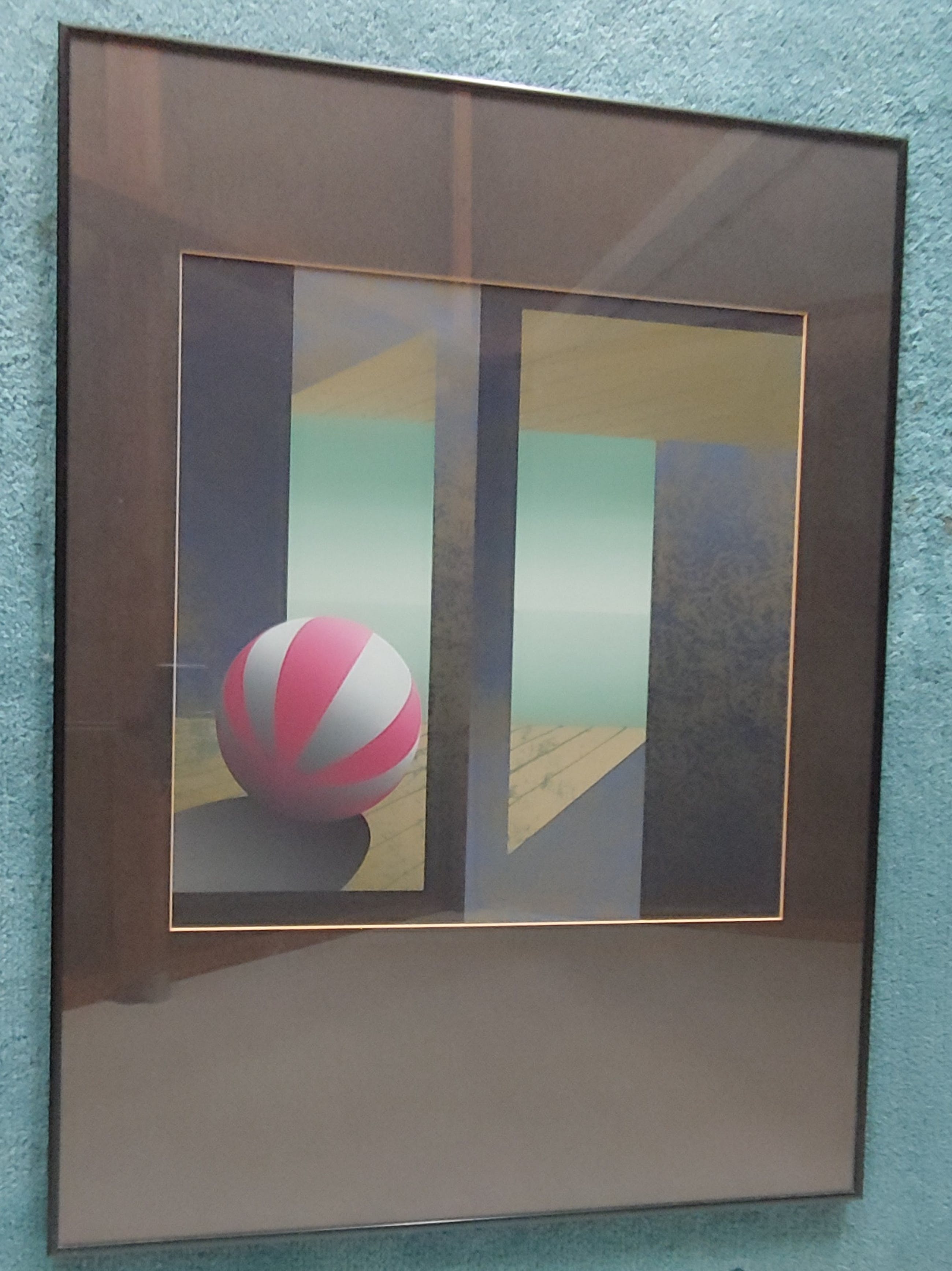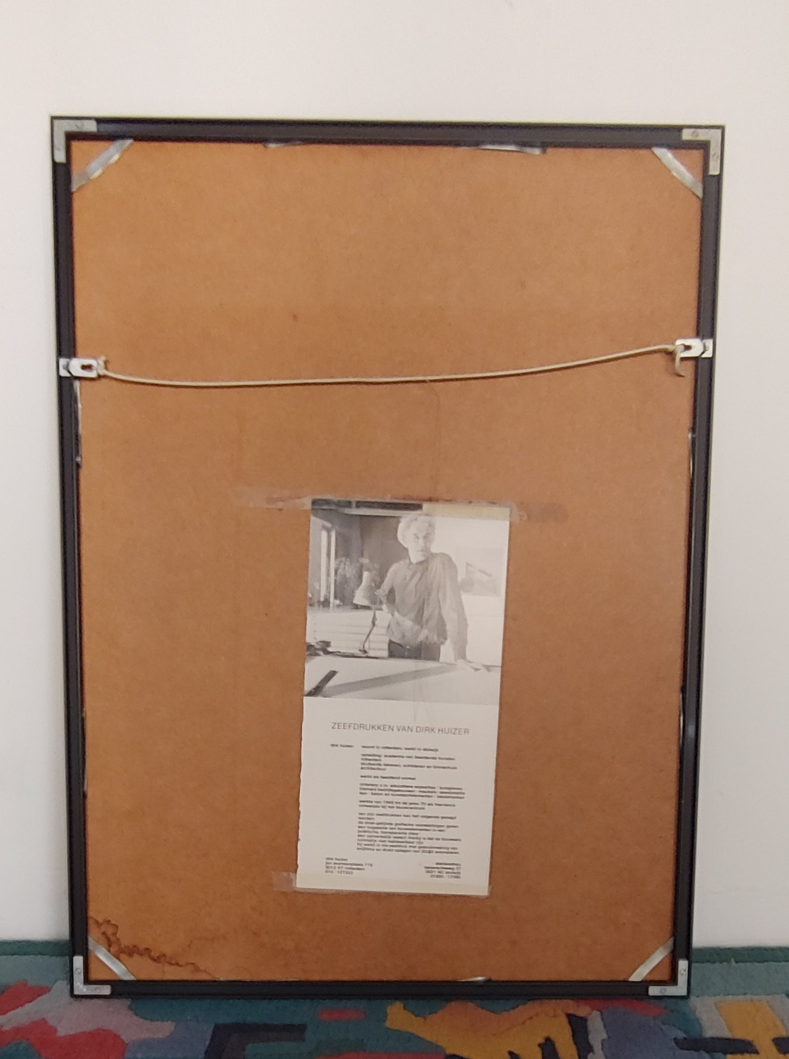 Het werk is met passe-partout achter glas ingelijst (aluminium lijst).