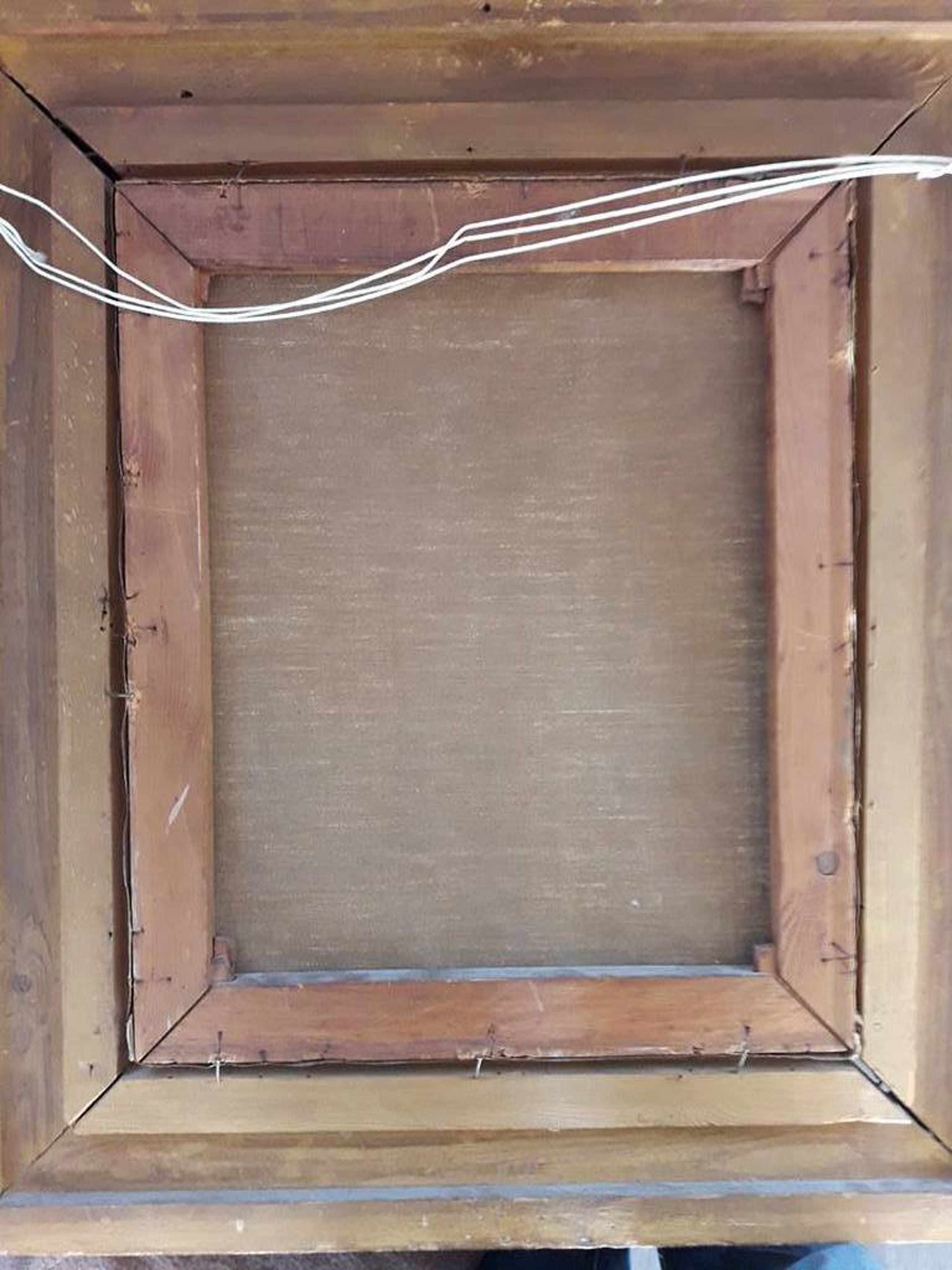 Het doek heeft aan de bovenkant een klein stukje met verfverlies. (zie foto's), en voor het mooie zou het een keer opnieuw gespannen kunnen worden. Het zit in een hele dikke en zware goudkleurige lijst .Afmetingen in de lijst zijn 74 x 65 en het doek alleen is 50 x 40.