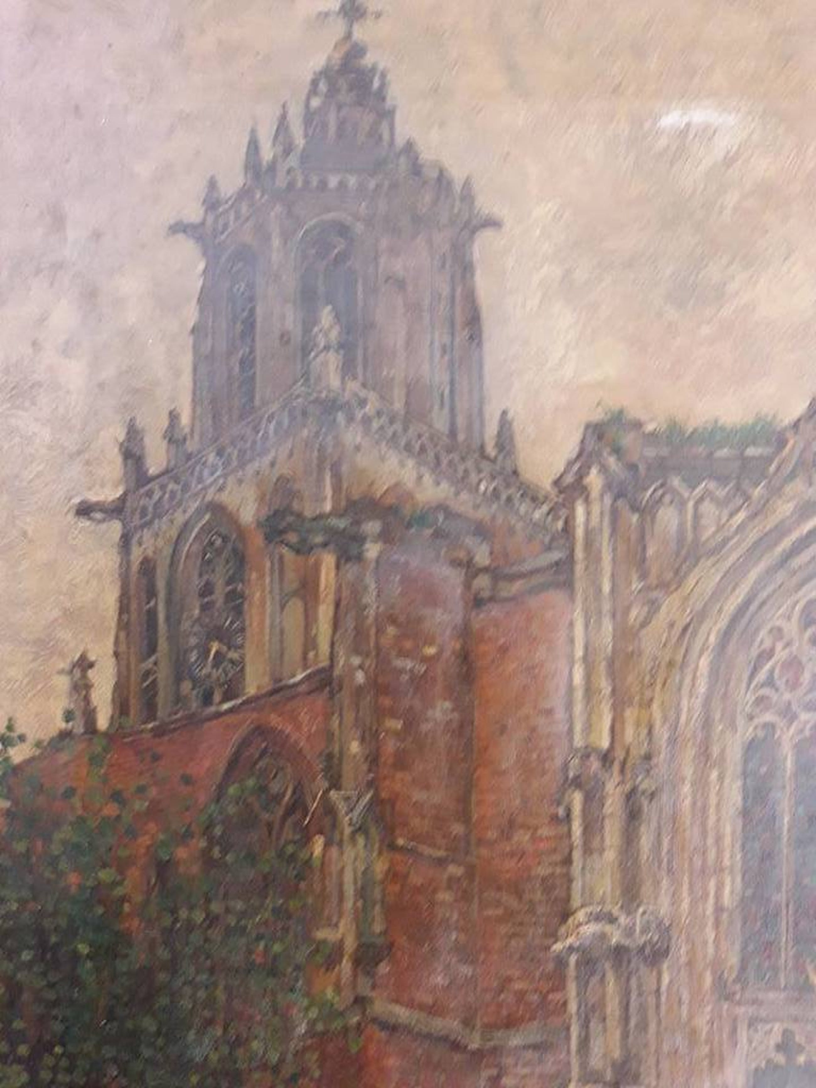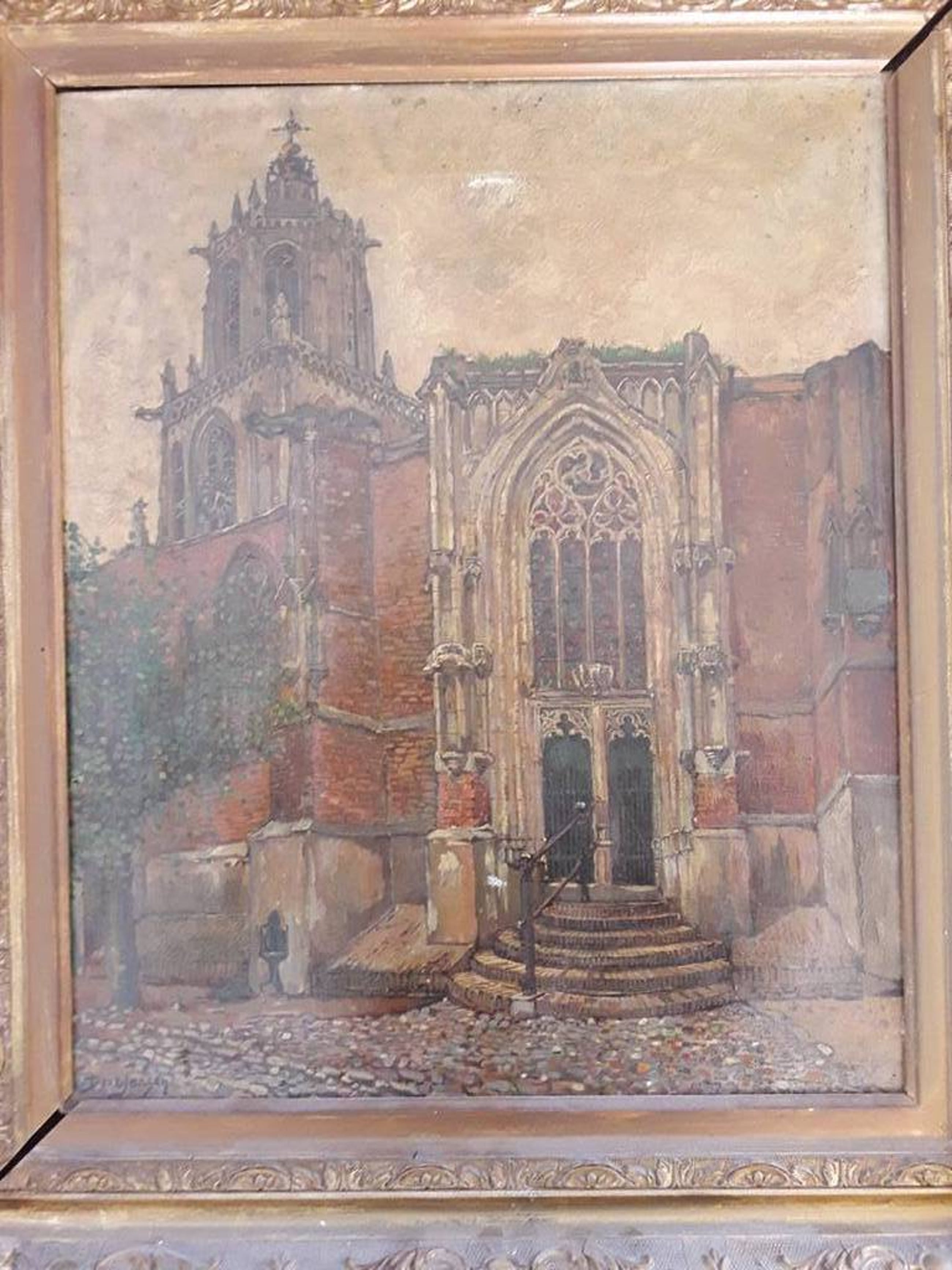 Prachtig klassiek schilderij van Dirk Jansen, geboren in Schoten (gem Haarlem)op 26 juni 1913 en overleden op 22 oktober 1951 in Ede.Hij heeft bijna zijn hele leven gewerkt en gewoond in Haarlem (tot 1950). Deze kerk zal dan ook vast ergens in Haarlem of omstreken staan. In 1950 is hij verhuisd naar Bennekom (gem. Ede). Van beroep was jij reclametekenaar en ook was hij lid van "kunst zij ons doel" in Haarlem.