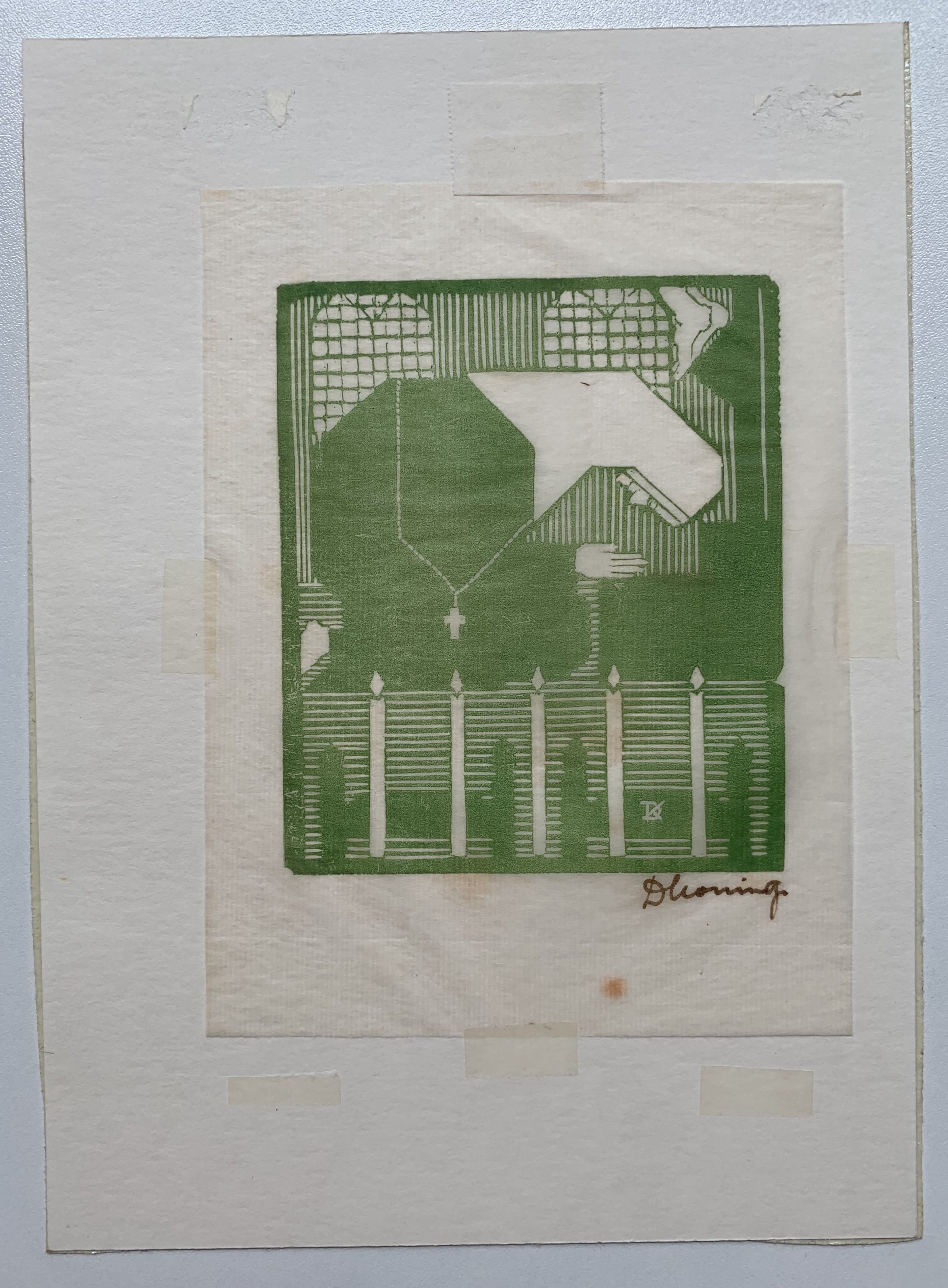 Afdruk op zeer dun (rijst)papier is met stukjes tape gemonteerd op een karton. Onder de afbeelding, in de marge, zit een klein vlekje. Op te lossen met een passe-partout.