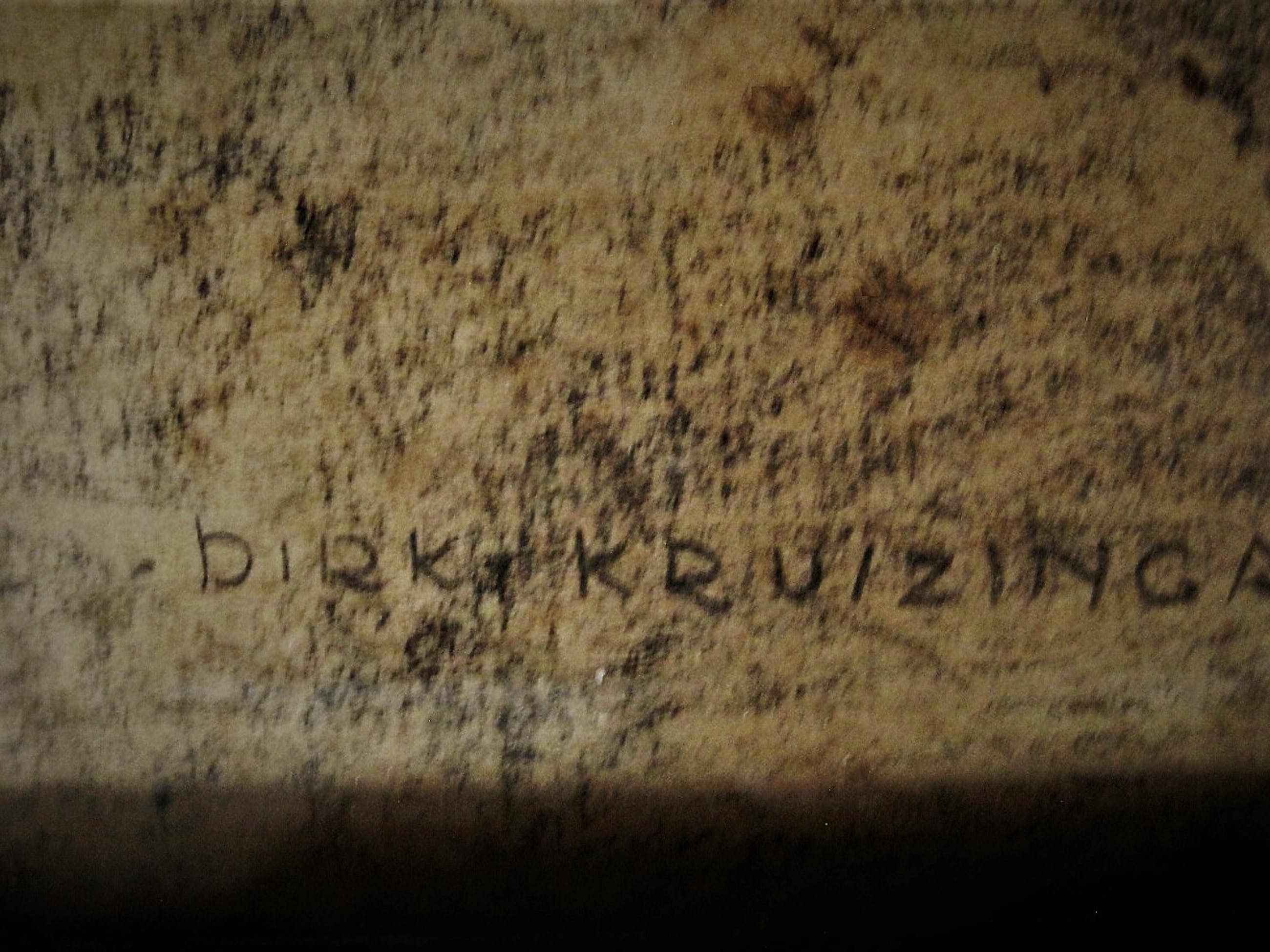 Over de kunstenaar; Een kunsthistoricus noemde in 1939 Dirk Kruizinga een uitzonderlijk talent vanwege zijn bijzondere picturale kwaliteiten. Kruizinga werd in Deventer op 24 november 1895 geboren als zoon van een stukadoor, van wie Dirk waarschijnlijk zijn kunstzinnige aanleg erfde. Na drie jaar HBS kwam Dirk Kruizinga op het atelier en in de schilderswerkplaats van de firma H. G. Bokhorst, waar in die tijd baas Bart en zijn broer Johan de leiding hadden. Tijdens de mobilisatie 1914-1918 vroeg en kreeg hij verlof om aan de Rijksacademie voor Beeldende Kunsten te Den Haag te studeren, terwijl hij later ook nog de akten tekenen MO behaalde. Vervolgens vestigde hij zich als vrij schilder in Amsterdam. Vanuit Amsterdam gaf hij nog een aantal jaren op zaterdagmiddagen les in Deventer aan de middelbare opleiding tekenen. Eveneens heeft hij gedurende een langere periode lesgegeven aan de Avondtekenschool in Deventer. Hier was omstreeks 1915 Gerrit Budde een van zijn leerlingen. Aan deze opleiding had hij in zijn jongensjaren zelf nog les gehad van Bartus Korteling, die hij nog altijd met eerbied en bewondering “de grote meester” noemde.