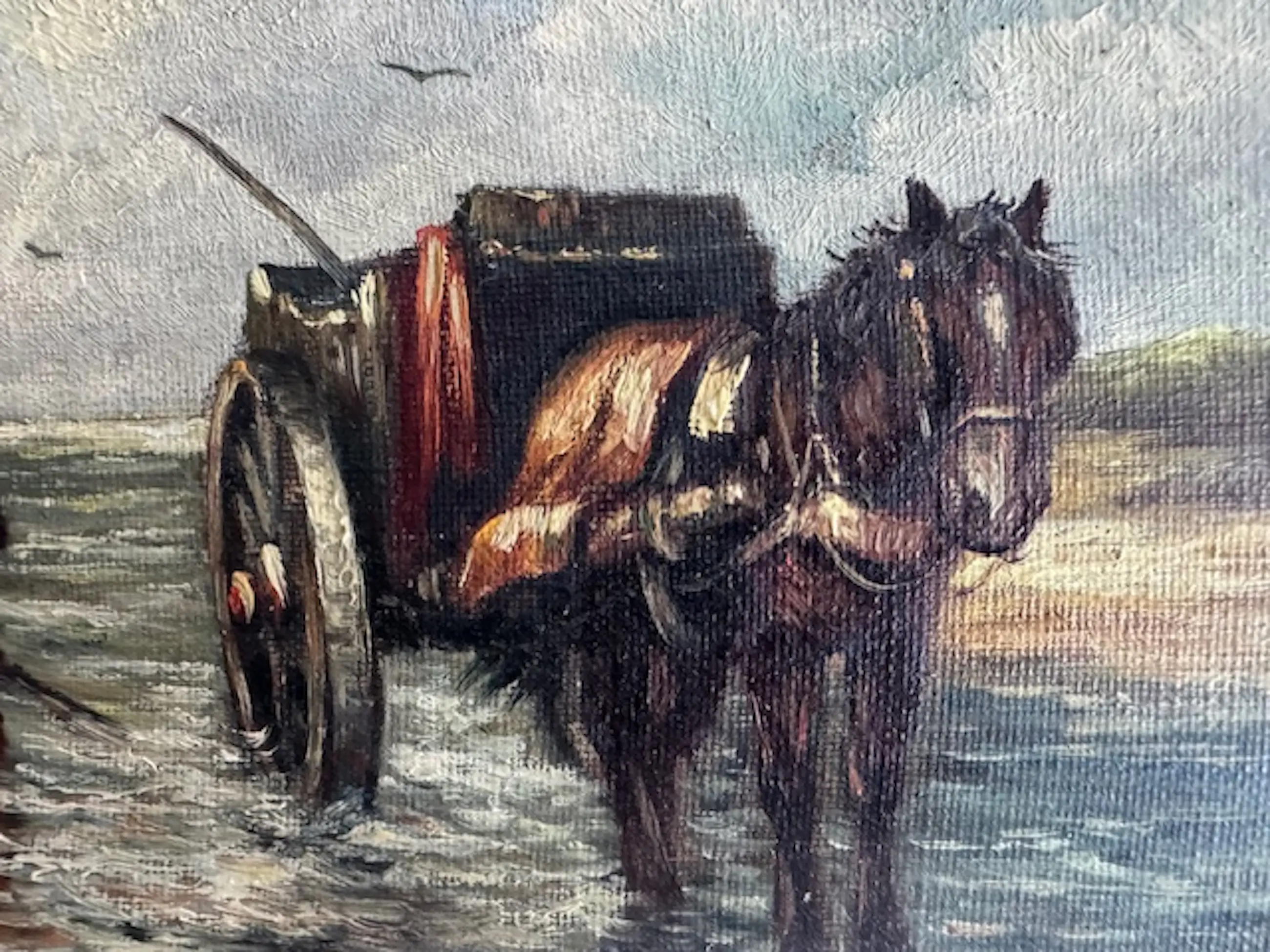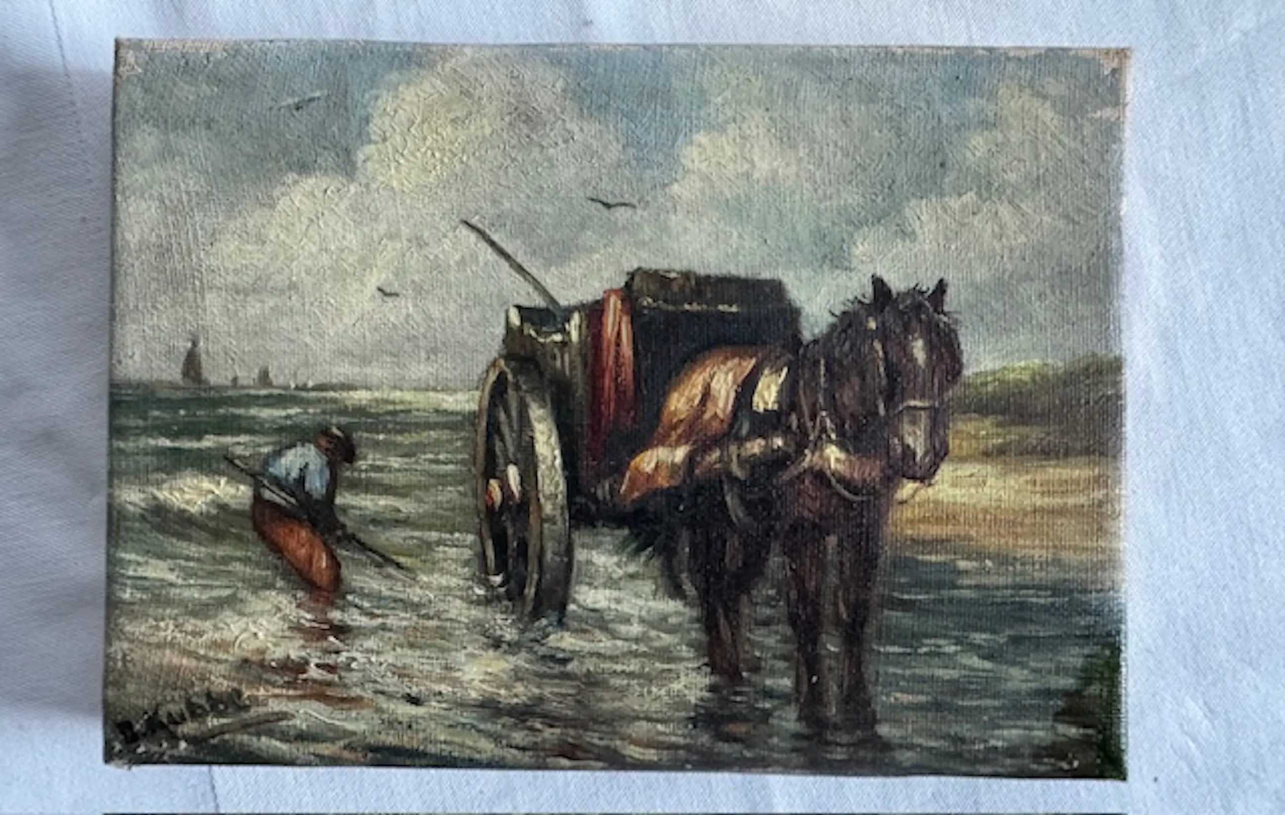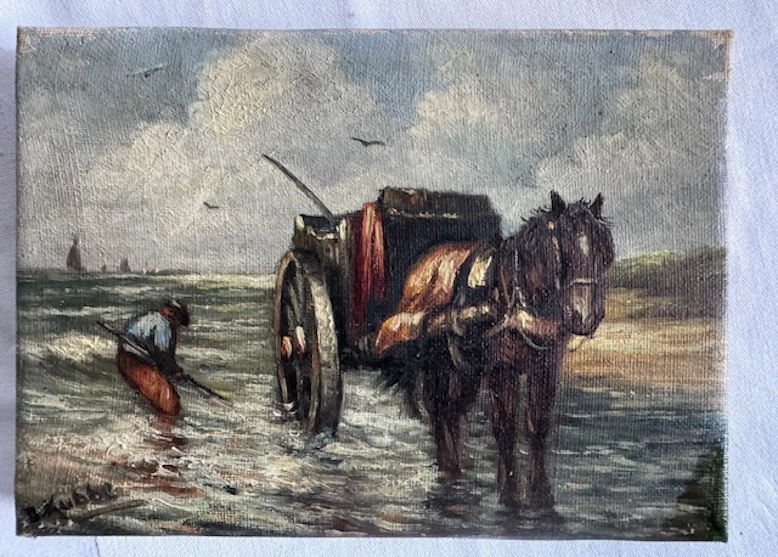 Tafereel met garnalenvisser. Olieverfschilderij op doek. Ietwat slijtage aan randen waar omlijsting zat, maar verder in heel goede staat. Gesigneerd.