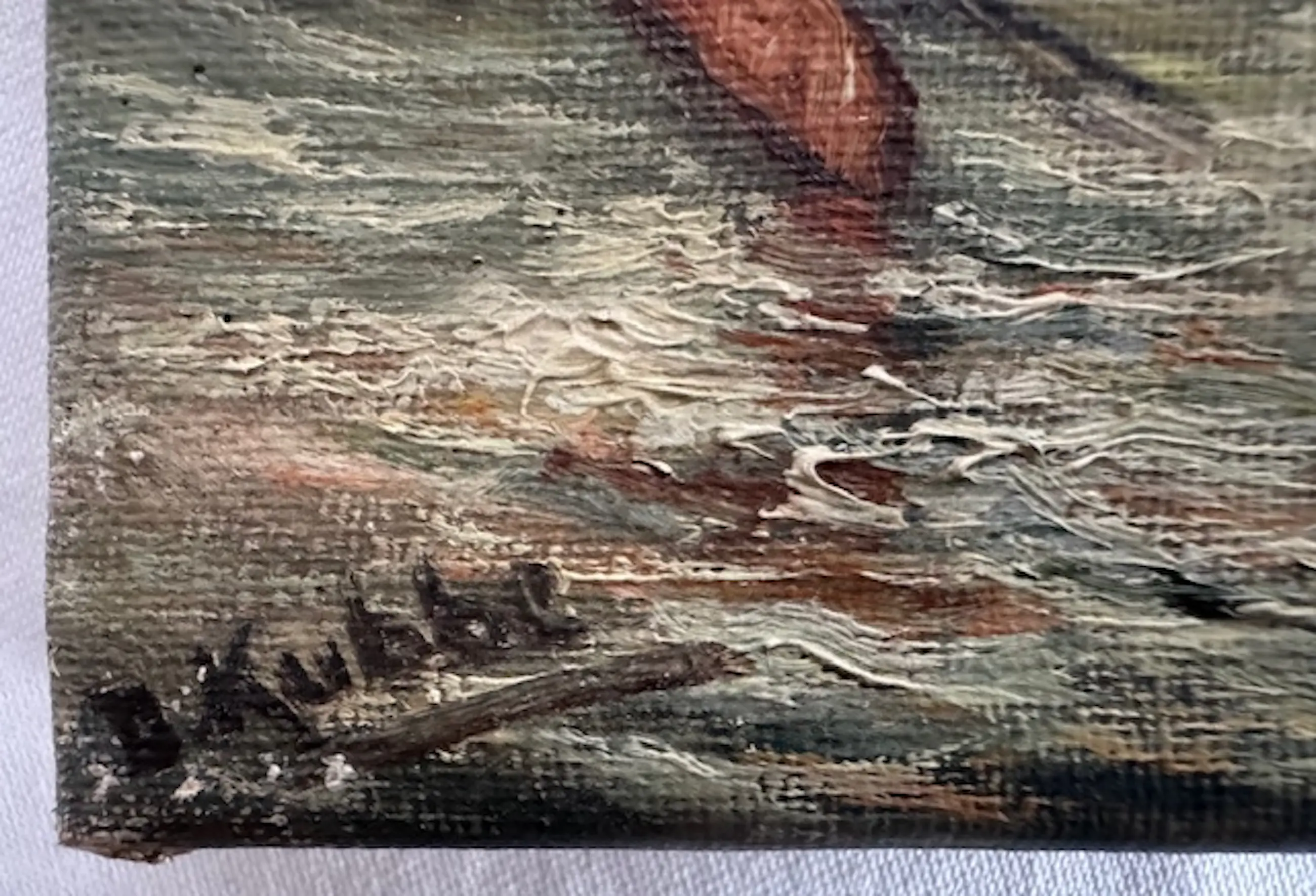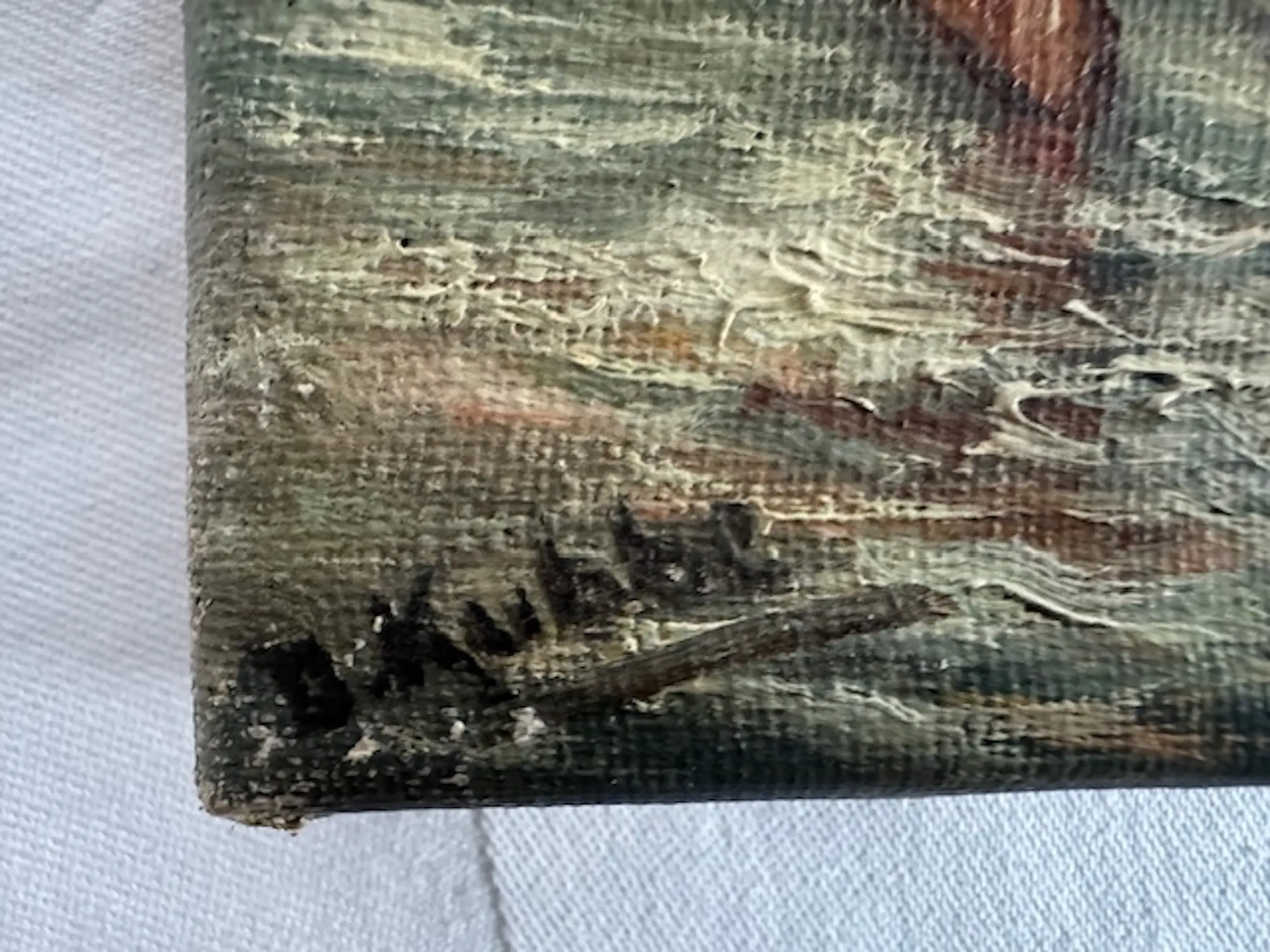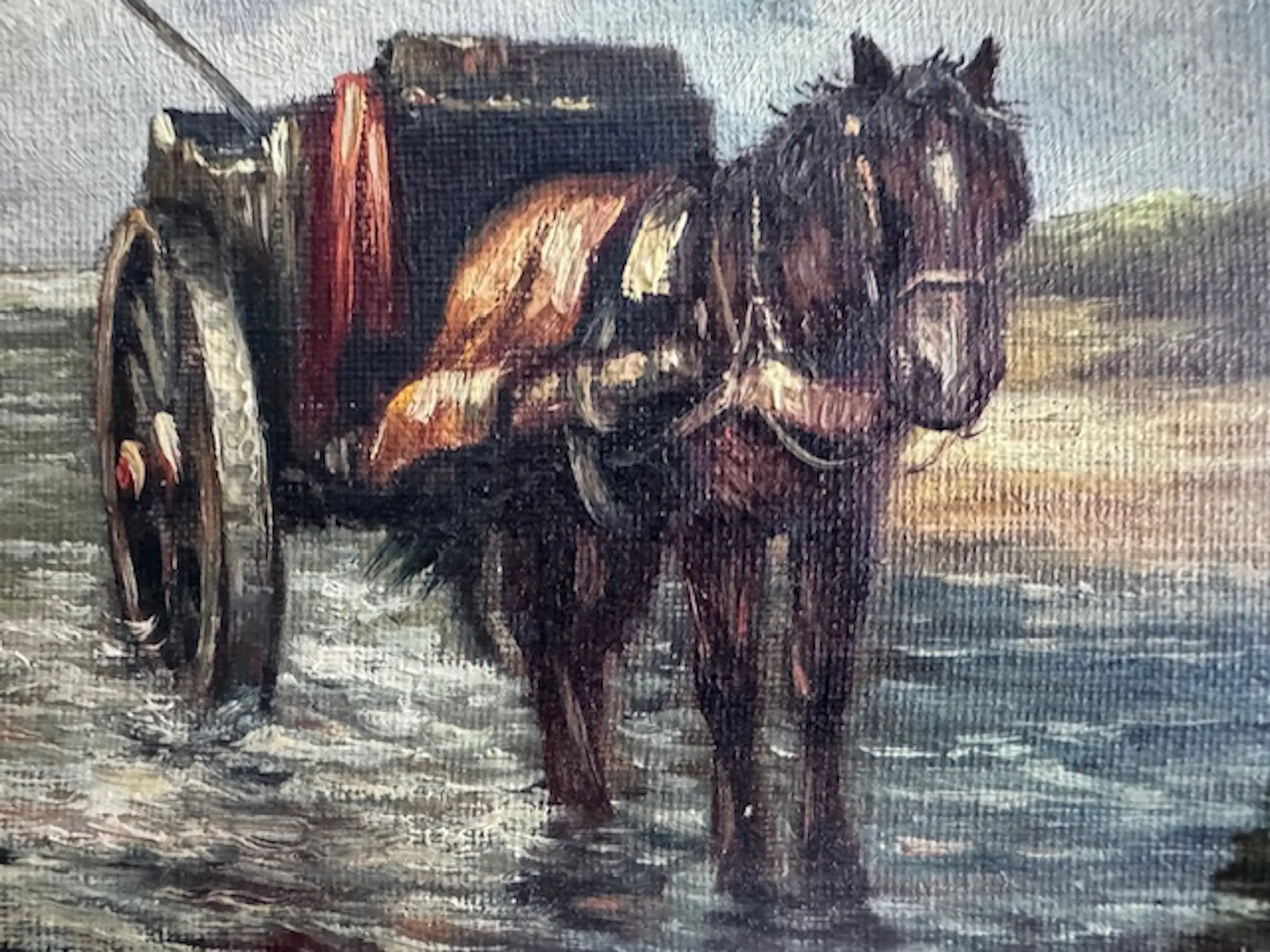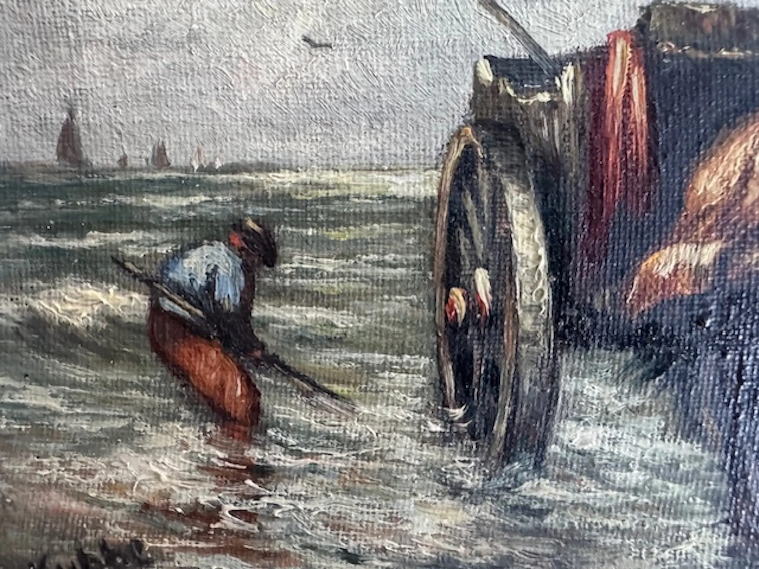 Tafereel met garnalenvisser. Olieverfschilderij op doek. Ietwat slijtage aan randen waar omlijsting zat, maar verder in heel goede staat. Gesigneerd.