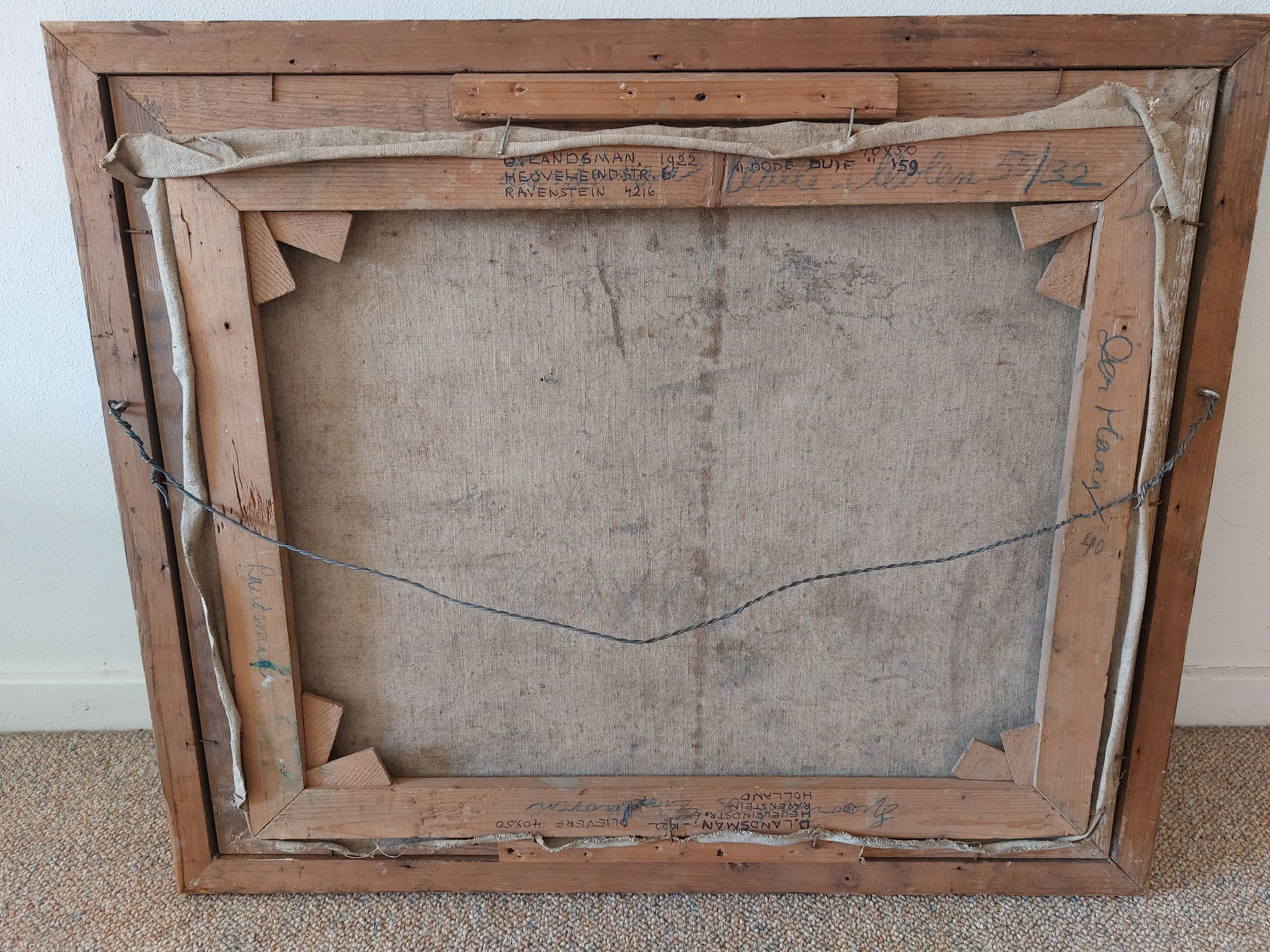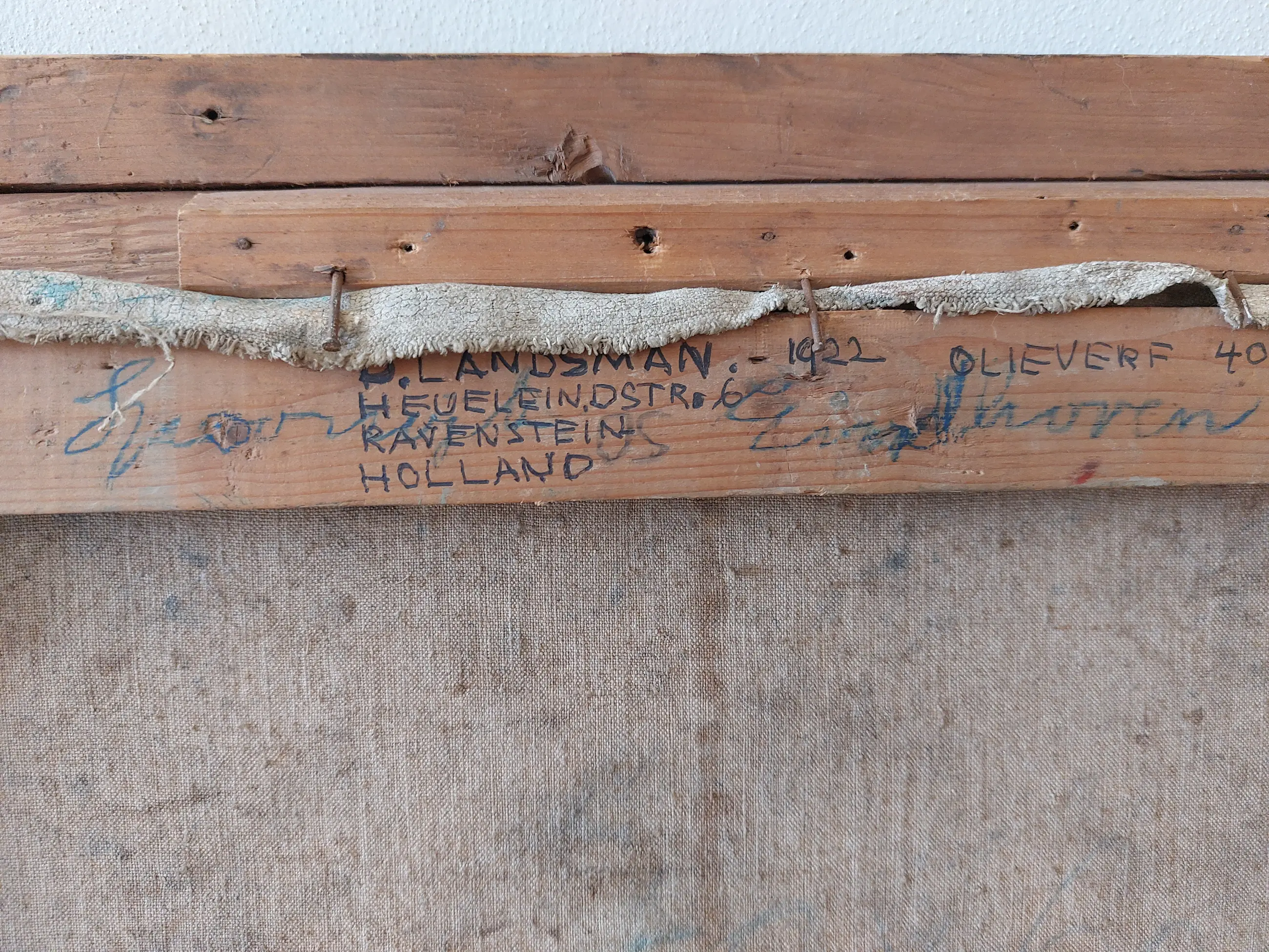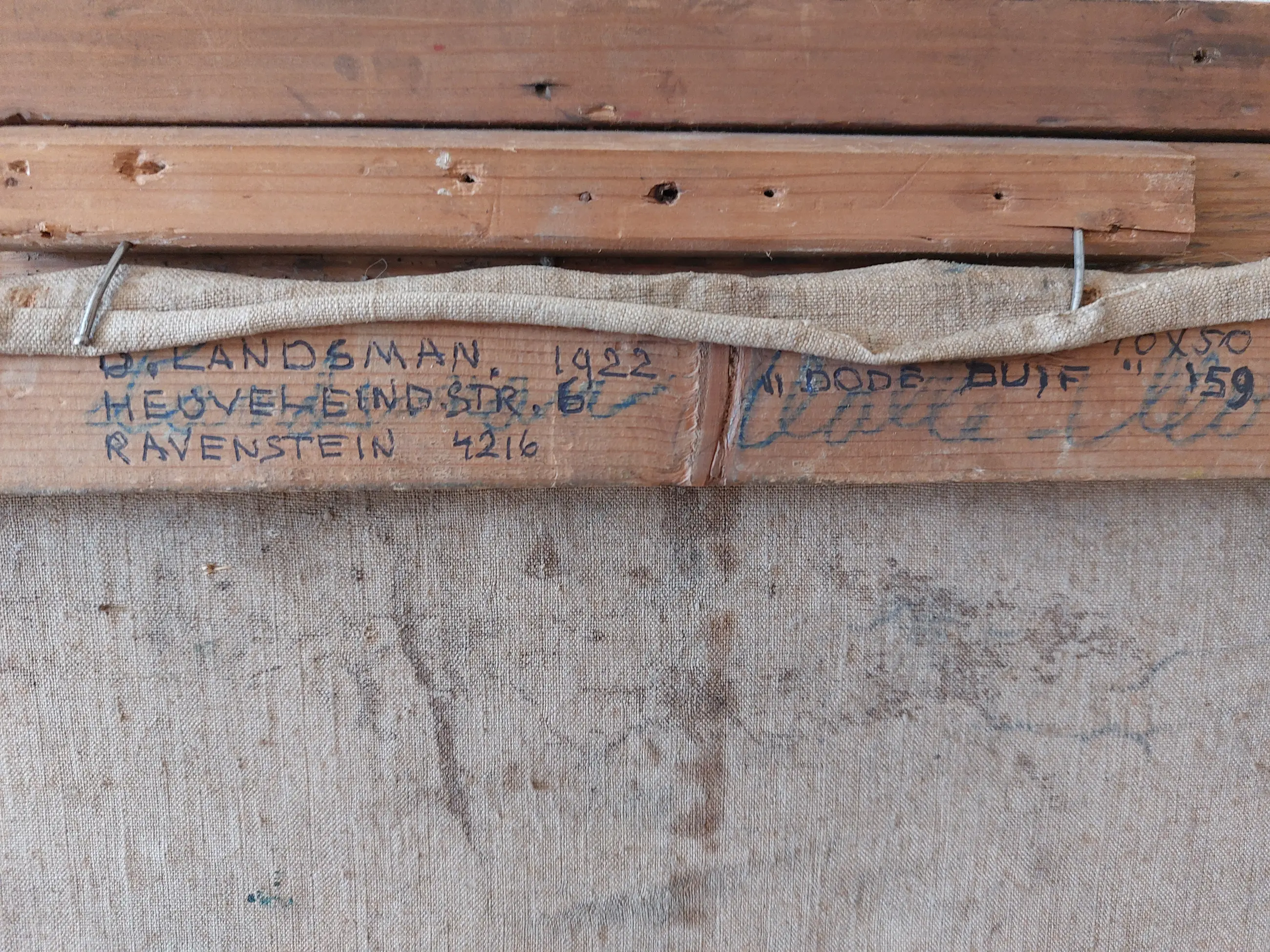 Vanaf 1972 woonde hij afwisselend in Brabant en Frankrijk. Dick Landsman beperkte zich tot het schilderen van landschap, stadsgezicht, interieur en stilleven in de techniek van olieverf en gouache. Naast schilderen was Dick Landsman componist en dichter. Ingelijst in eenvoudige houten lijst. Ziet er wat slordig uit.