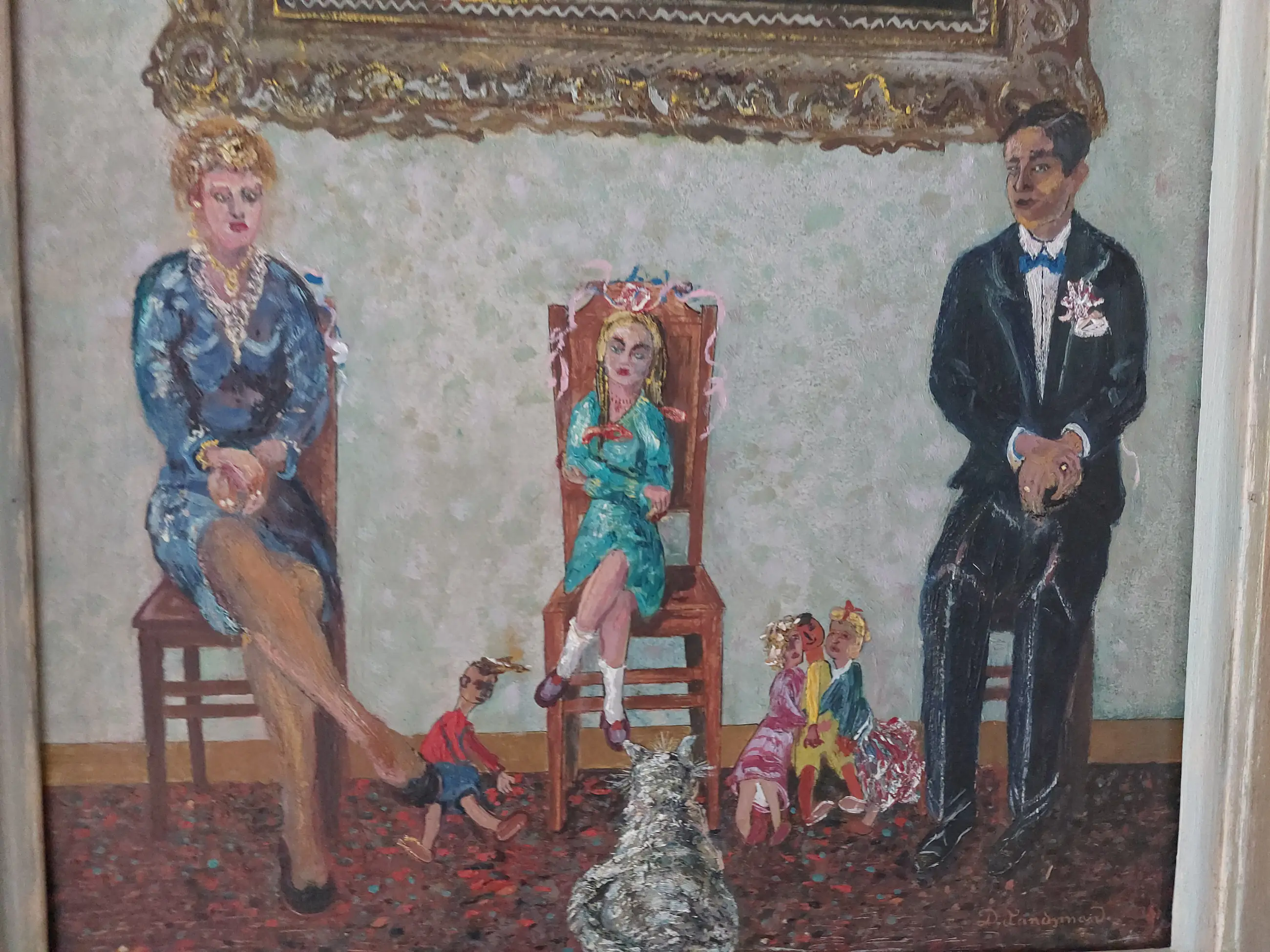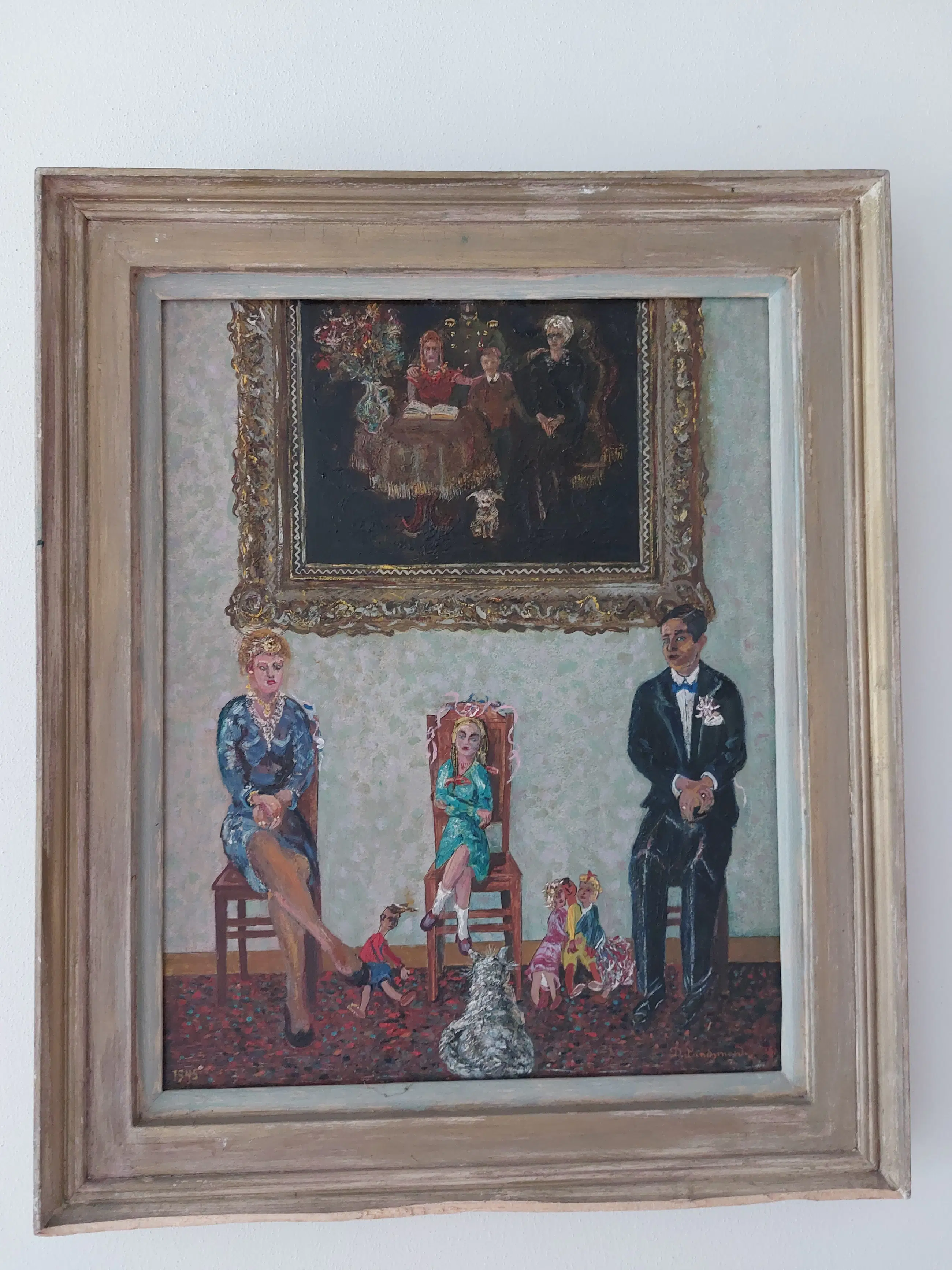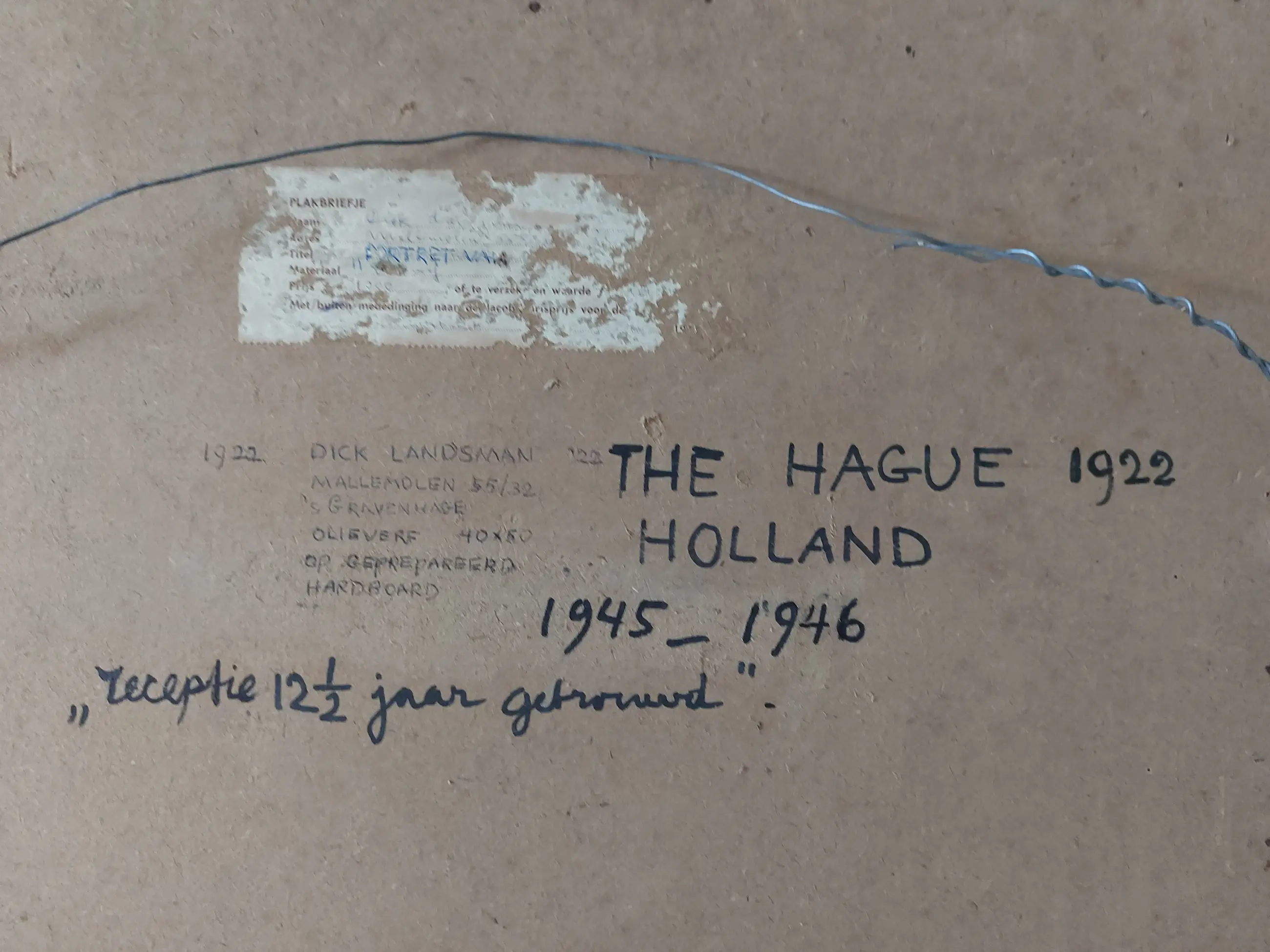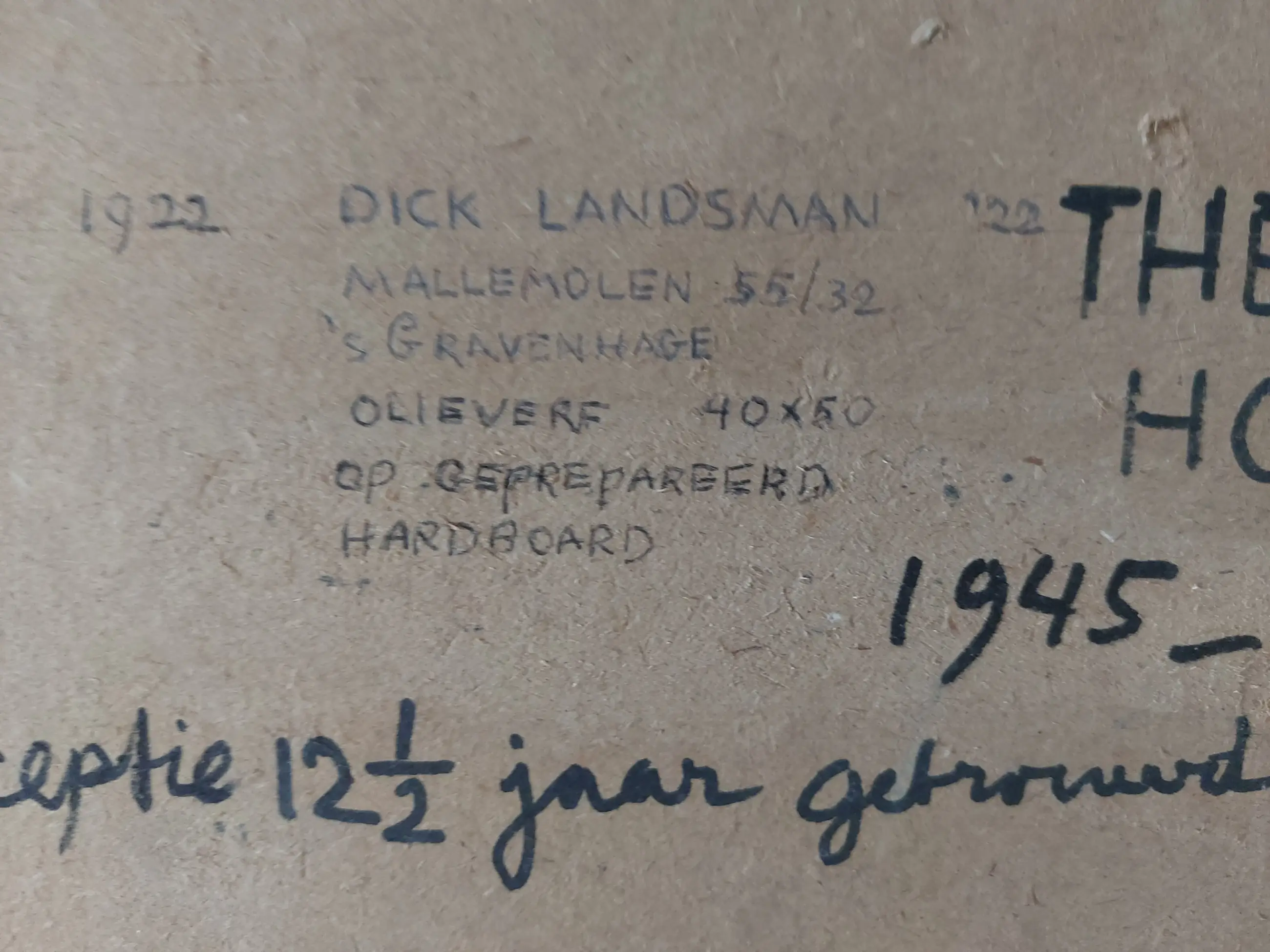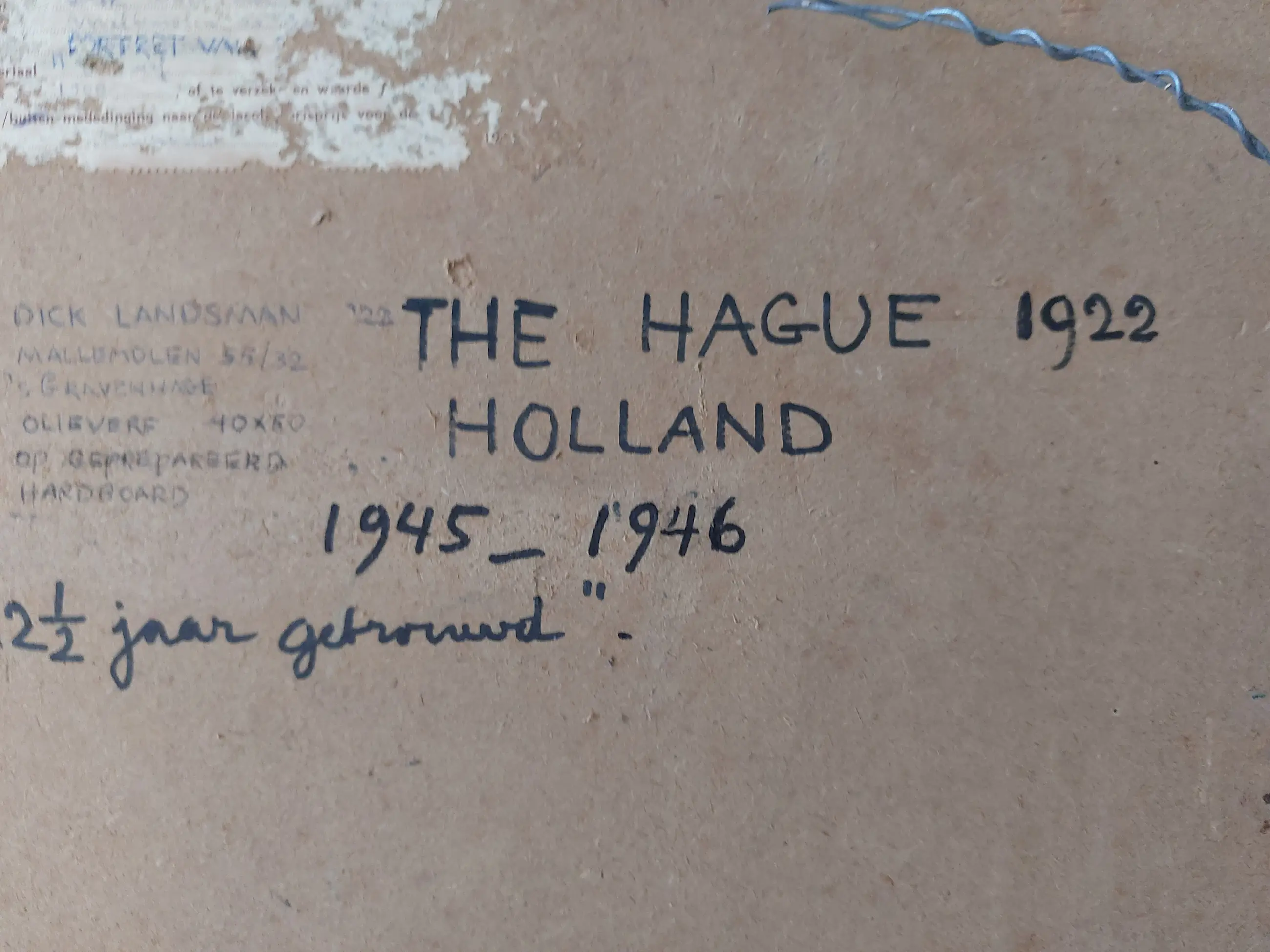 Mooi schilderij van Dirk Landsman. De vermelde titel is door de op de achterzijde van het schilderij vermeld. Het schilderij is gemaakt in de periode dat hij woonde in 'de Mallemolen' in Den Haag. Het is geschilderd op geprepareerd hardboard. Schilderij is in goede staat. De lijst is bij de onderste rand beschadigd (afgeschaafd).
