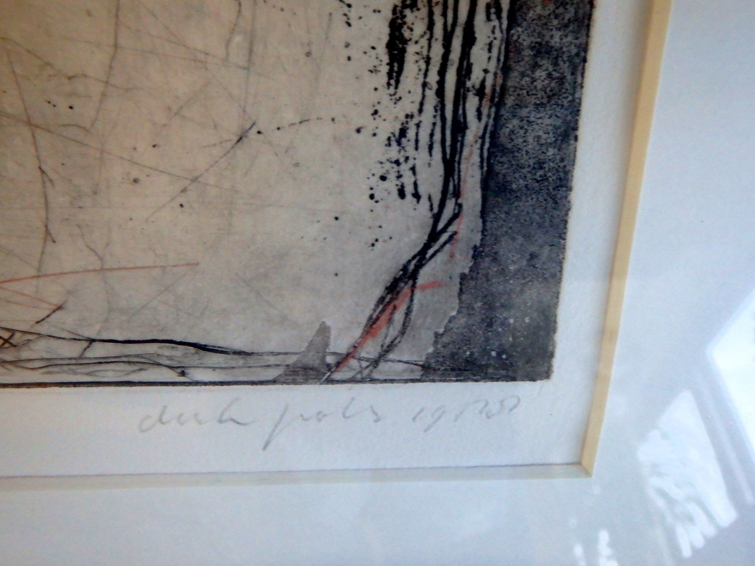 (kleur) ets 22x32, rechtsonder met potlood gesigneerd dirk pols, gedateerd 1988 en linksonder genummerd 3/12, mooi ingelijst achter glas en in aluminiumlijst.