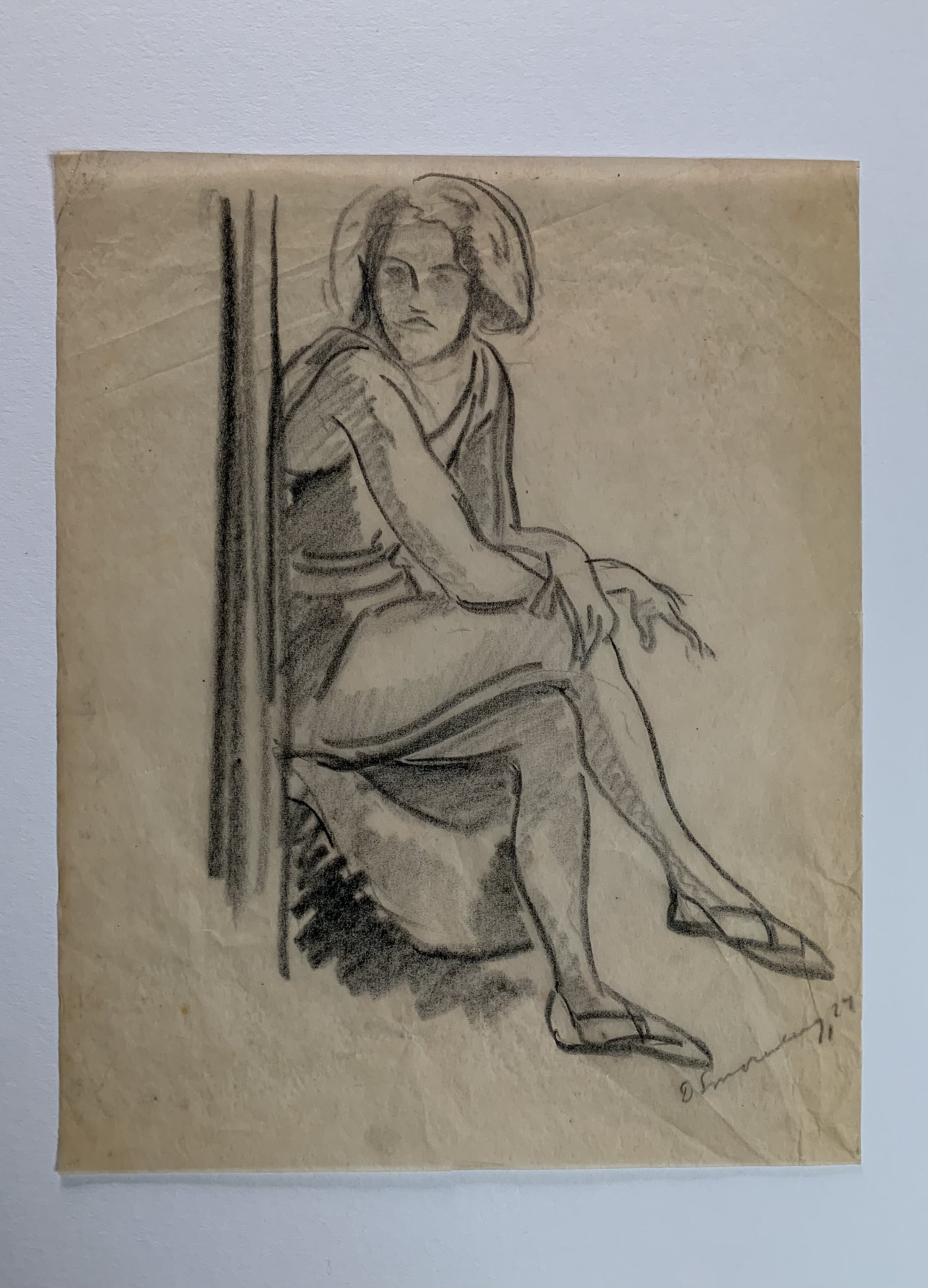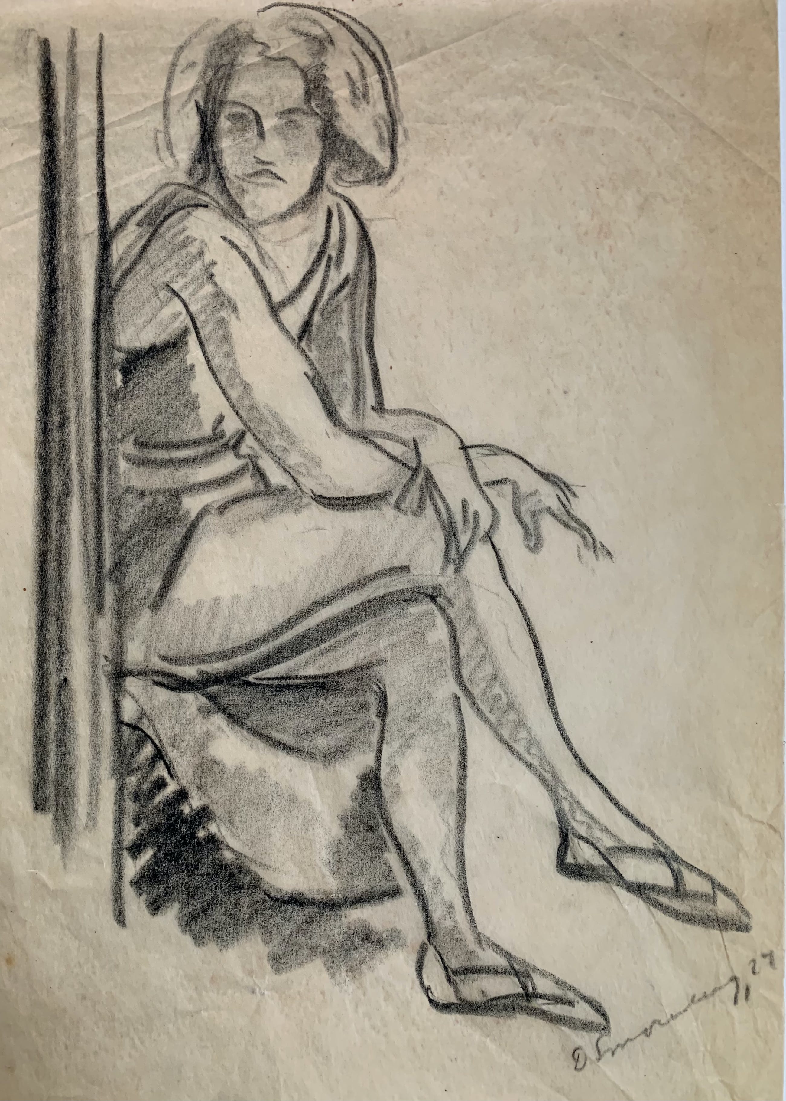 Deze fraaie tekening in houtskool van een zittende vrouw (mogelijk een danseres) is gesigneerd D. Smorenberg ‘27.