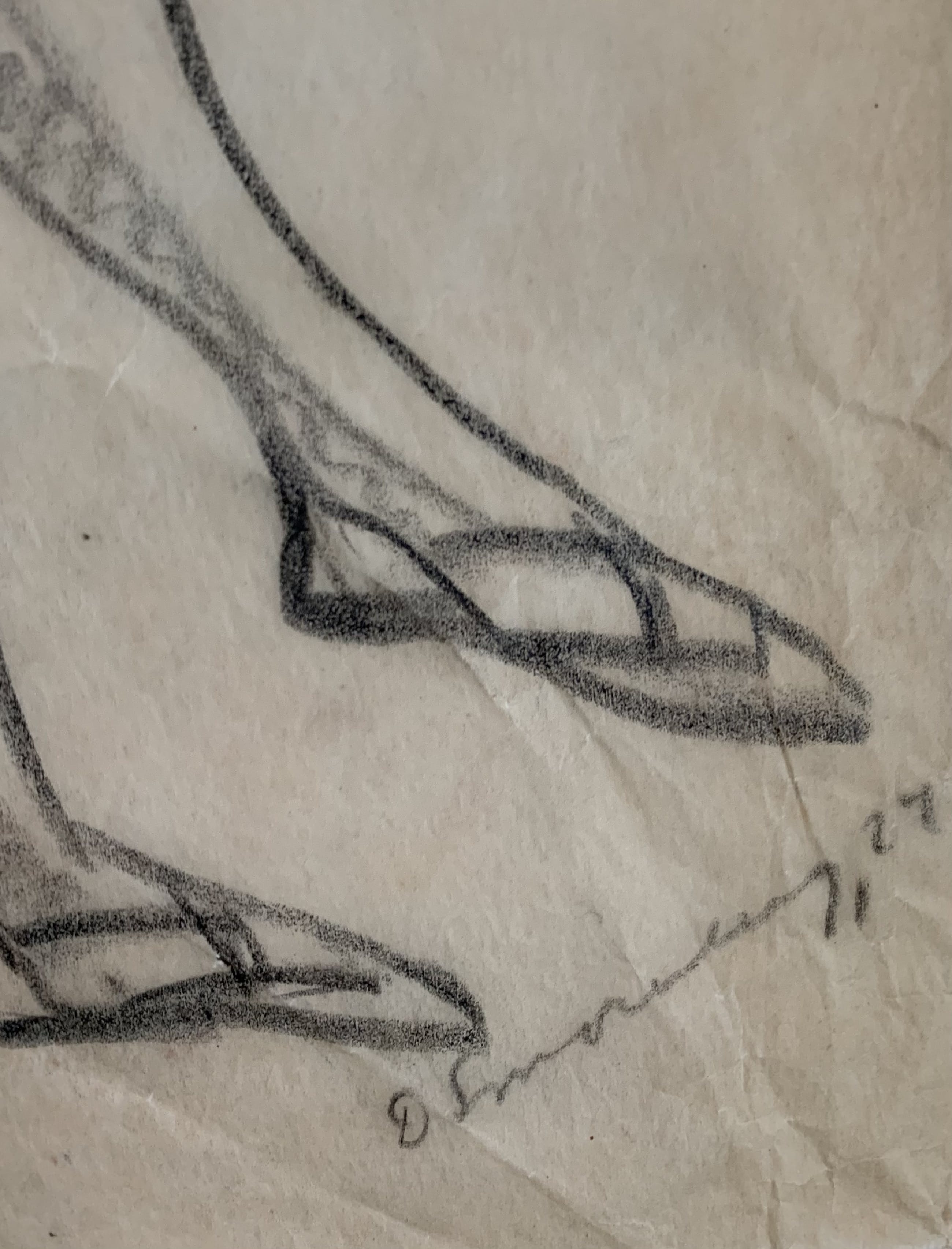 De tekening is gemaakt op calque papier en vertoont een wat gerimpeld oppervlak, wat niets af doet aan de afbeelding of de kwaliteit van deze vlotte schets.