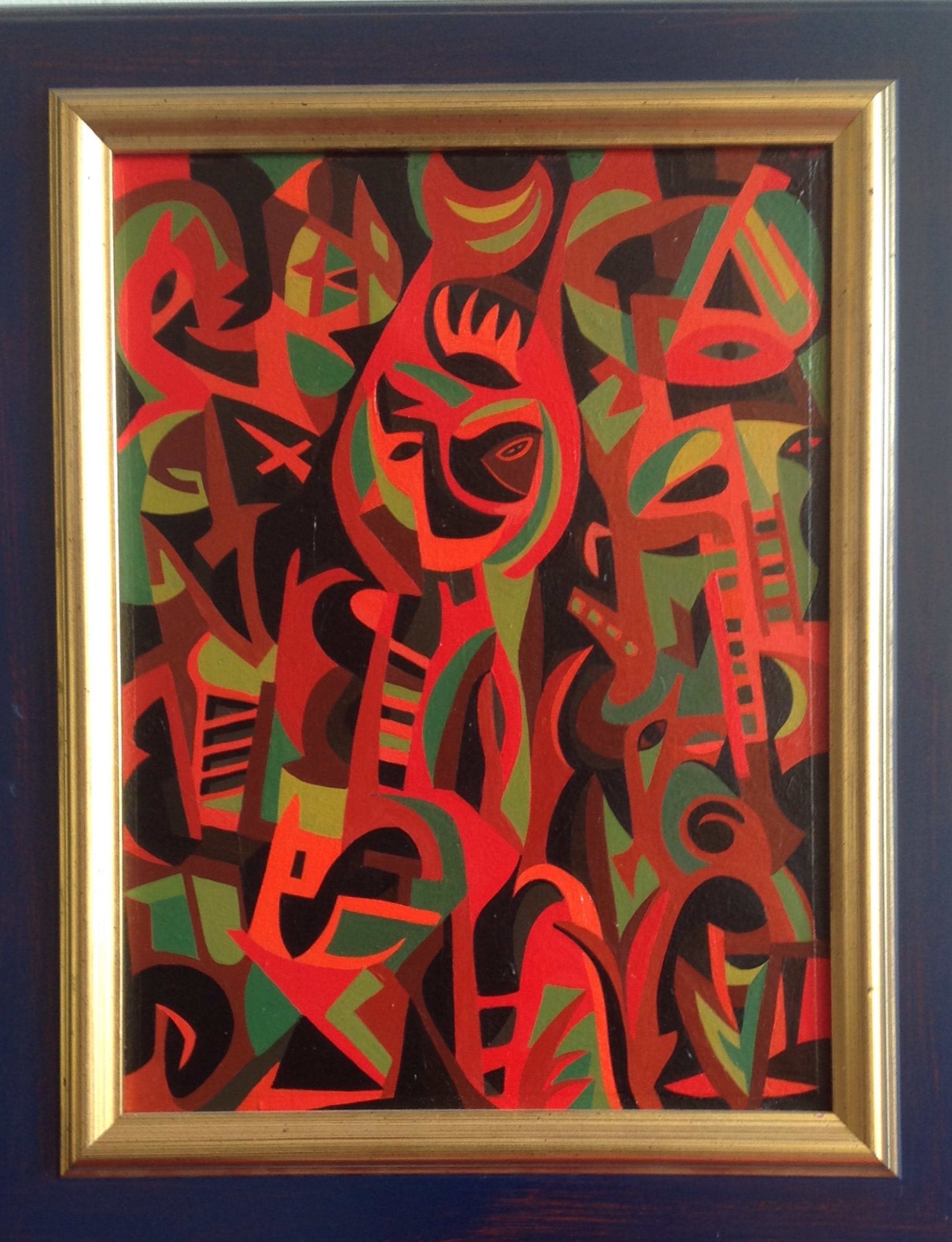 Een olieverf schilderij geïnspireerd op Afrikaanse vormgeving,met maskerachtige figuren.