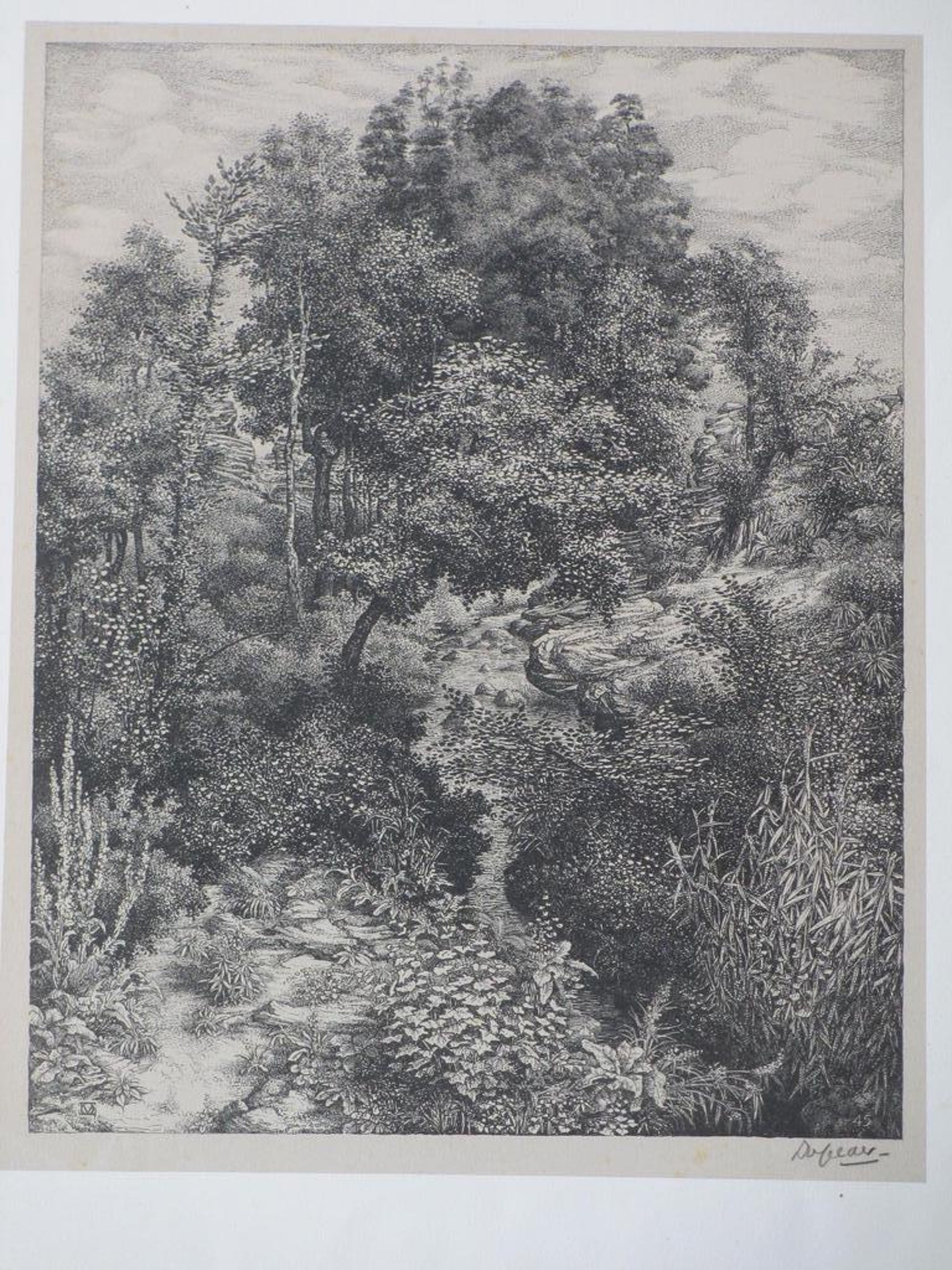 Voorstelling van een (duin)bos met een stroompje en vele vegetatie.