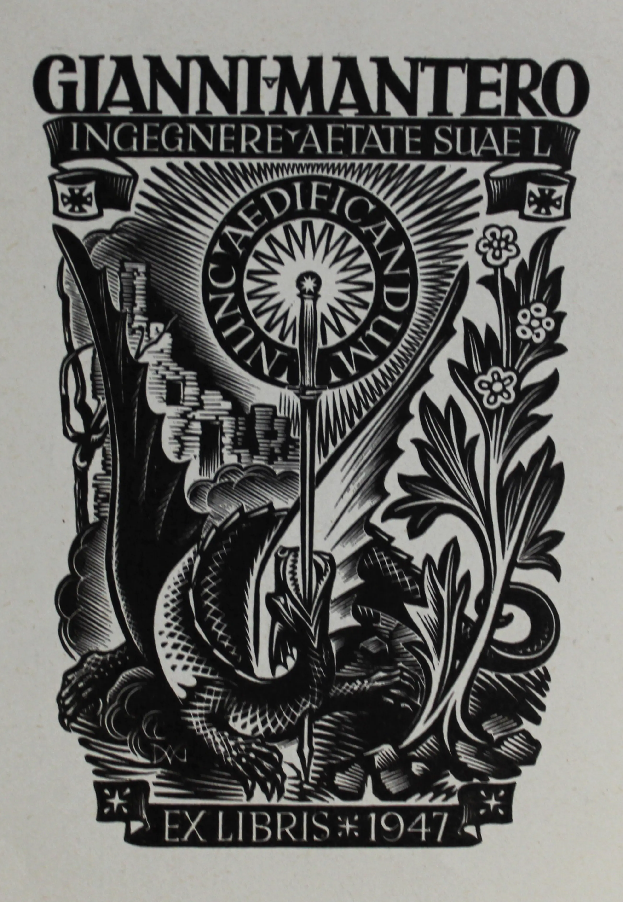 4: Ex Libris Gianni Mantero: Beeldmaat: 8 x 5,5 cm. Bladmaat: 10,5 x 8 cm.