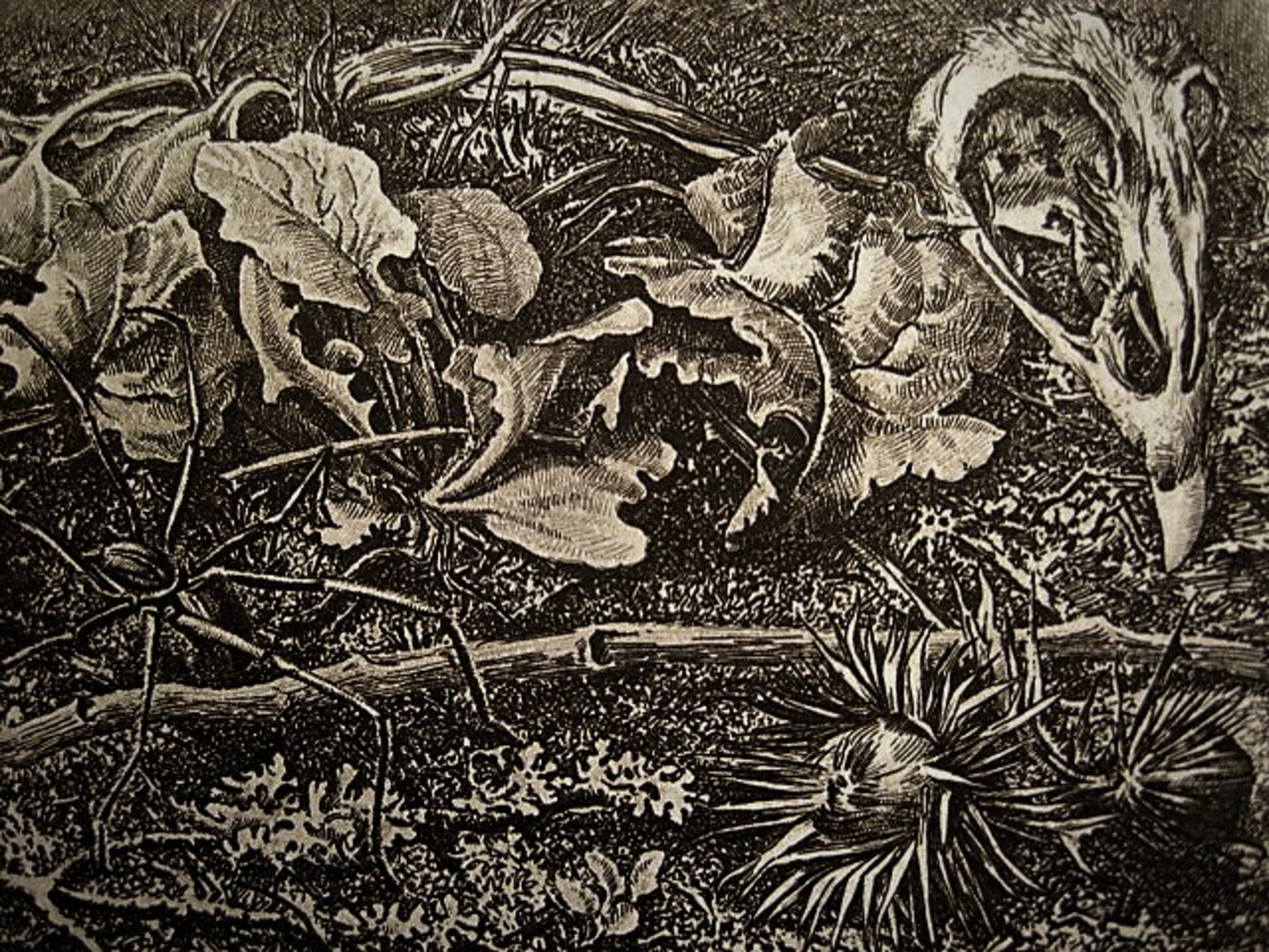 tuingrond met vruchten, dierschedels of dode vogels. Maar ook maakt hij
