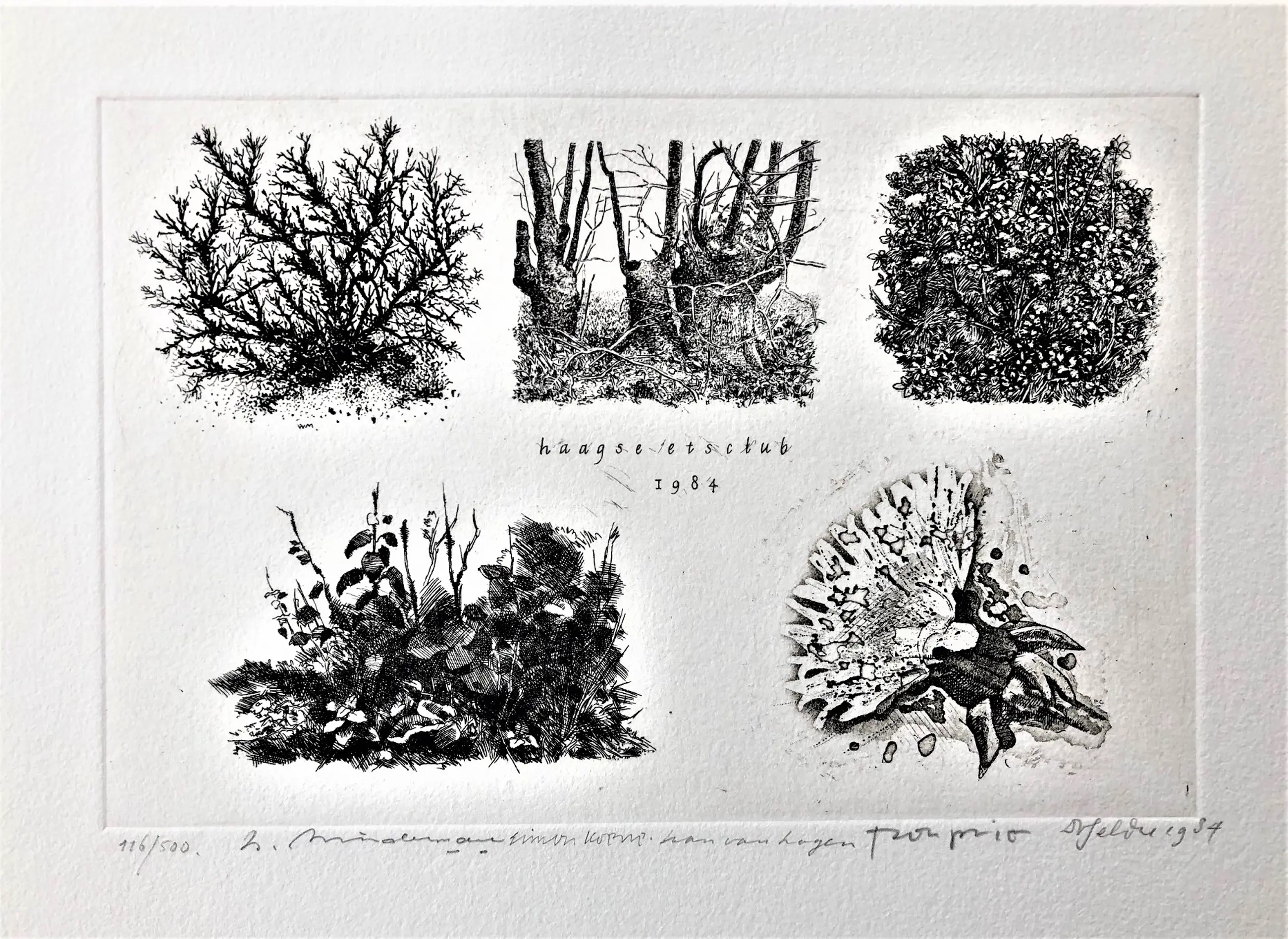 Onder de prent met potlood gesigneerd: Willem Minderman, Simon Koene, Han van Hagen, Fred Couprie, Dirk van Gelder 1984