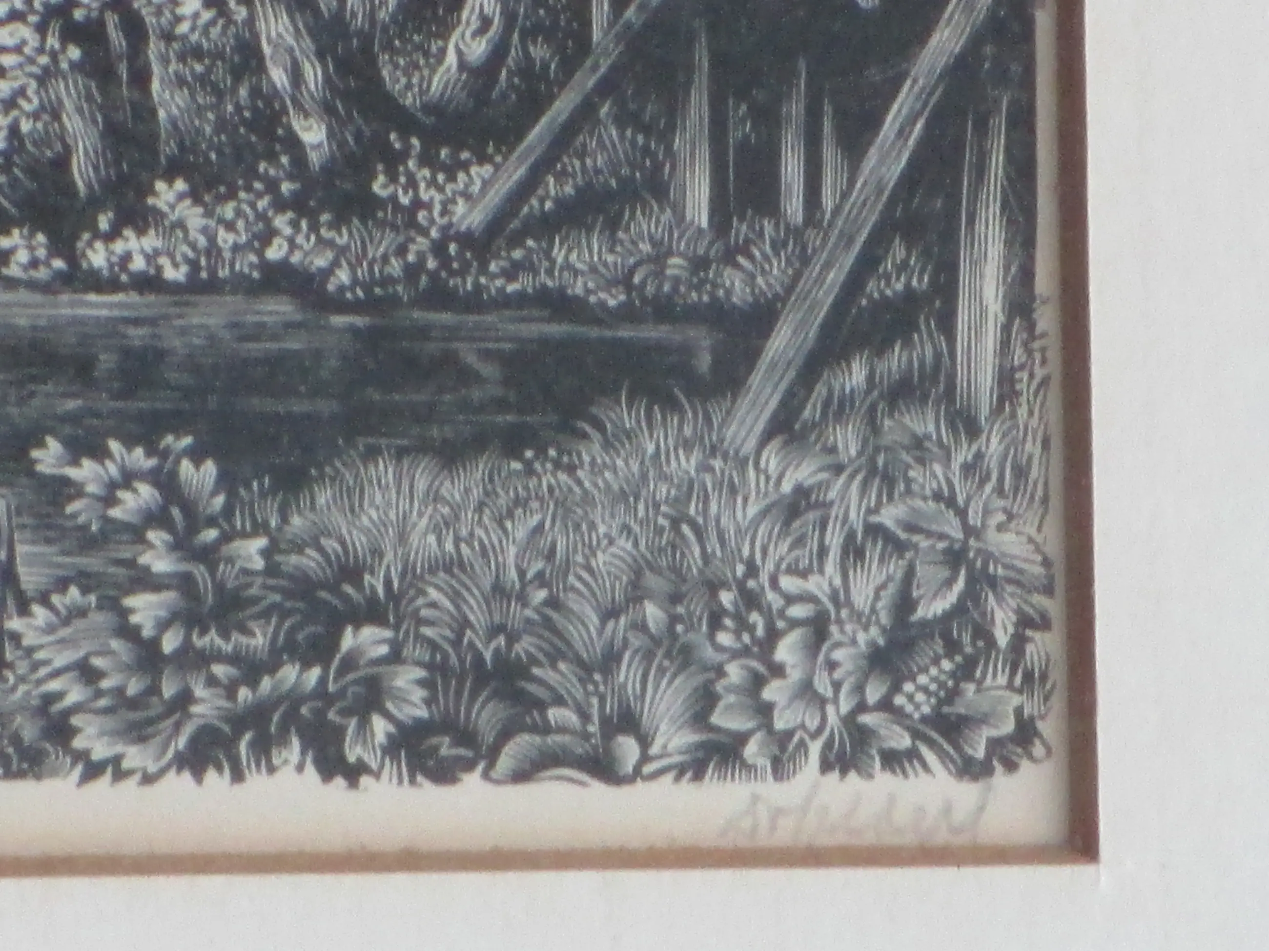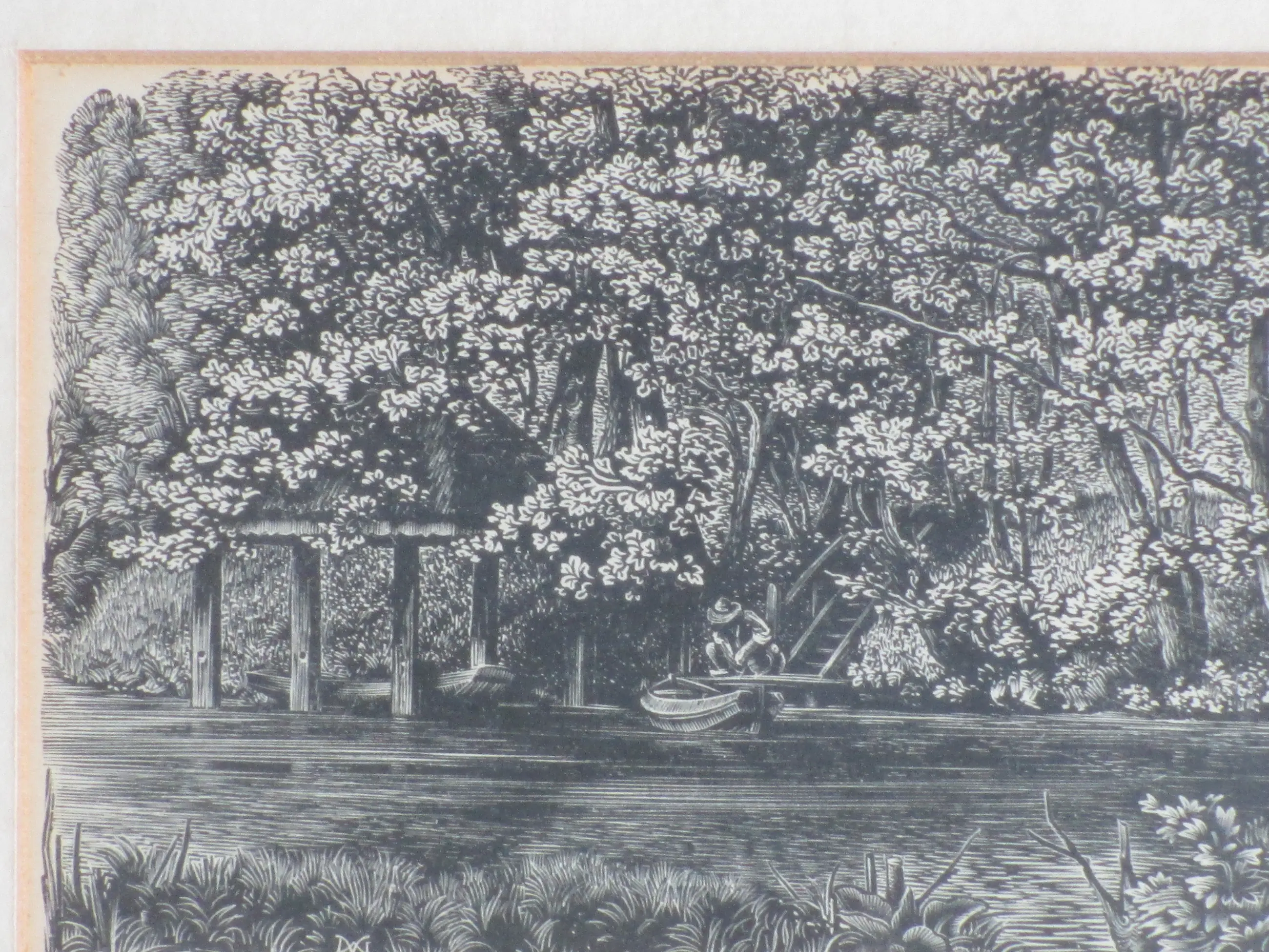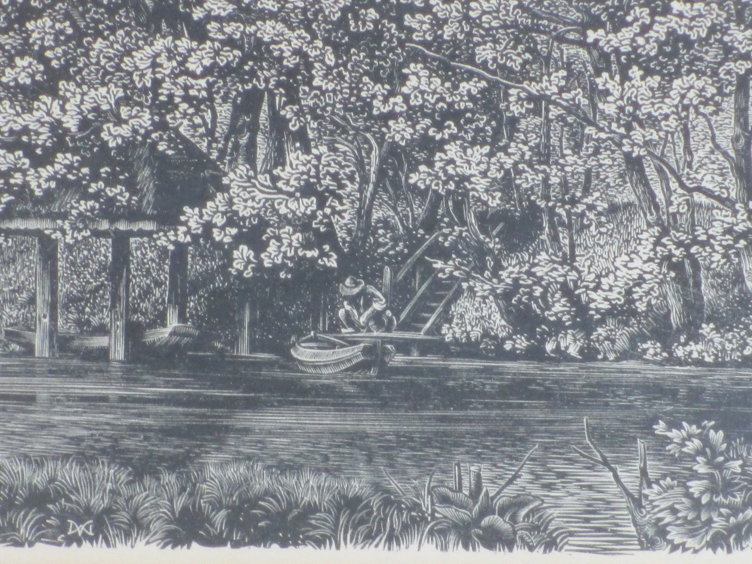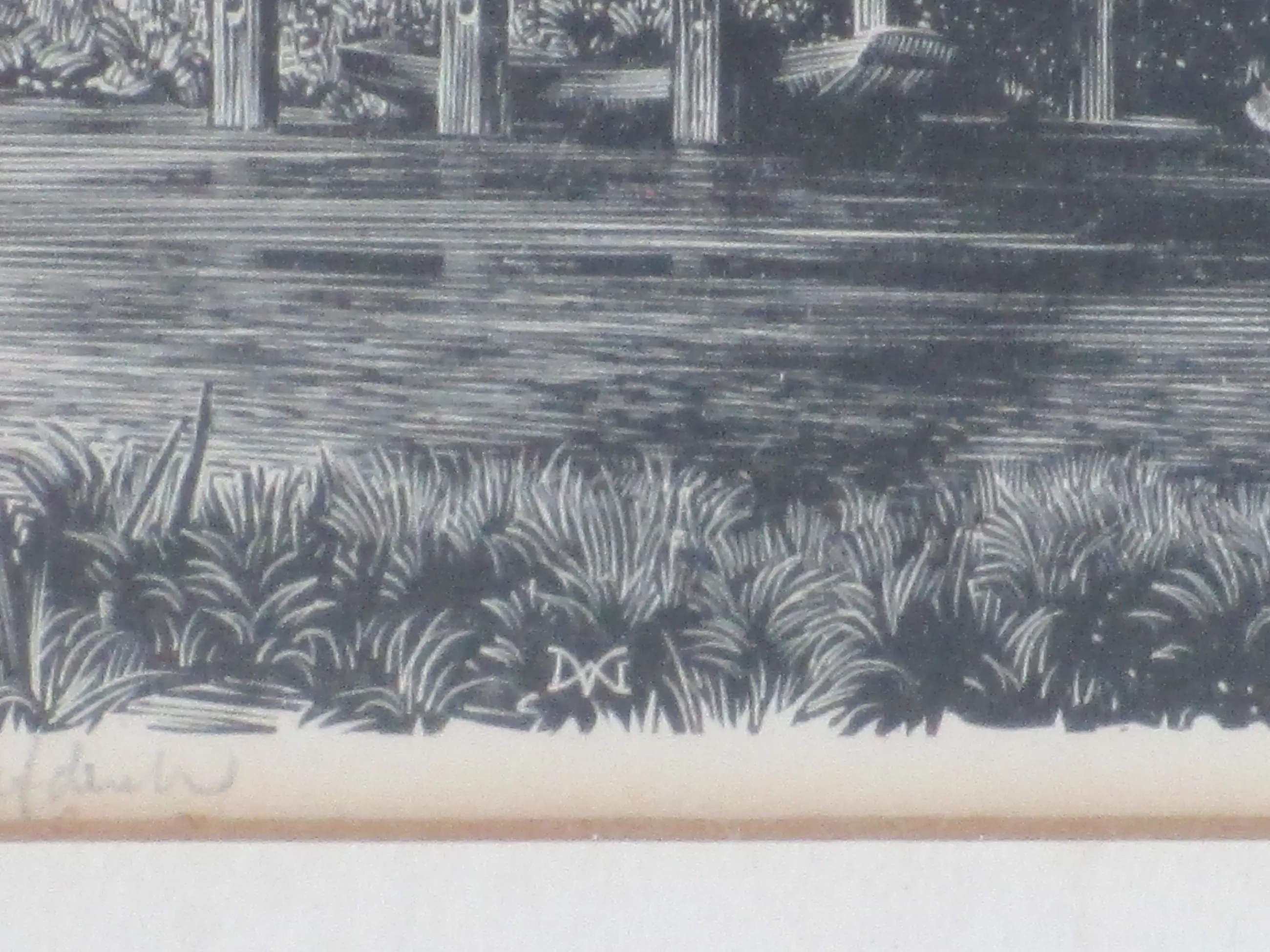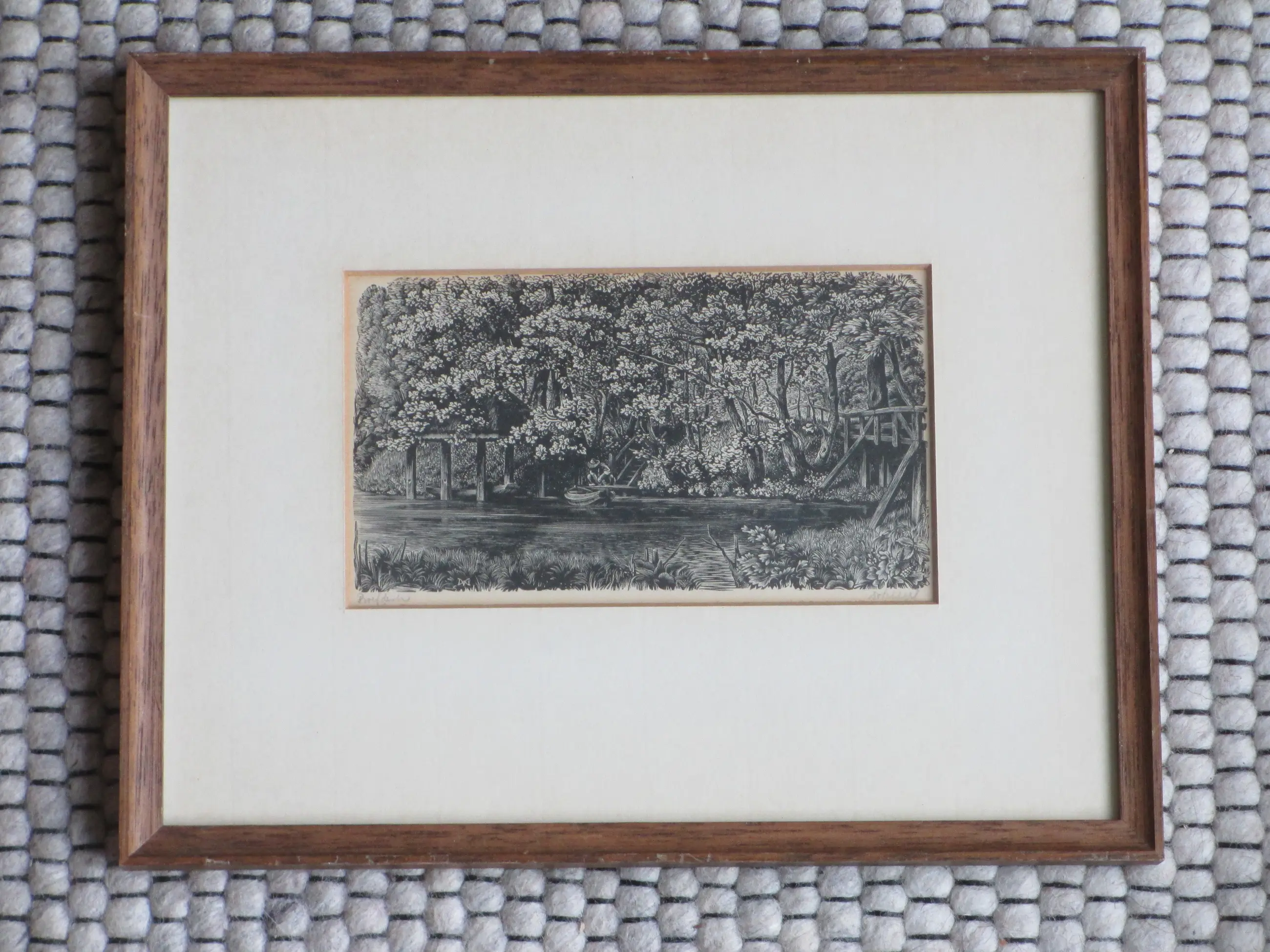 Gravure door Dirk van Gelder Voorstelling van een plasgezicht in een bos, met een roeiboot, steigers en een figuur Gelijst, beeldmaat 8.5x15, lijstmaat 22x17 Gesigneerd in potlood r.o.: 'DvGelder' Tevens gemoznogrammeerd in de druk l.o.: 'DvG' Annotatie in potlood l.o.: 'proefdruk'