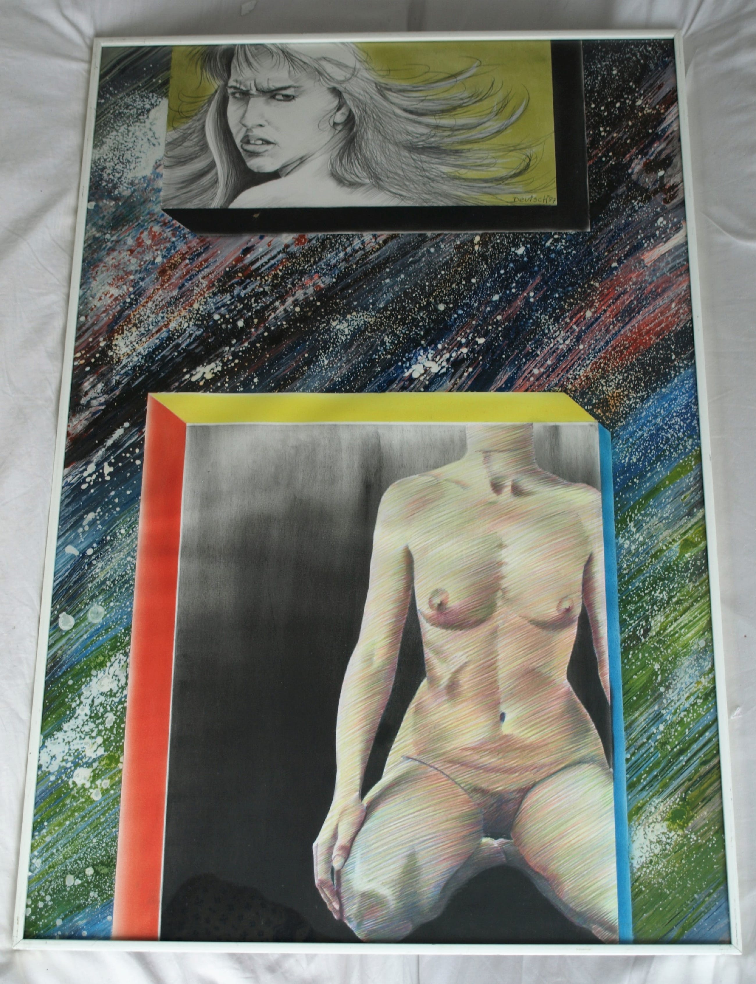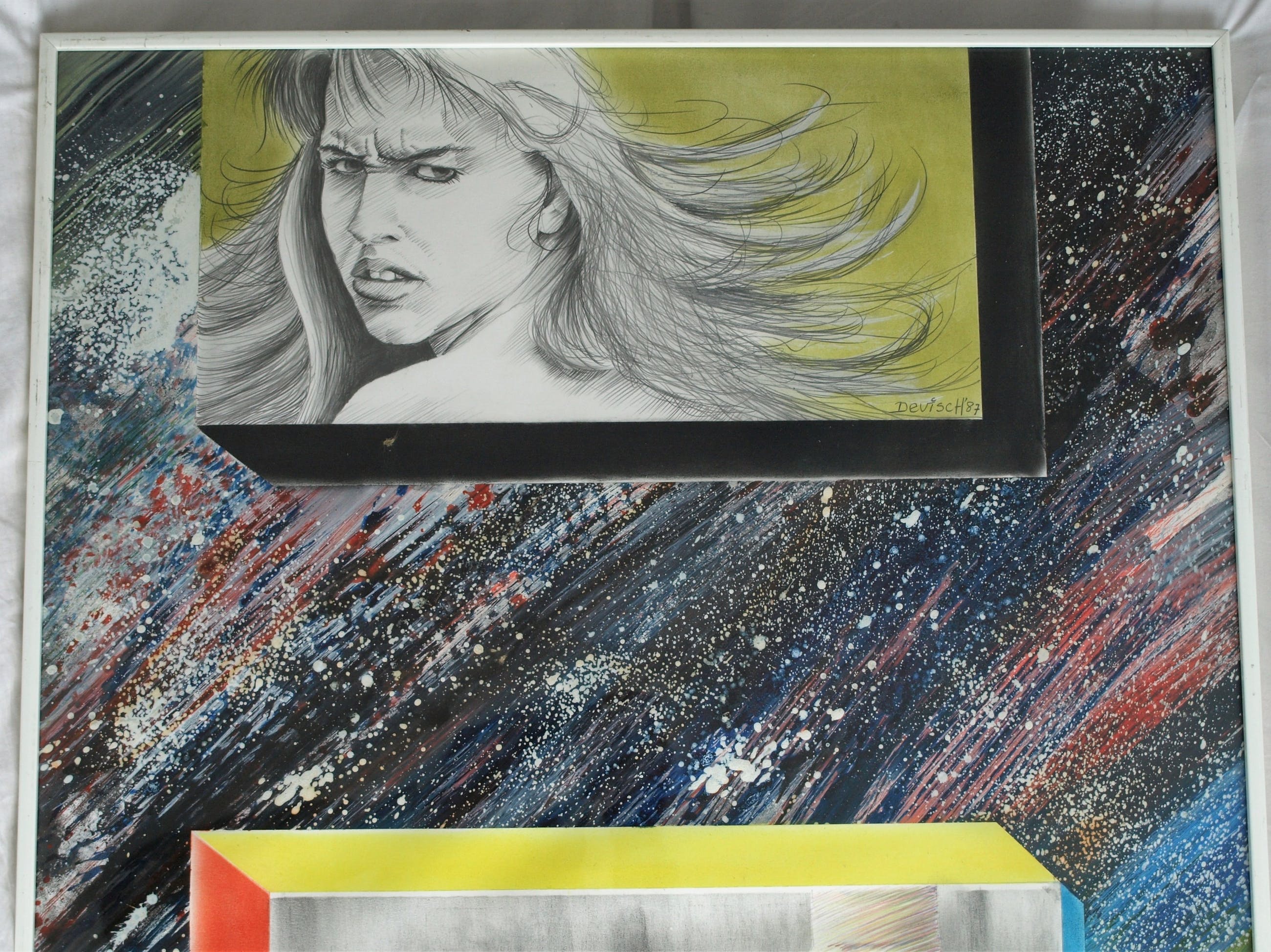 Een groot, ingelijste werk uit 1987 van de Nederlandse / Zaanse kunstenaar Dirk Visser (1941), getiteld “Gesnoerd geweten”.