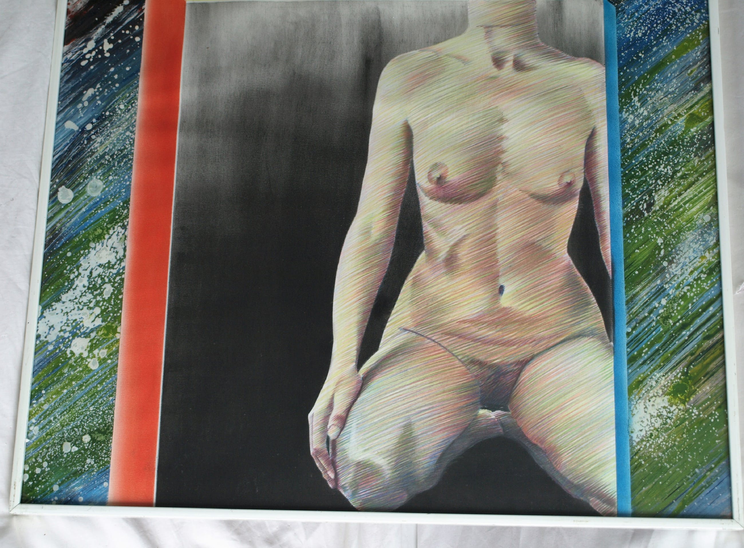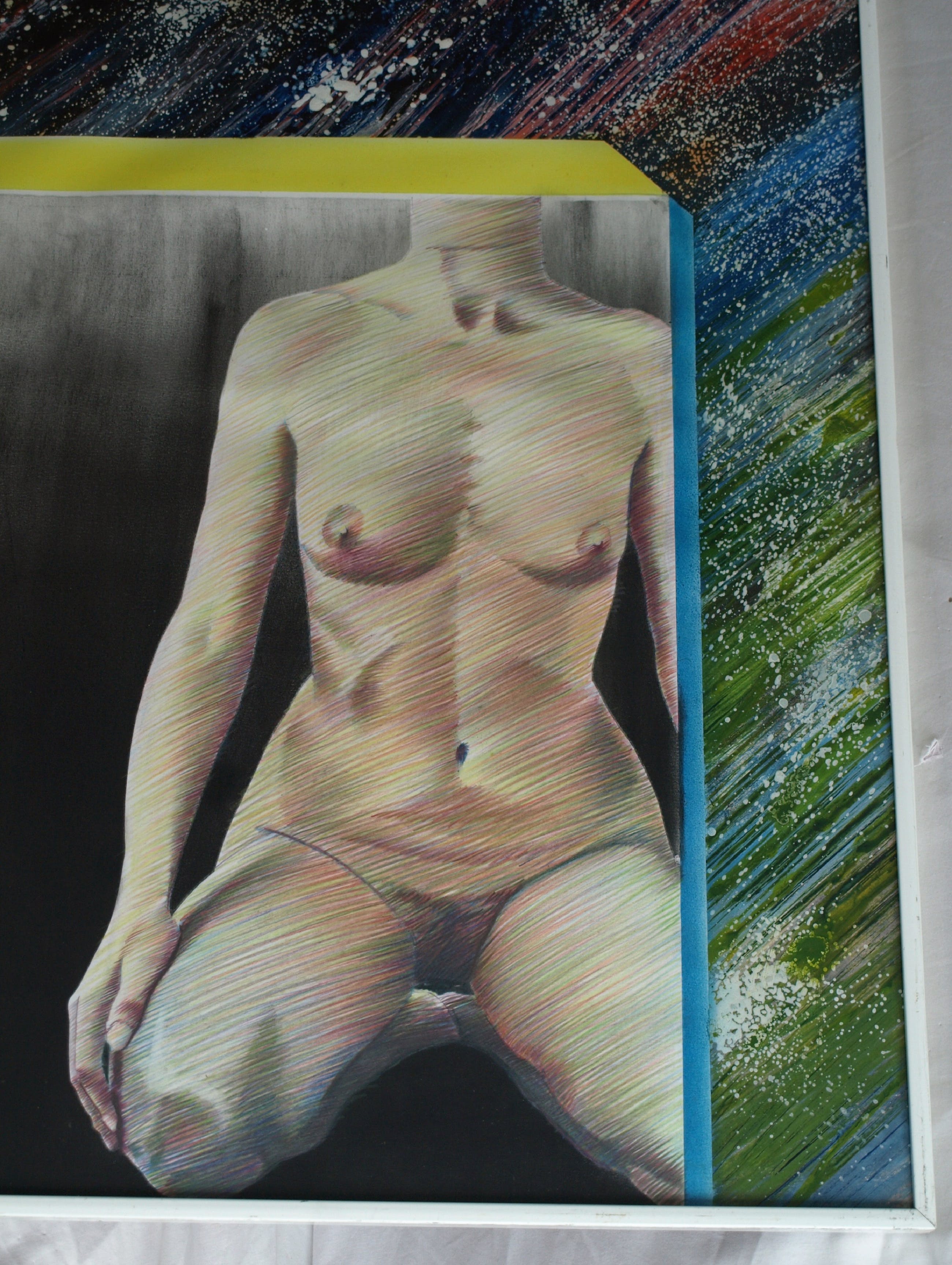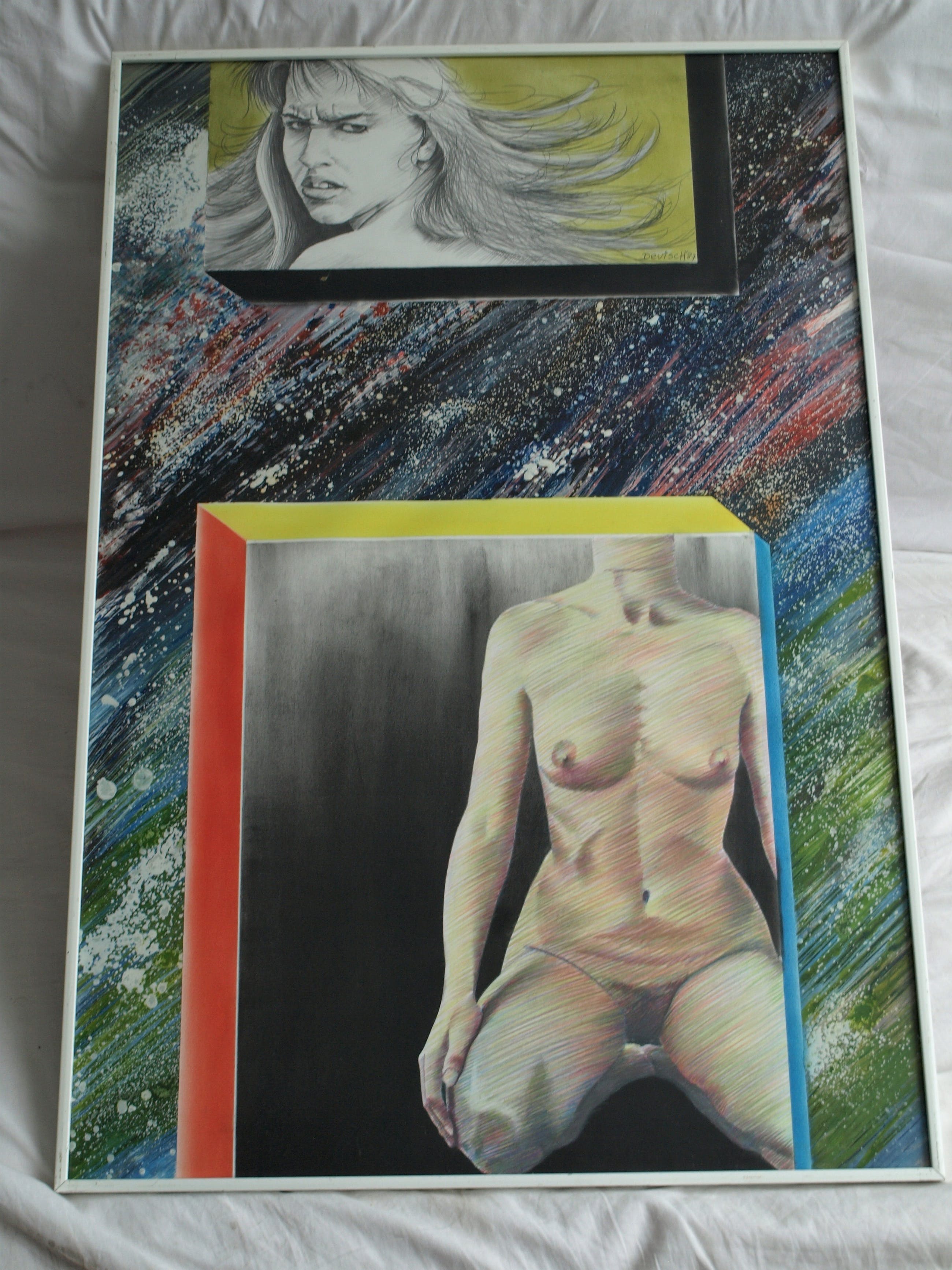 -Een gemengde techniek van verf en tekening.