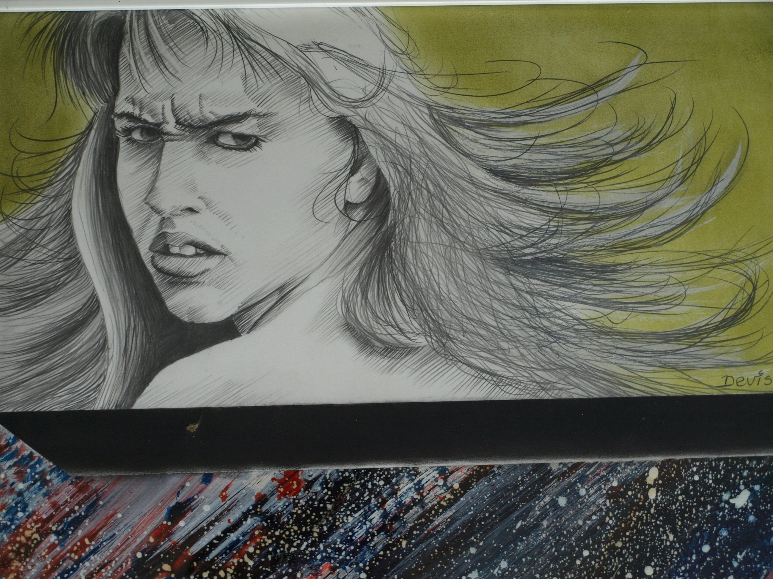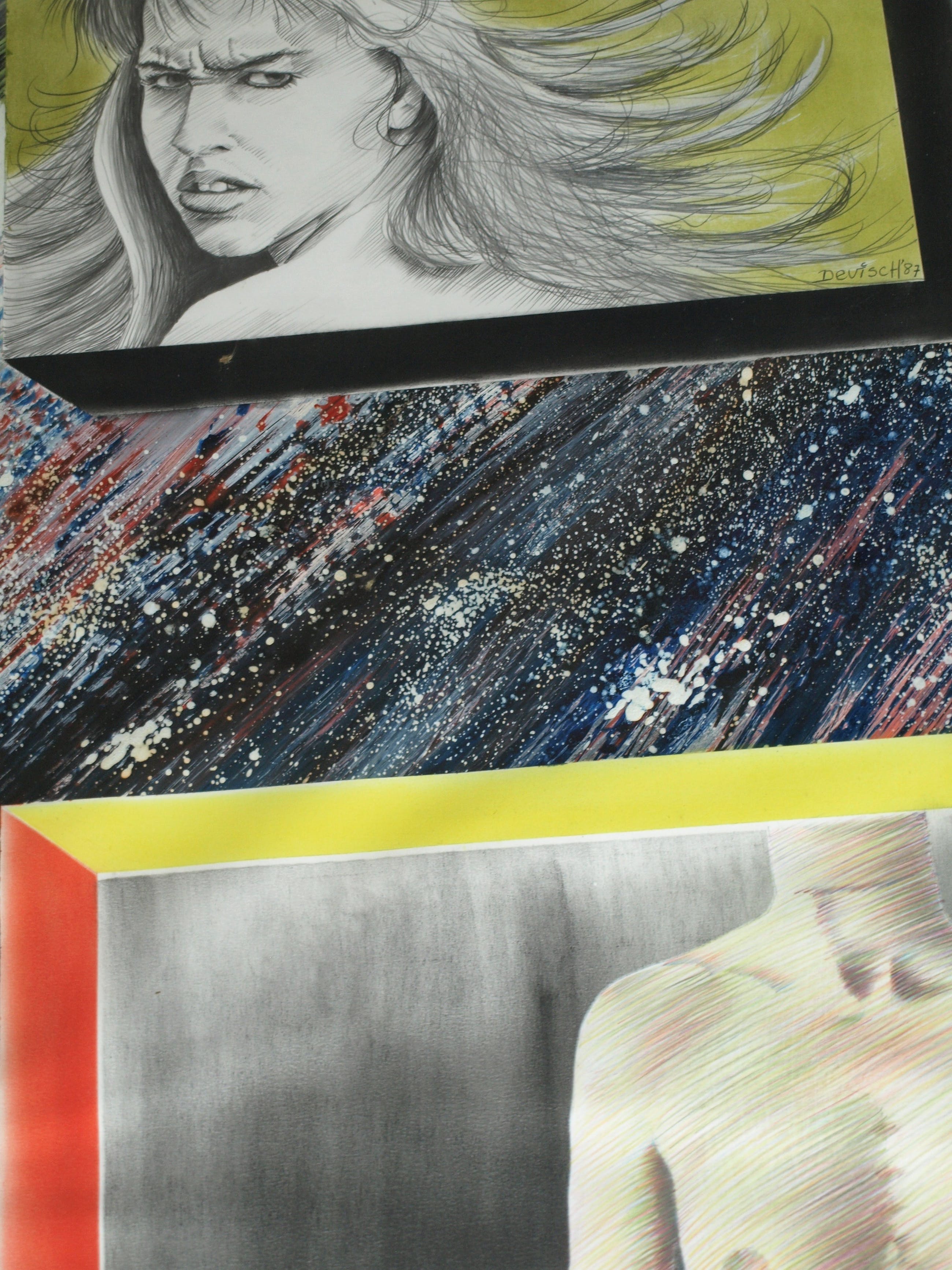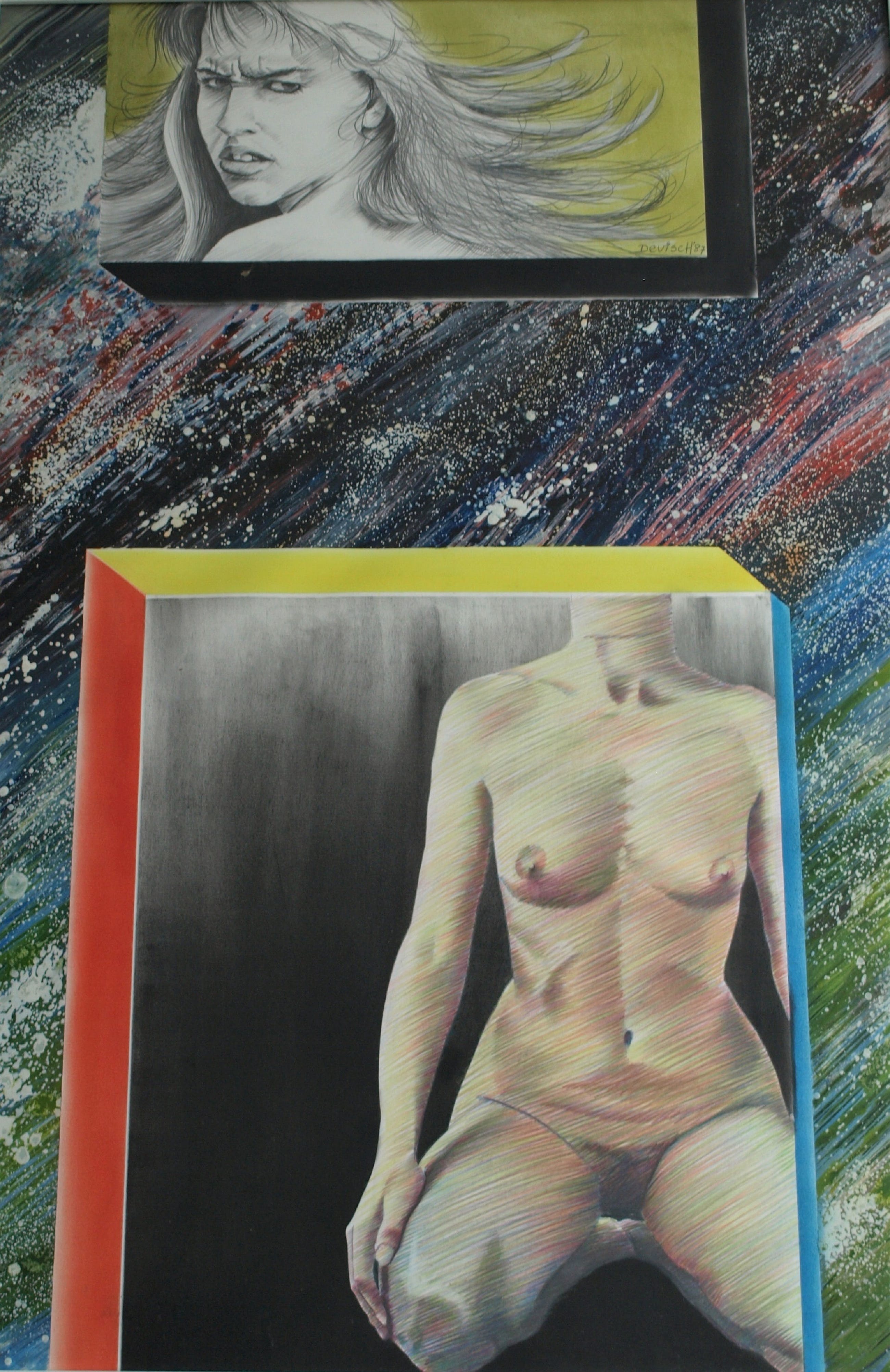 -Een gemengde techniek van verf en tekening.