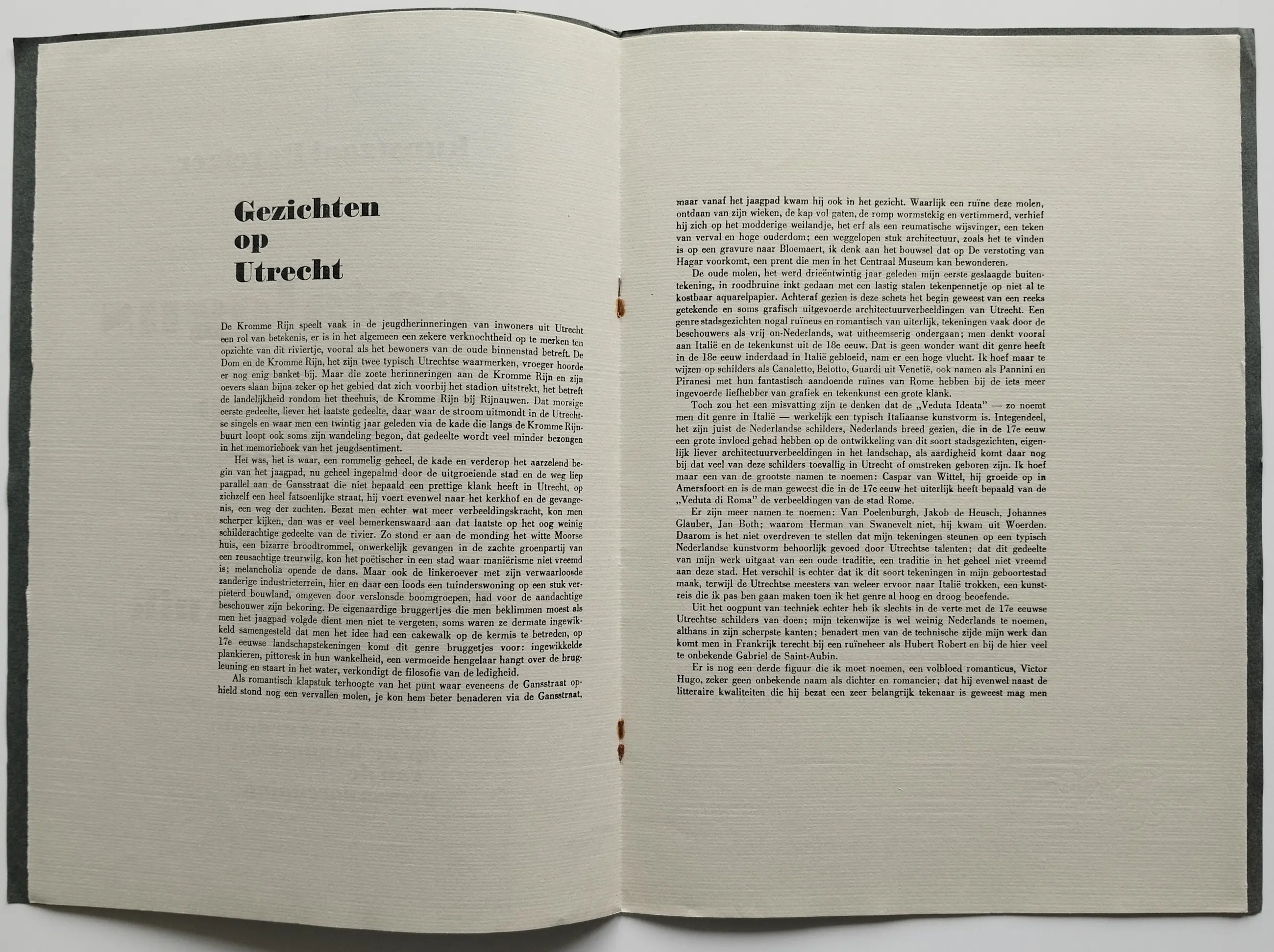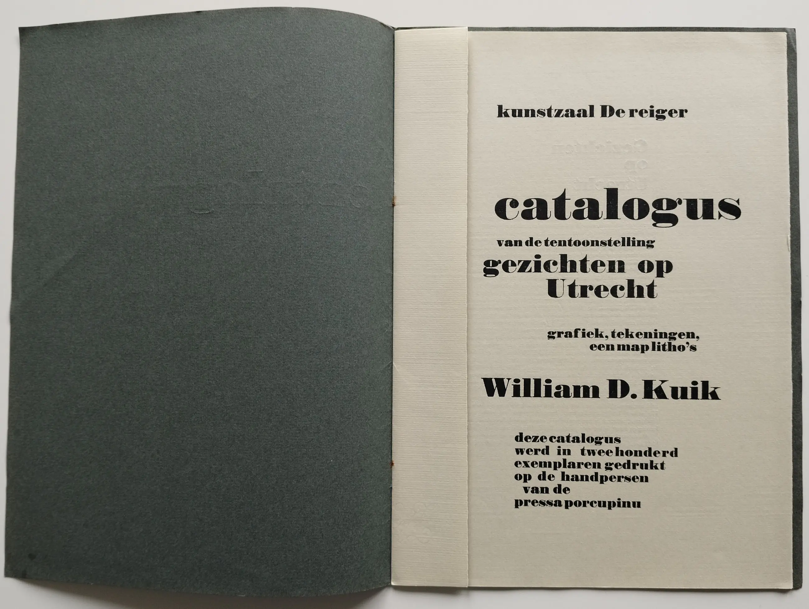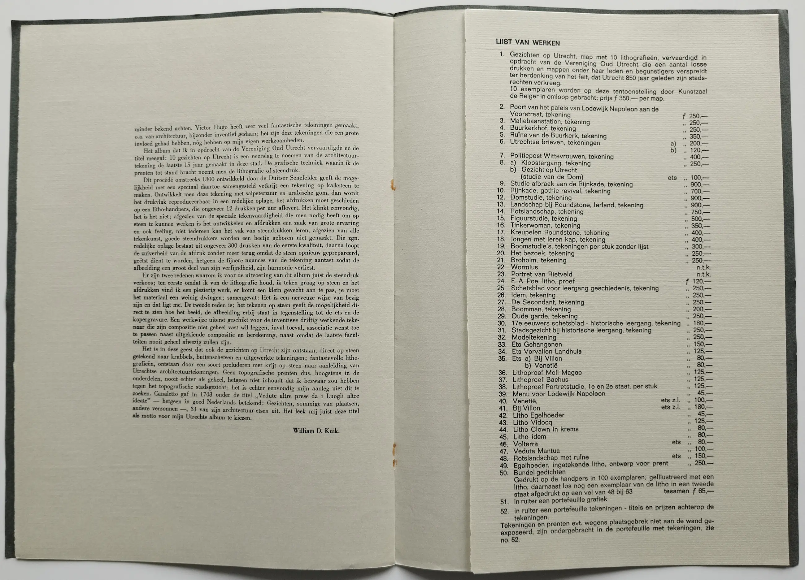 Catalogus gezichten op Utrecht met 2 gemonografeerde litho’s of clichés van de kunstenaar Dirkje Kuik (1929 – 2008) De litho’s of clichés zijn links onder gemonografeerd. Afmeting litho’s of clichés 29 x 20.5 cm (hxb) Op de litho’s of clichés zijn lichte gele vlekken zichtbaar. Op de buitenkant van de catalogus zitten vouwen en vlekken en de nietjes zijn verroest.