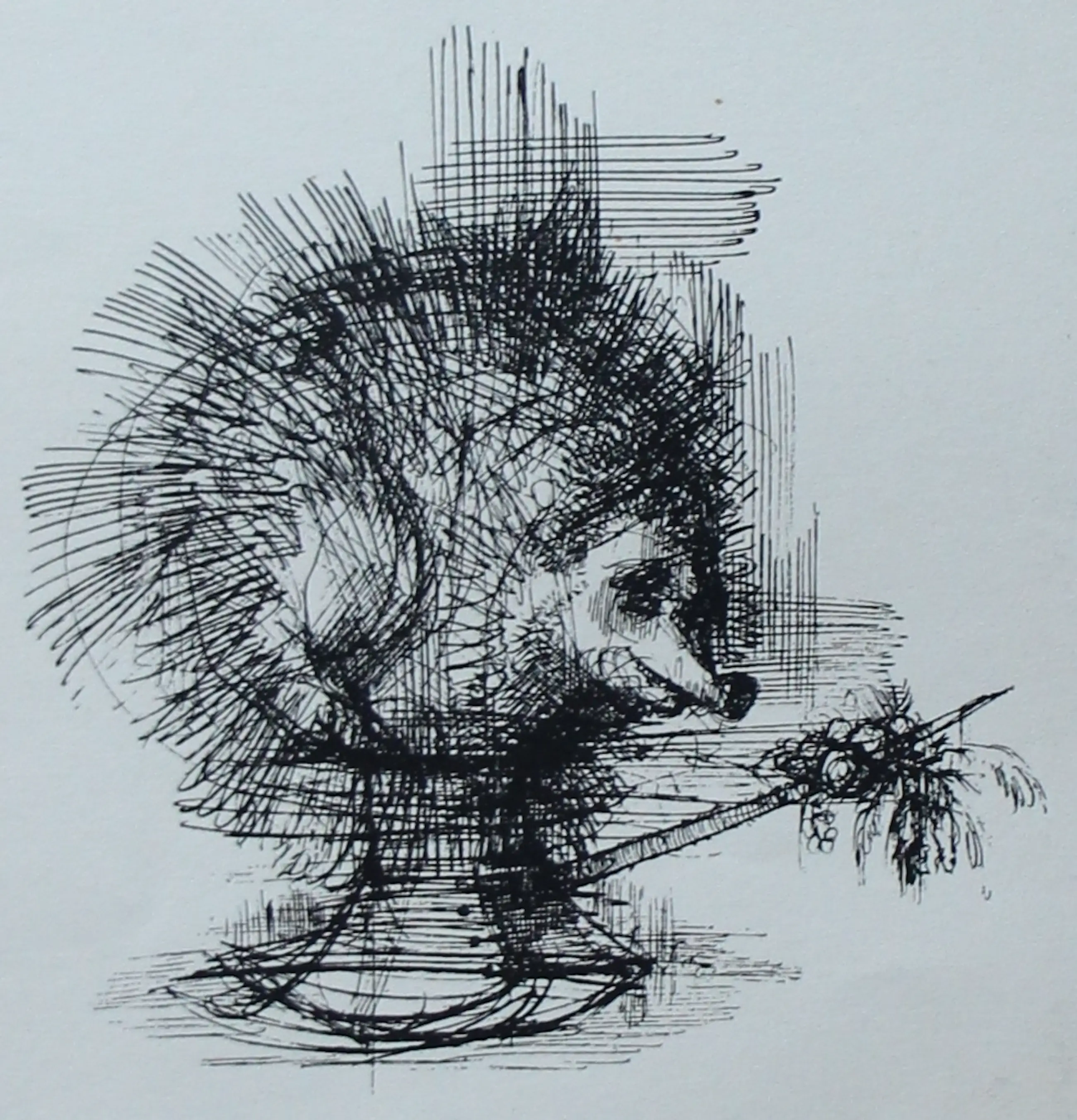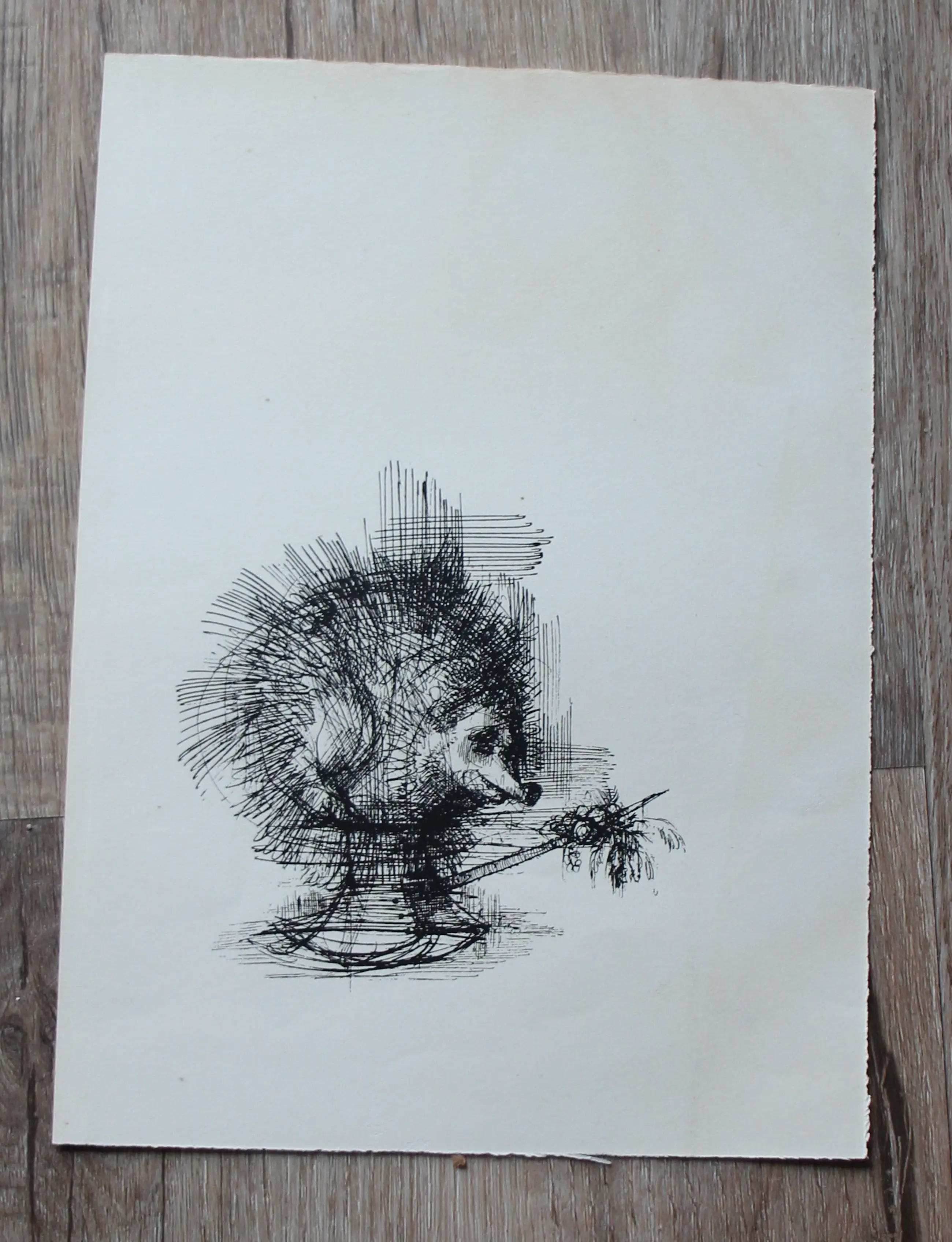 Clichedruk(reproductie pentekening) op papier van Dirkje Kuik. Egeltje. Afmetingen werk: H26 x B19 cm. Afmetingen voorstelling: H12 x B12. Het werk is in goede staat. Het blad is wel wat vergeeld. Literatuur: Boek Grafisch gezelschap de Luis, bladzijde 126/nummer 66-5B.