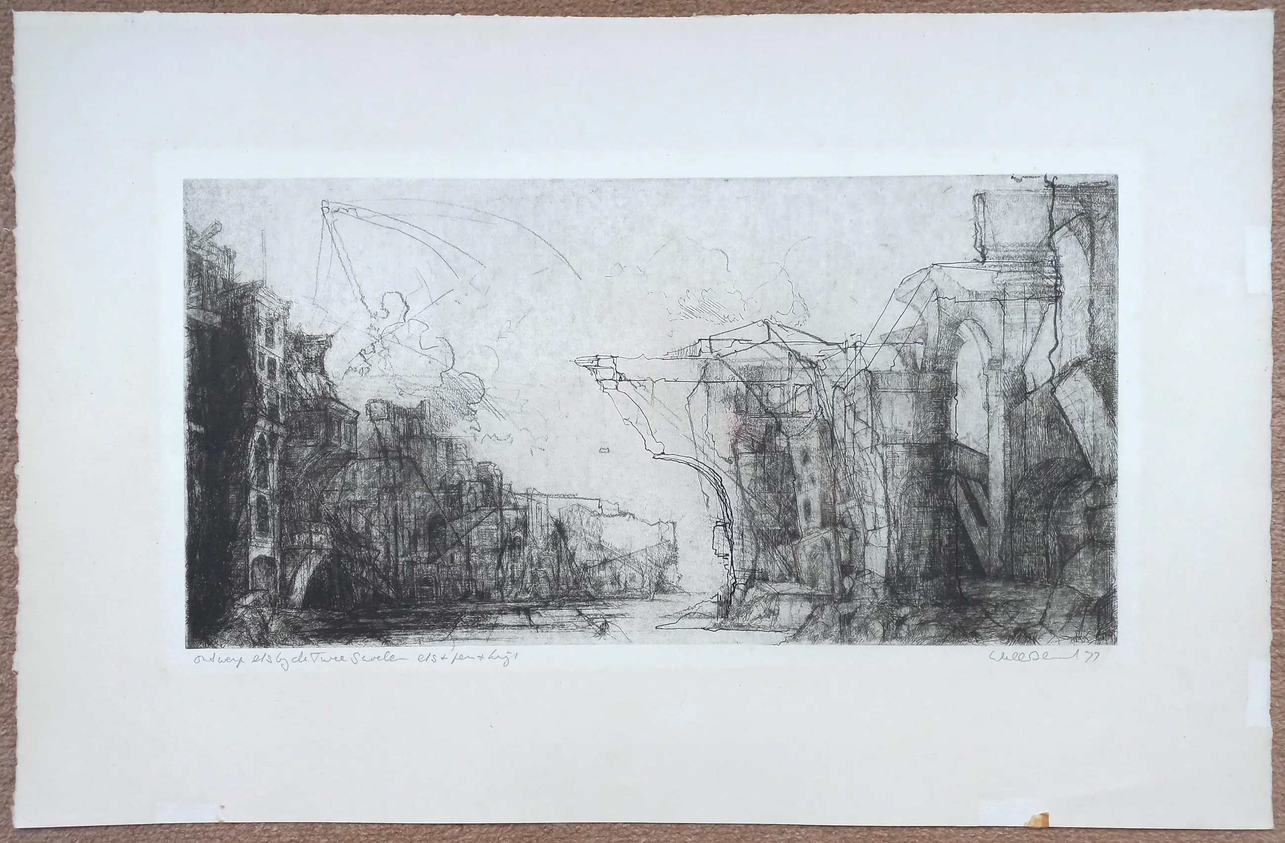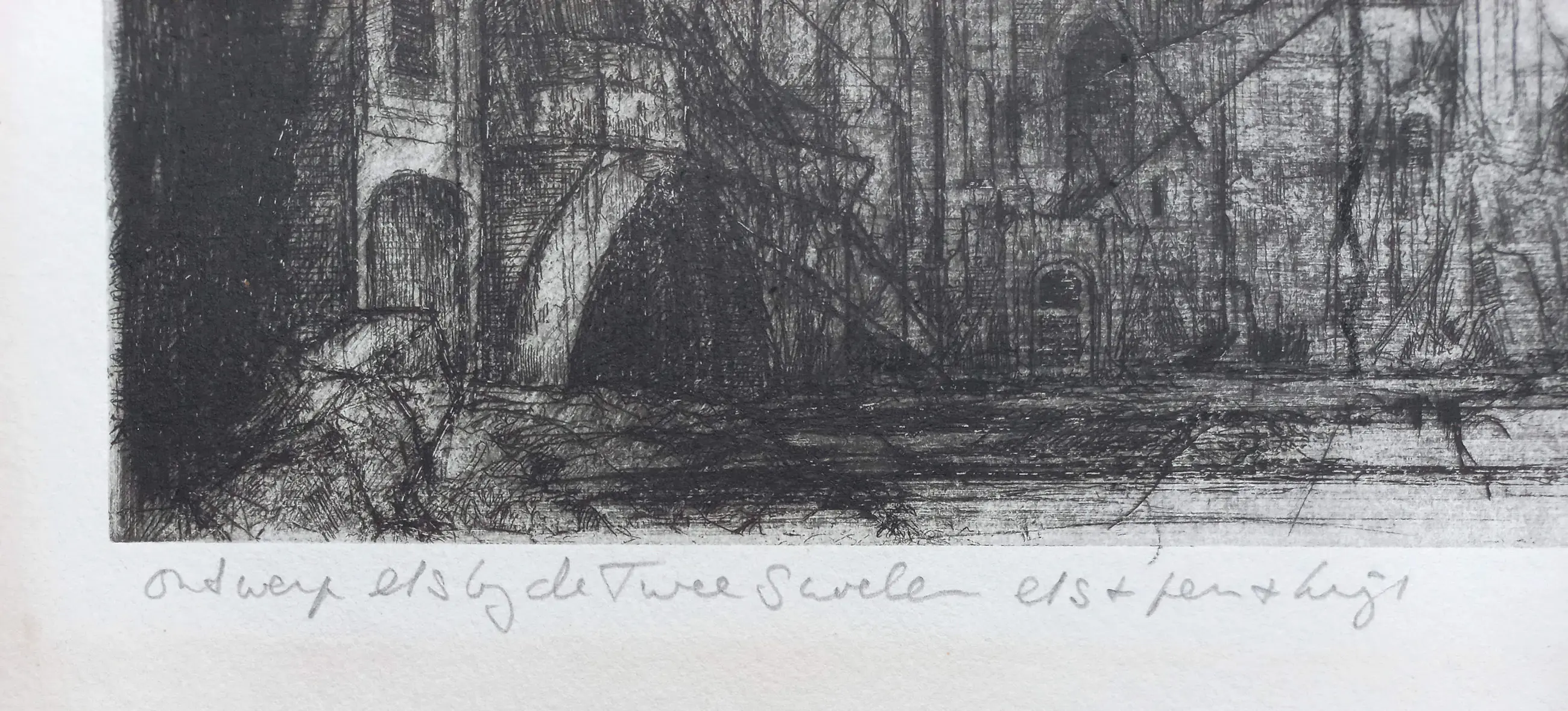 Mooi, karakteristiek werk van Dirkje Kuik, een ingetekende ontwerp ets voor het boek “De twee snoeken” (1977). Ets, ingetekend met pen en krijt, op geschept papier (Johannot), met potlood gesigneerd, gedateerd en geannoteerd. In goede conditie.