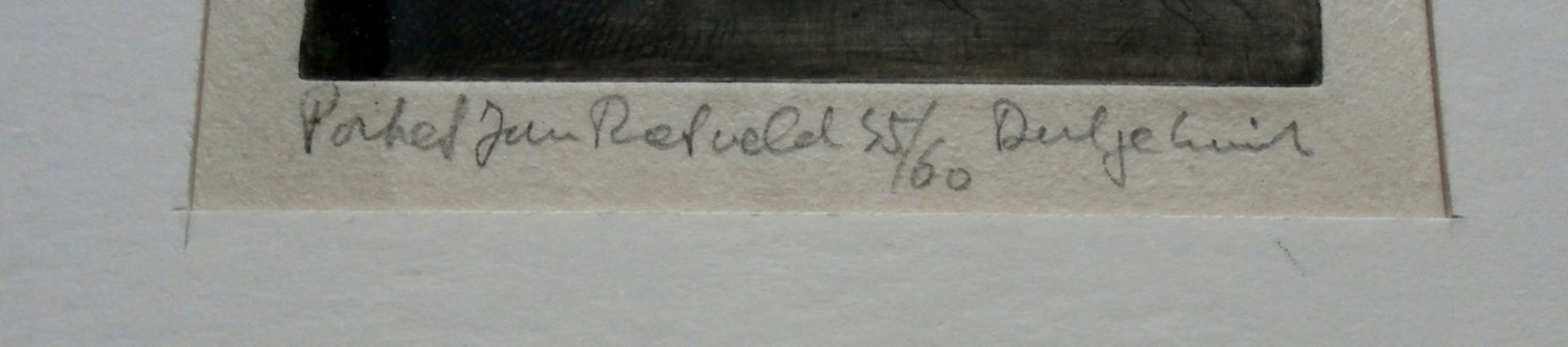 Nummer: 35/60. Rechtsonder, met potlood, gesigneerd door de kunstenaar. Afmetingen ets: H11 x b7,6 cm.