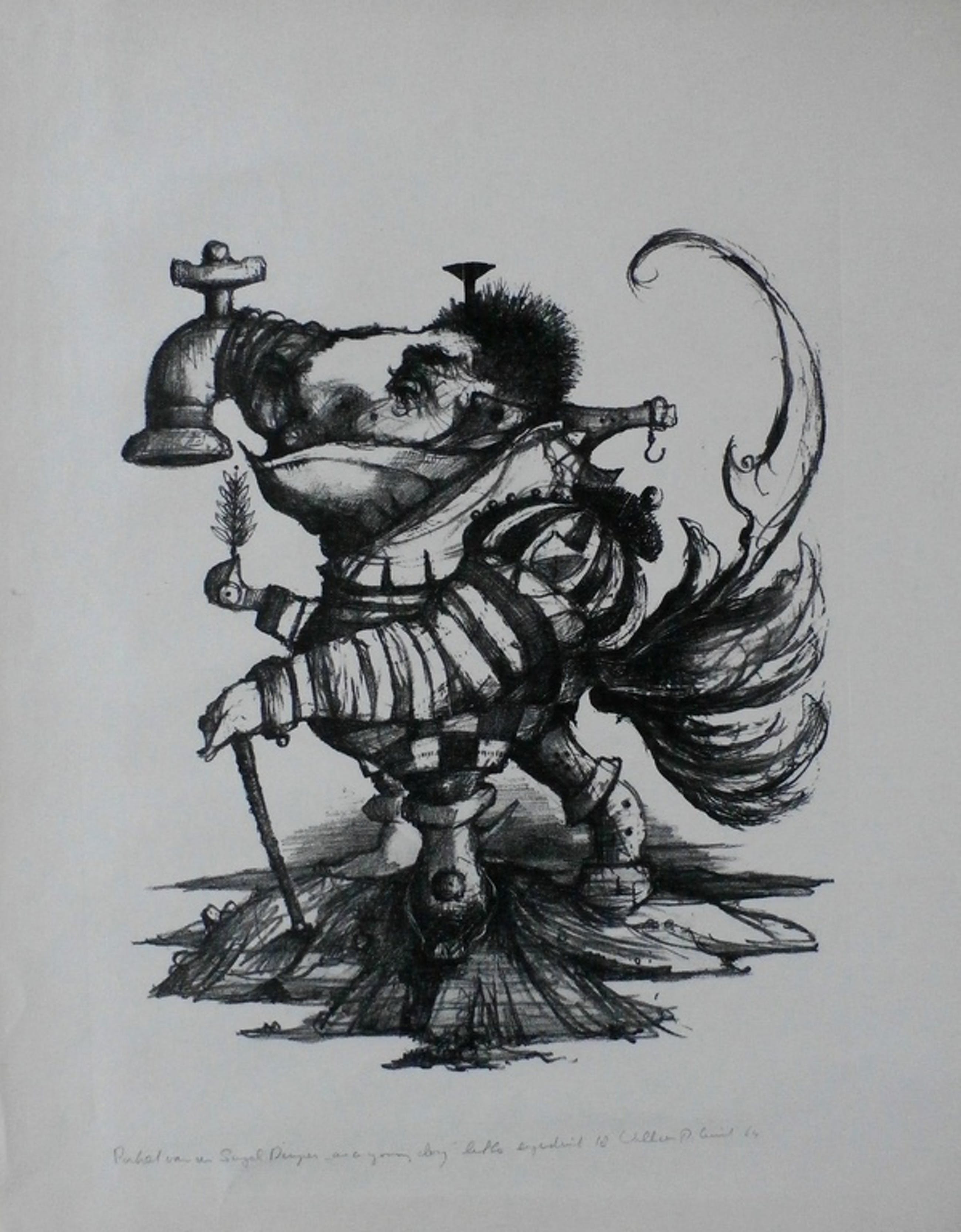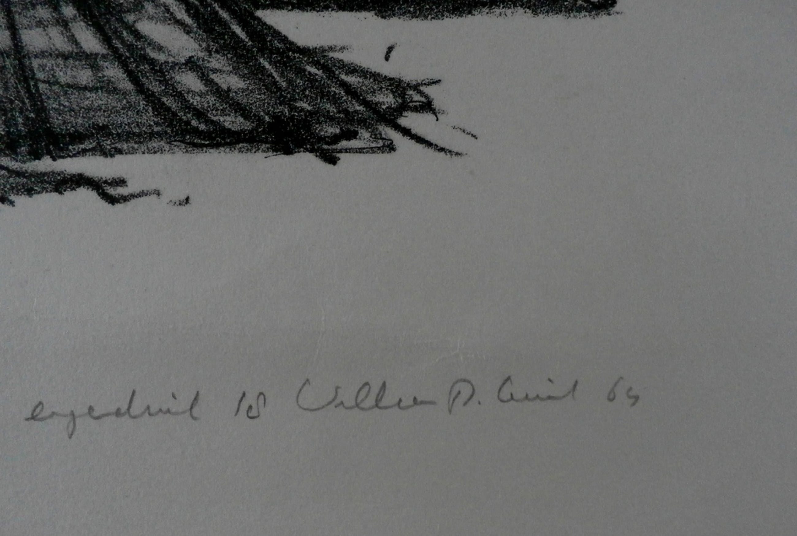 Grote litho van Dirkje Kuik uit 1964. Nummer: eigen druk 18. Titel: slecht leesbaar. Onderop met potlood geschreven. Afmetingen blad: H61,5 x b49 cm. Afmetingen voorstelling: H41 x b35 cm. Conditie: de voorstelling is in goede staat. Aan onderijde zitten wat kreukeltjes in het papier.