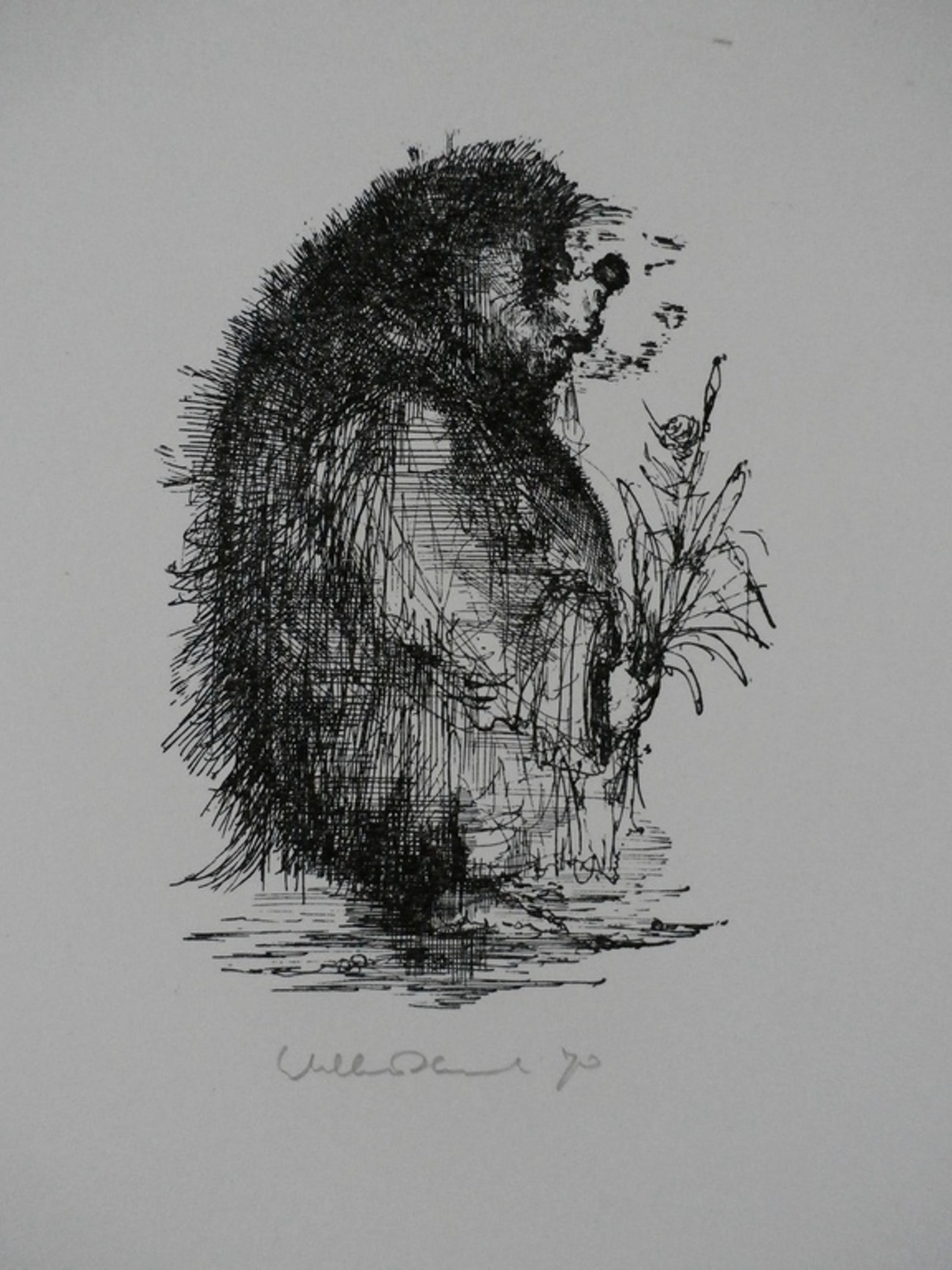 Litho van Dirkje Kuik uit 1970 met de voorstelling van een egel. . Het werk is middenonder, met potlood, gesigneerd door de kunstenaar. Afmetingen blad: H49,5 x b35 cm. Afmetingen voorstelling: H17 x b12 cm. Conditie: de voorstelling is in goede staat. Aan de rechteronderzijde zit een vouw in het blad. Er zitten wat bruine sreepjes aan de rechterzijkant op het blad. Deze vallen allemaal bij inlijsting onder de passe-partout.