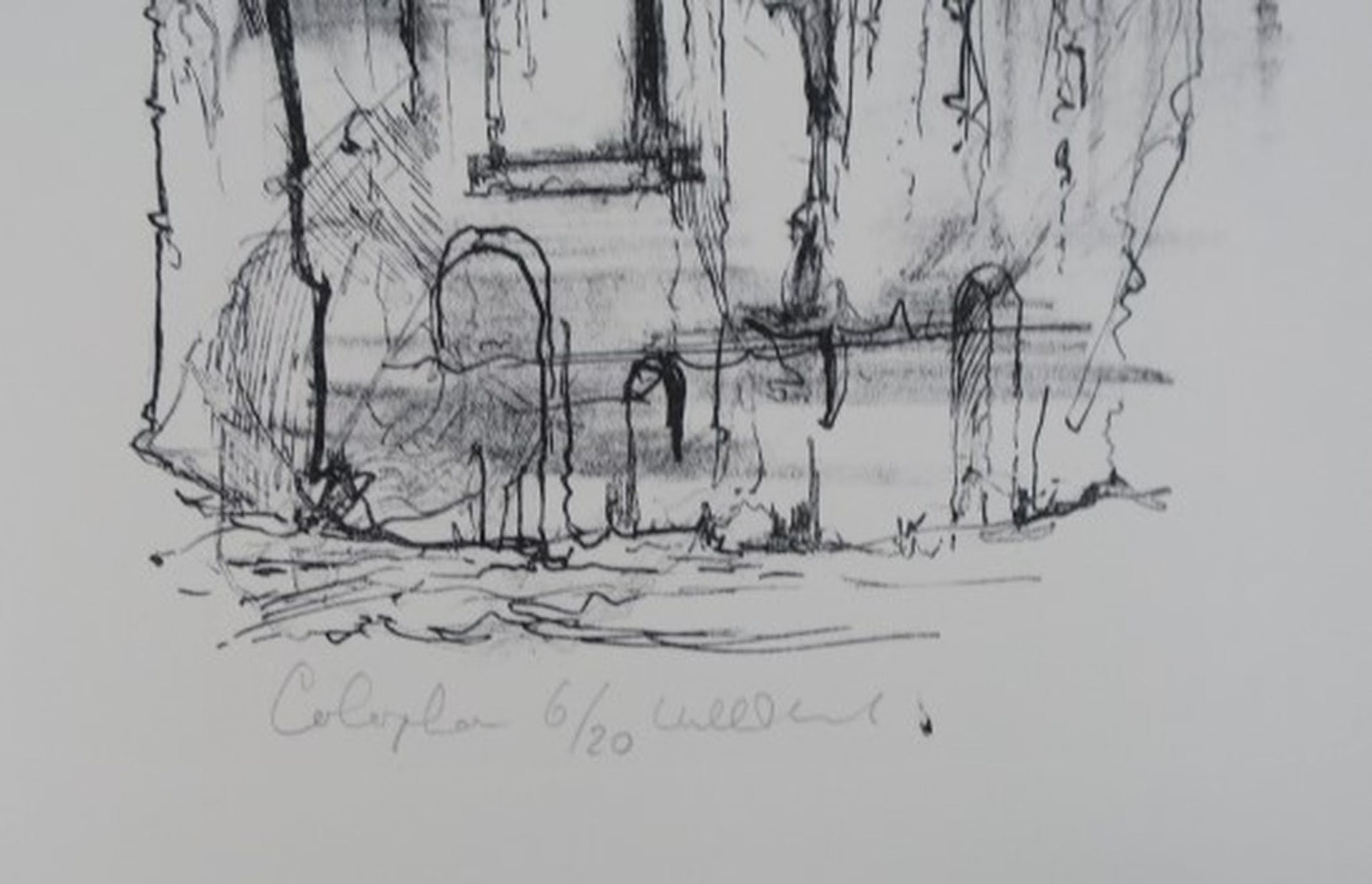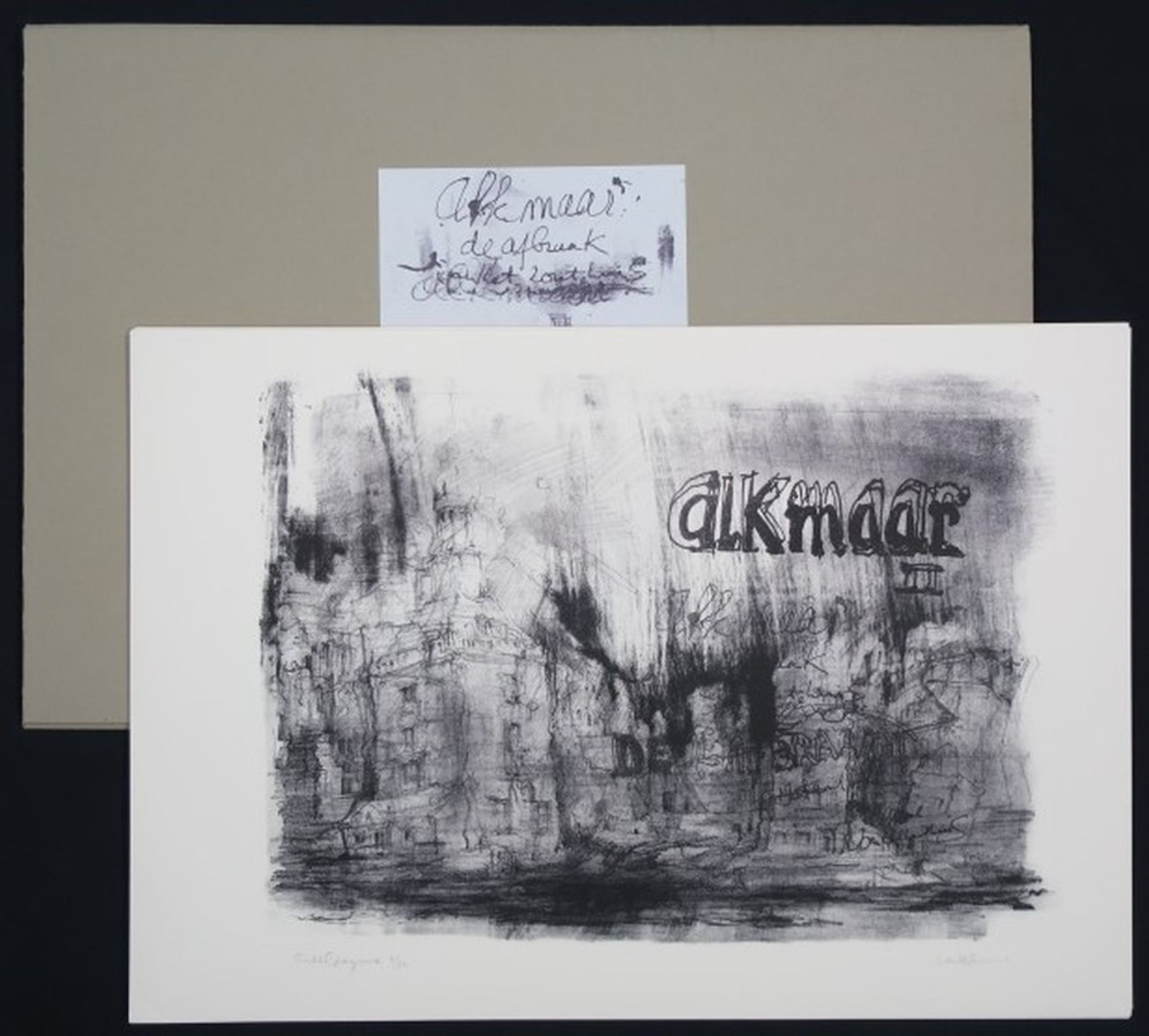 Colophon (ook lithografisch gedrukt): De map litho's Alkmaar II werd in twintig exemplaren afgedrukt op de lithohandpers van Lonneke Uittenbogaard. De stenen werd geleverd door W.D. Kuik die ook de proeven trok. Van iedere steen zijn ook vijf losse drukken getrokken. Dit is een uitgave van de Randelpers. Dit is nummer 6/20.