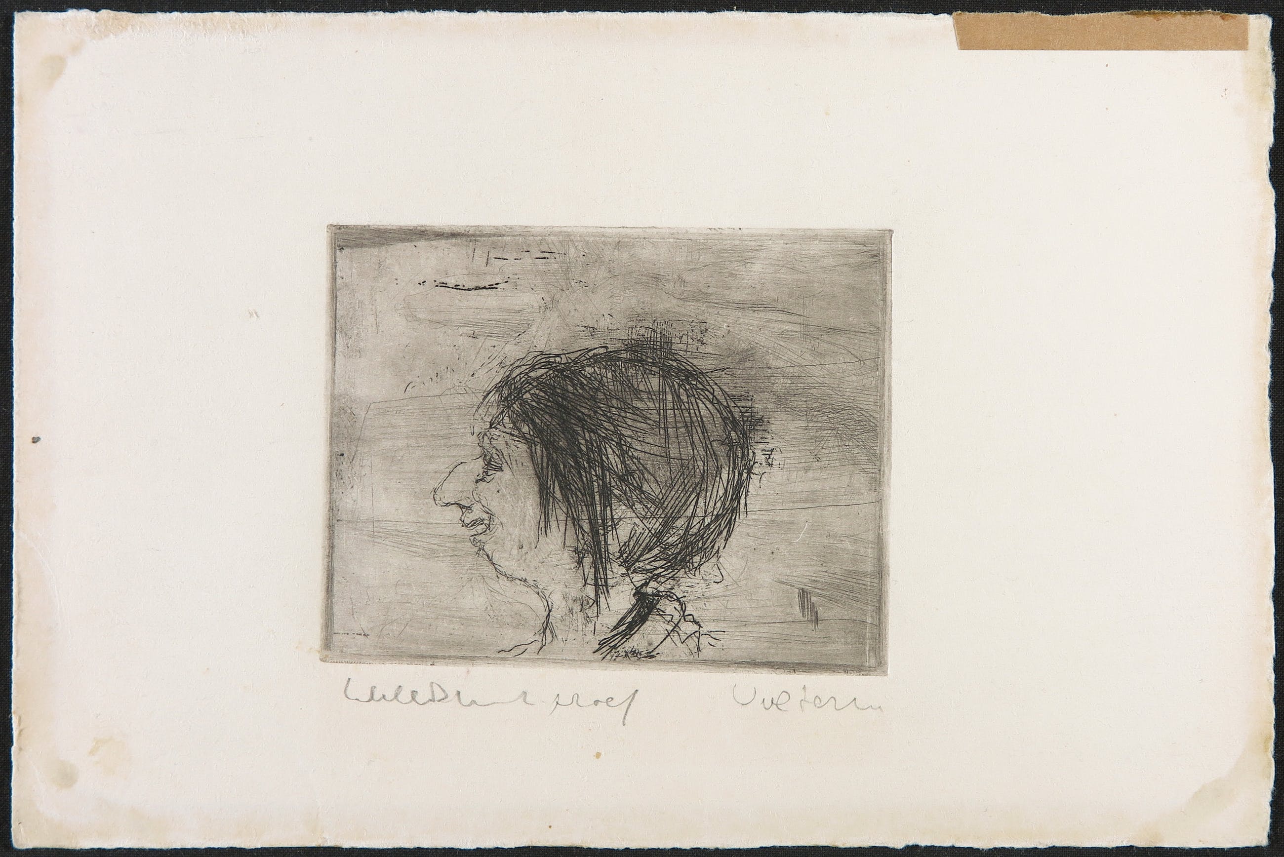 De voorstelling is in goede staat, met een paar kleine foxingplekjes langs de randen van de ets.De witmarge heeft verkleuringen/vergeling en tape-resten. | |||||||||||