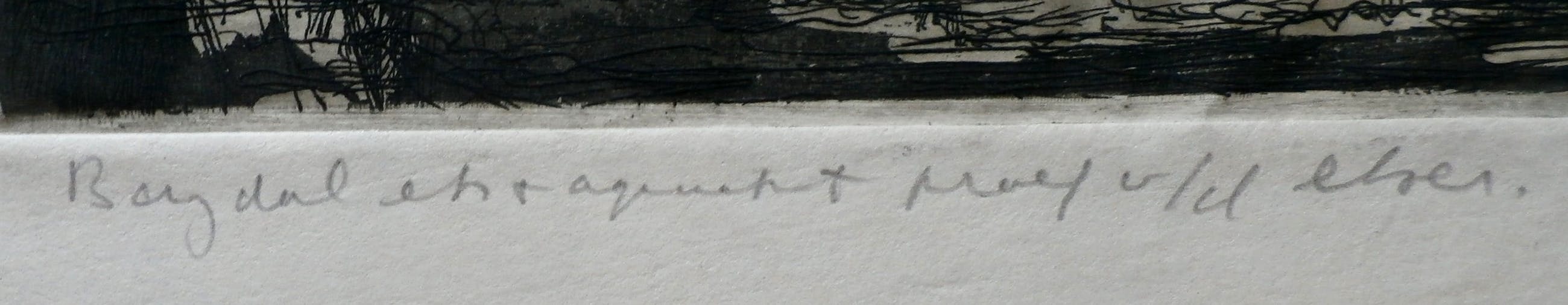 Ets & Aquatint van Dirkje Kuik. Titel: Baydal. Afmetingen blad: H19.5 x b30 cm. Afmetingen voorstelling: H10 x b16.5 cm. Het werk is rechtsonder, met potlood, gesigneerd door de kunstenaar.