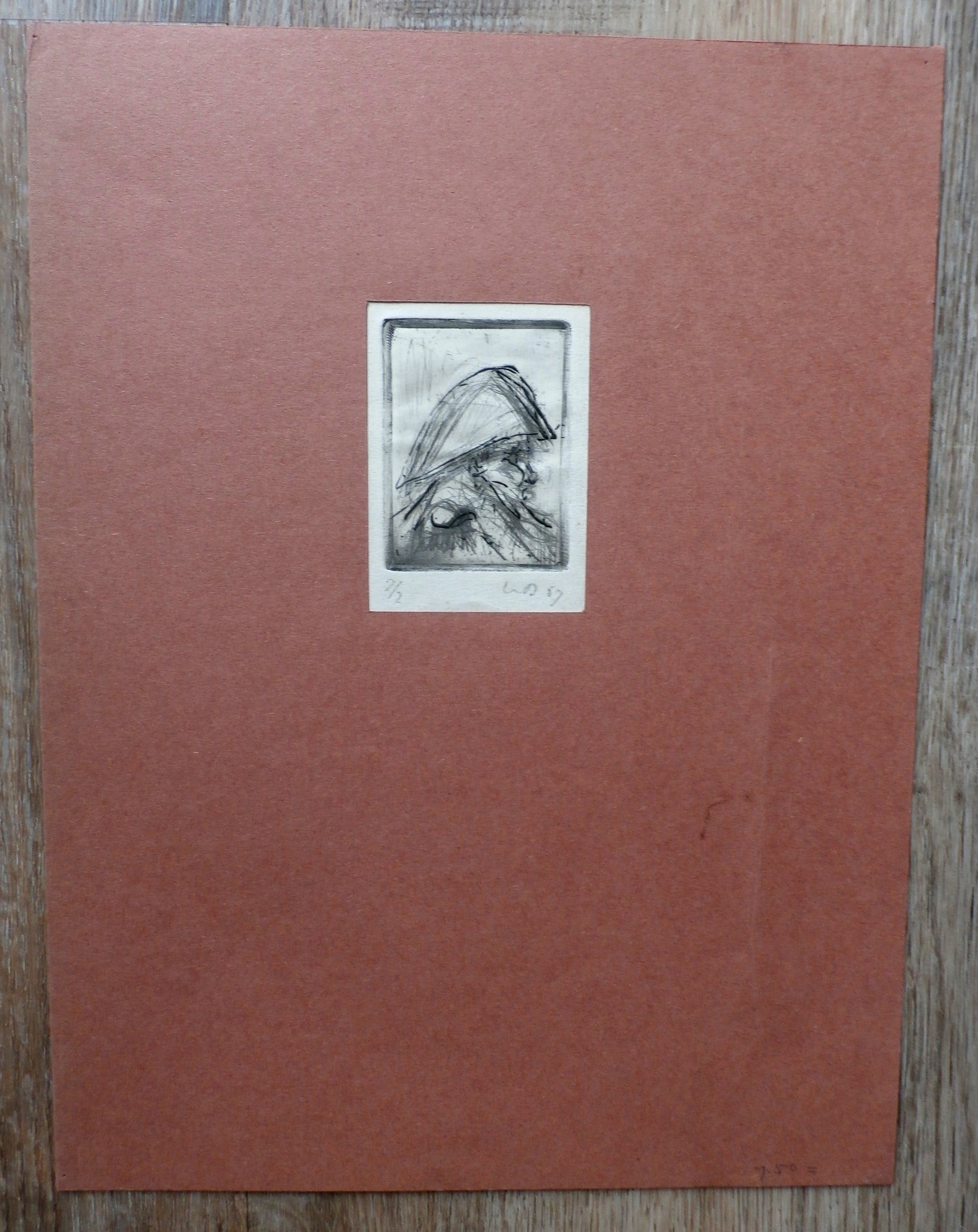 Ets + droge naald van Dirkje Kuik. Nummer: 2/2. Afmetingen blad incl passepartout: H32.5 x b25 cm. Afmetingen voorstelling: H6.5 x b5 cm. Het werk is rechtsonder, met potlood, gesigneerd door de kunstenaar.