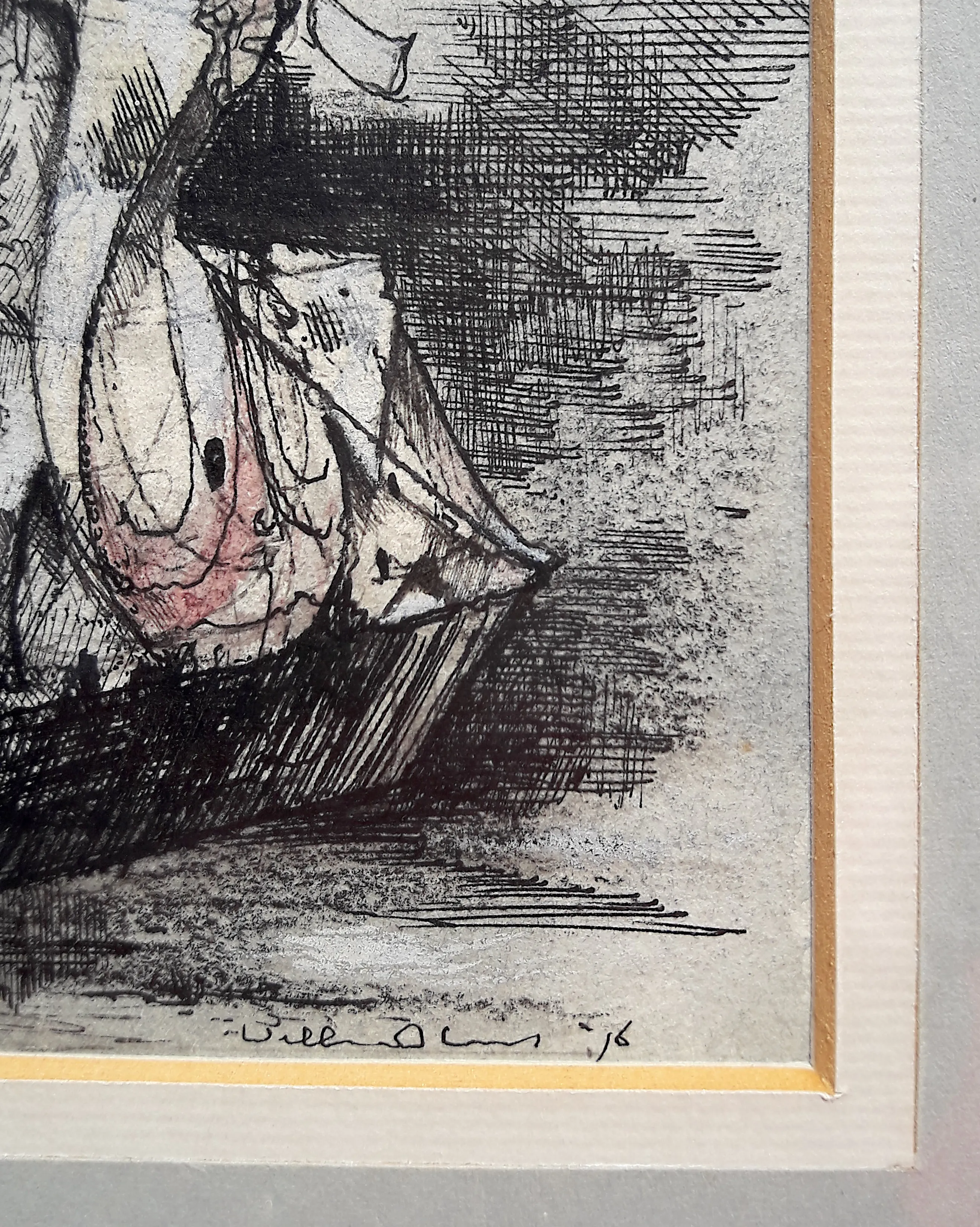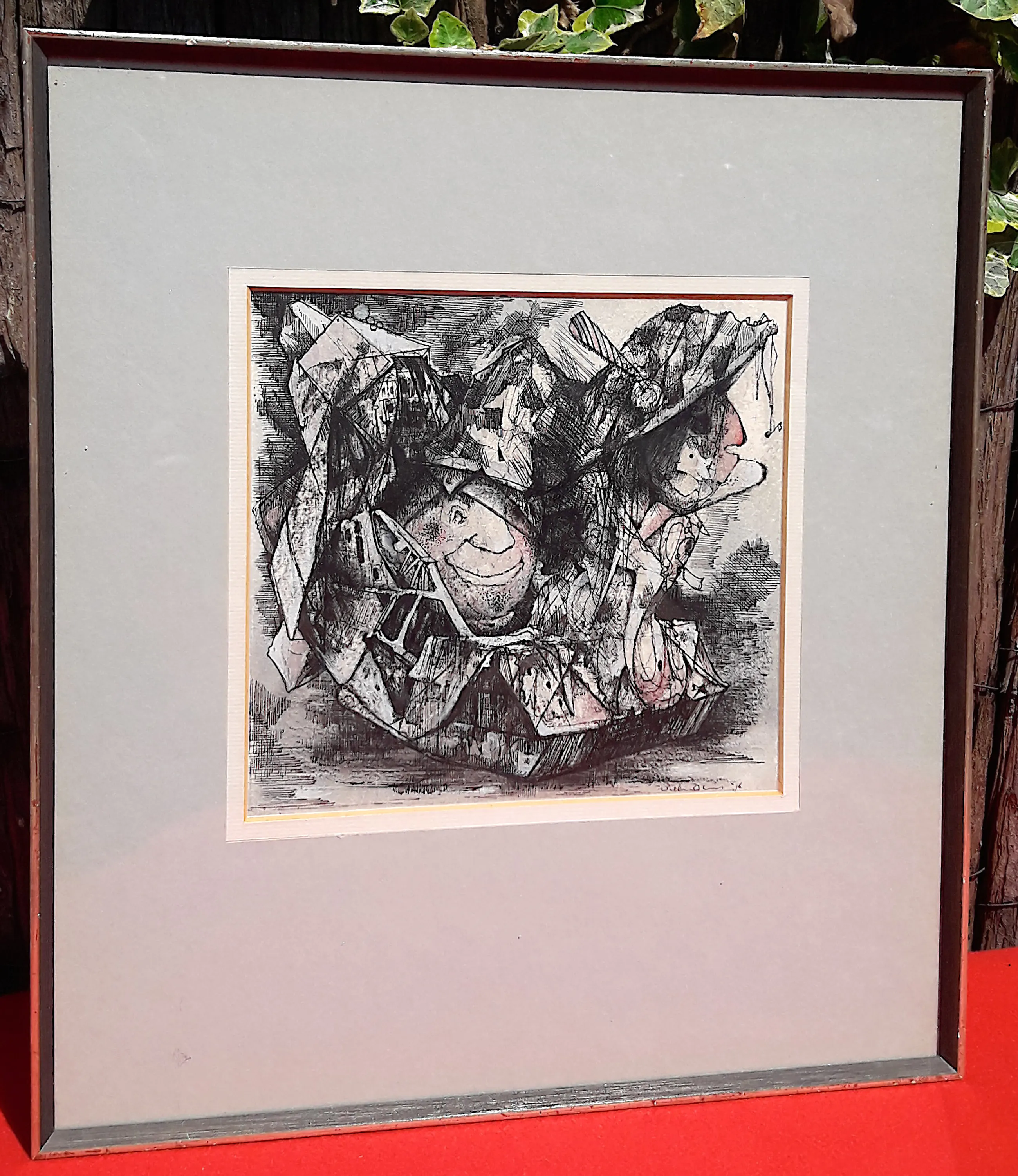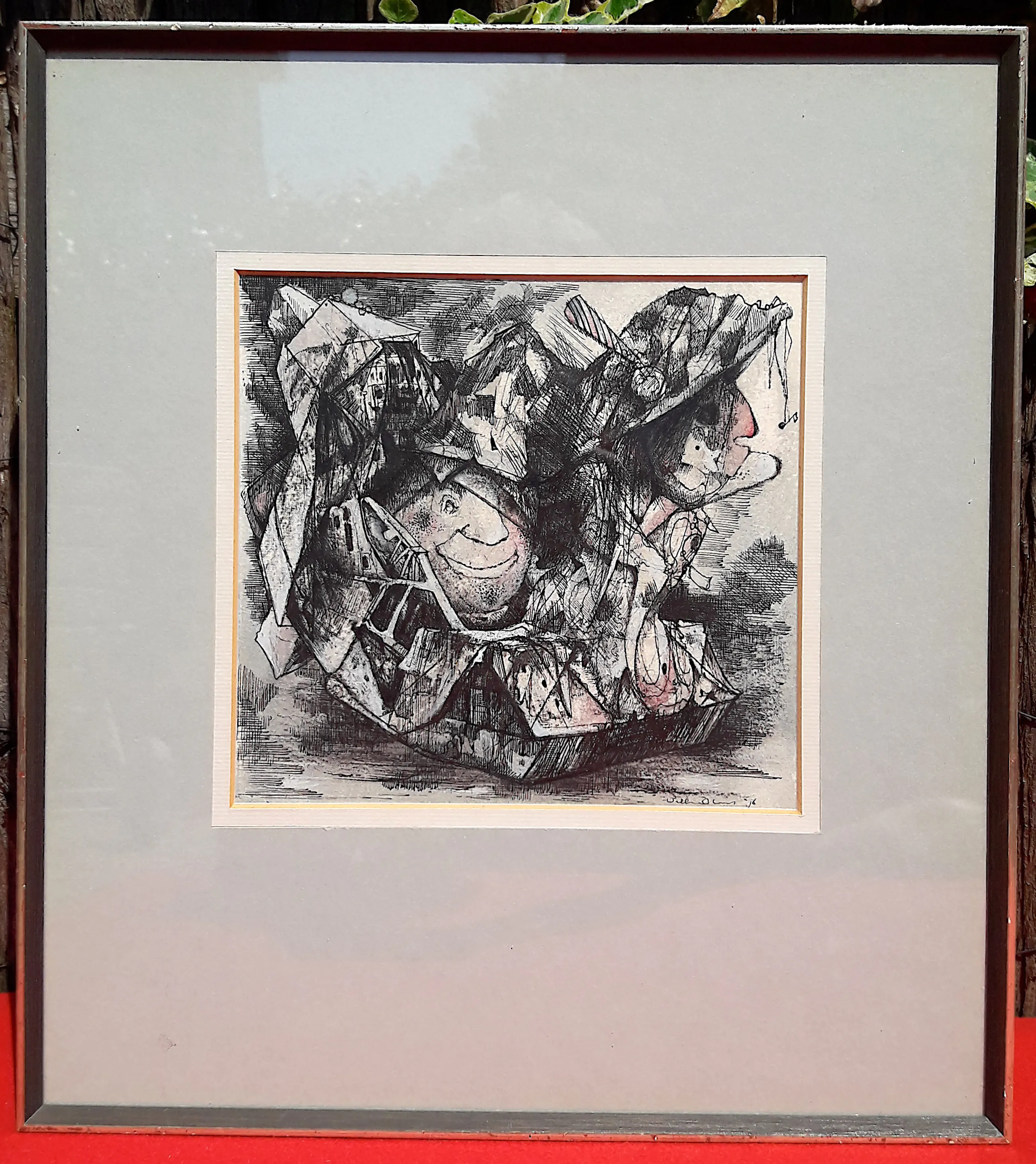 Karakteristiek werk van Dirkje Kuik. Tekening met Oost-Indische inkt, voluit gesigneerd en gedateerd (‘76) rechtsonder, ingelijst achter glas en met passe-partout. Achterop uitgebreide aantekeningen. Afkomstig van galerie JAS in Utrecht, in zeer goede conditie.