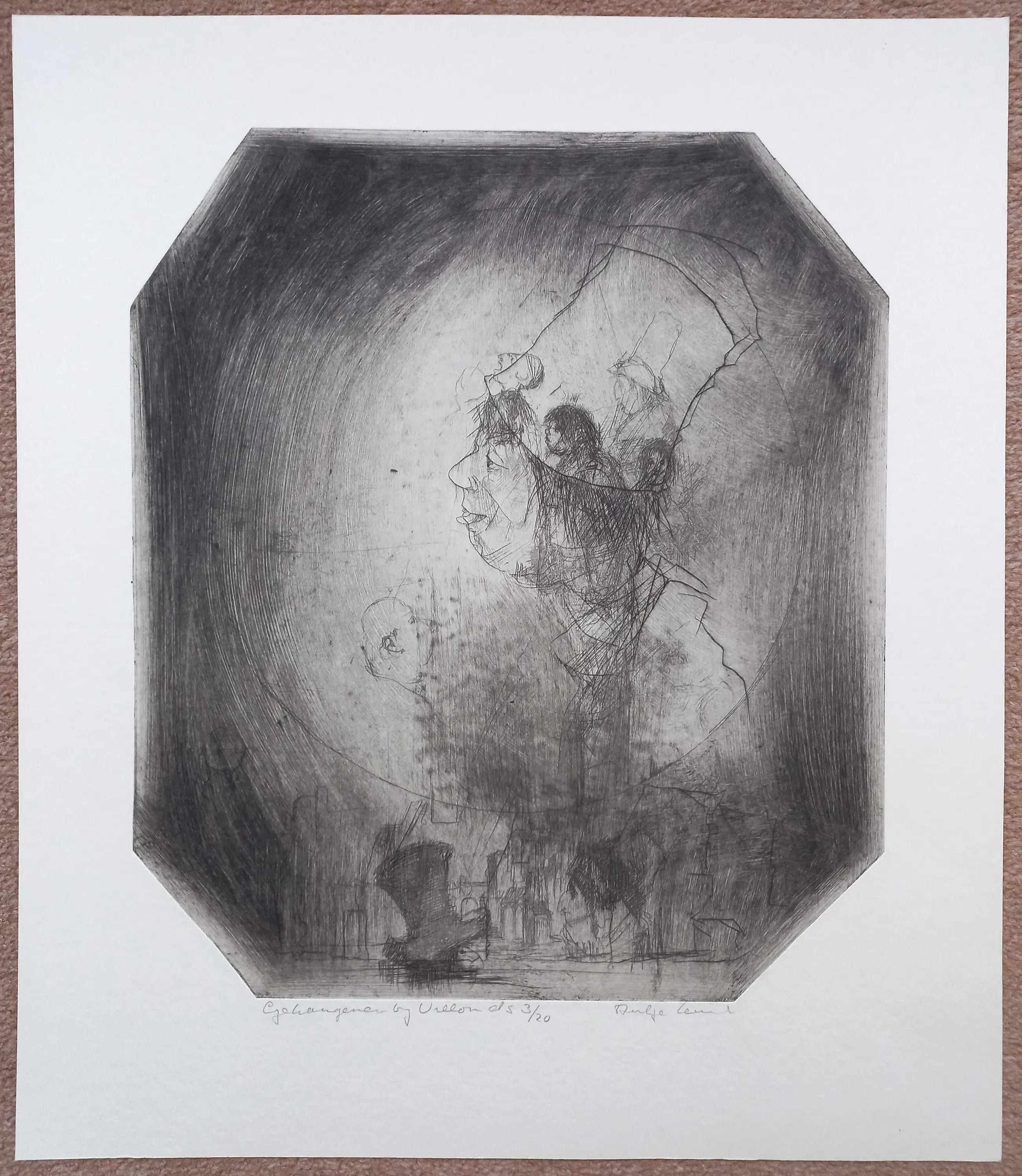Afmetingen: 46cm x 40cm (blad), 35cm x 30cm (ets)