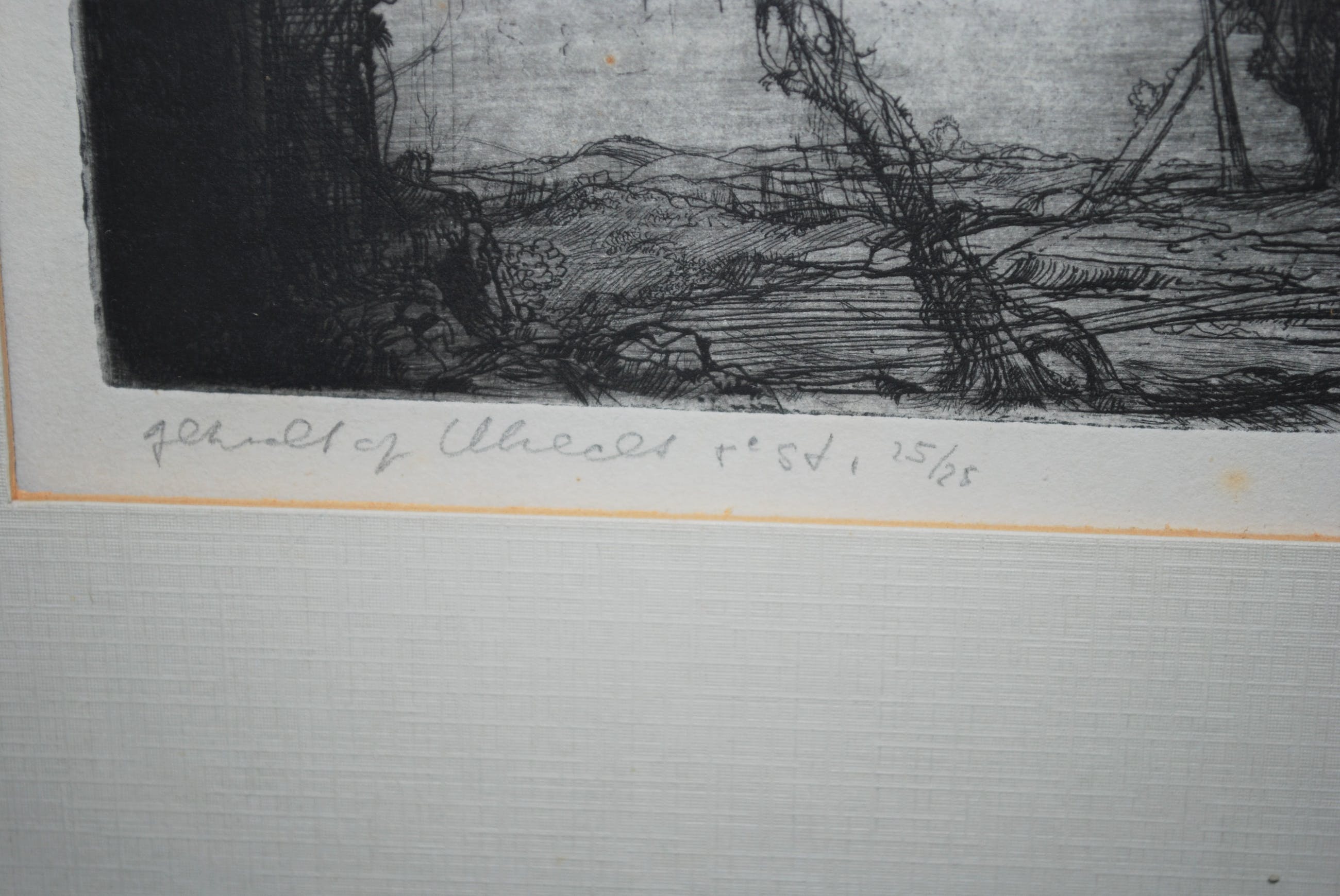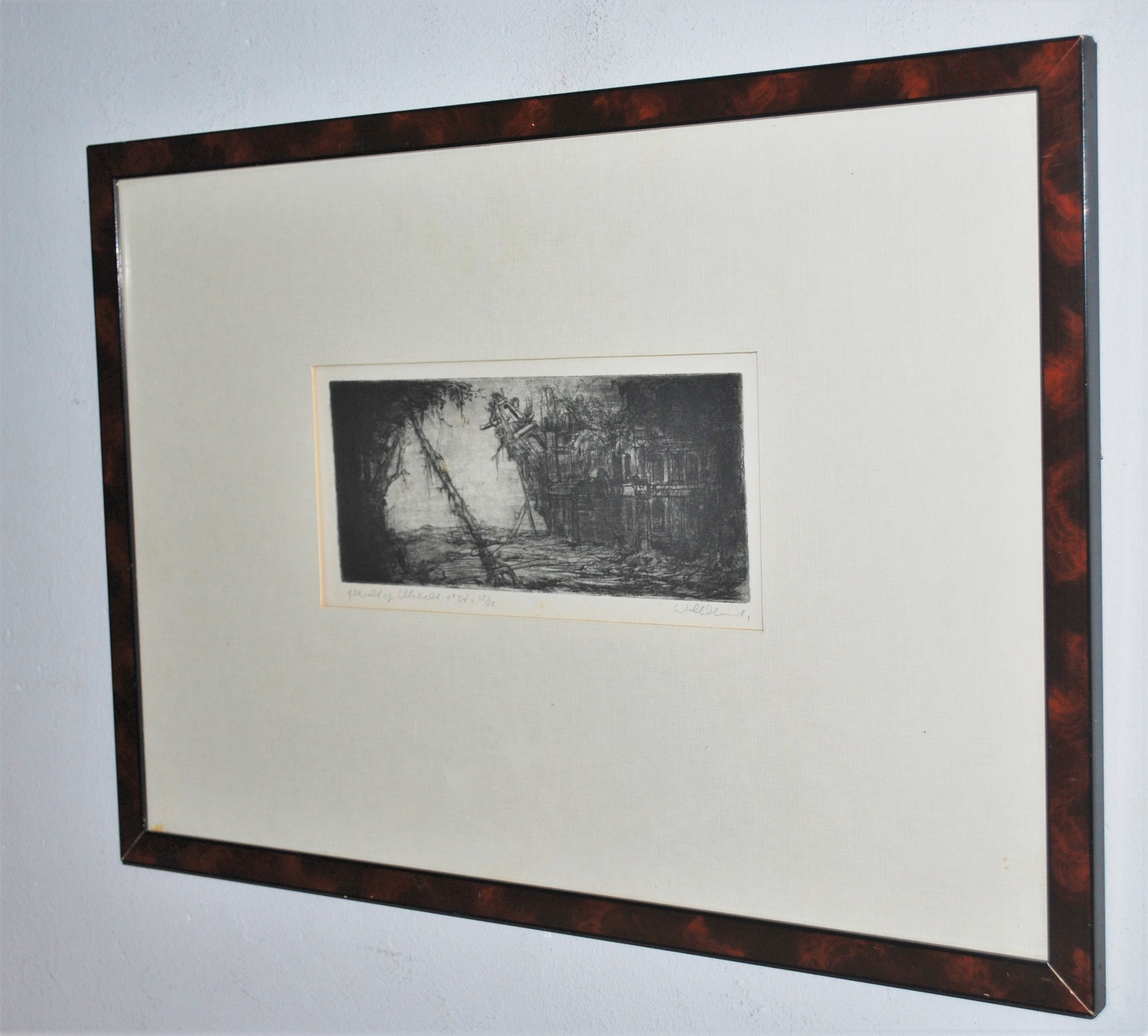 Plaatrand ca 10x23 cm. Achter passepartout en glas. In een fraaie houten lijst met geringe schade.