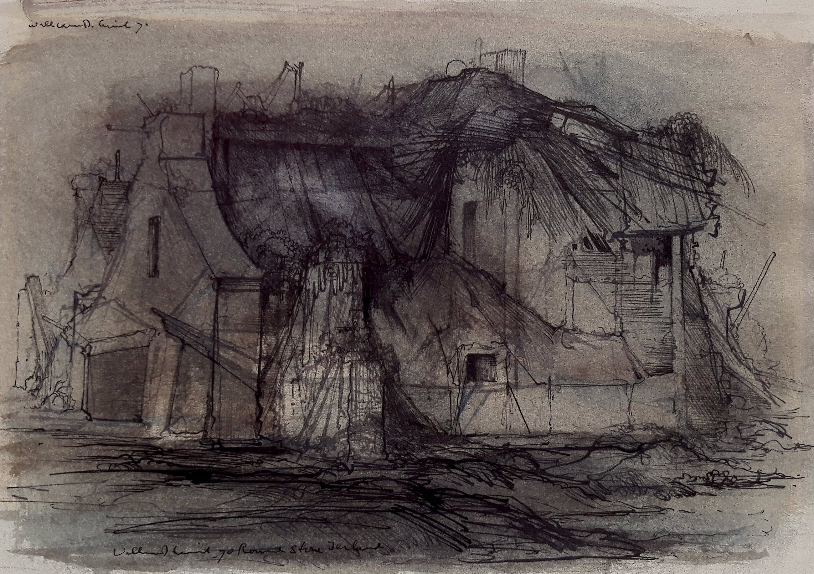 Mooi, karakteristiek werk van (toen nog) William Kuik. Gewassen inkt op dik papier, linksboven in inkt gesigneerd en gedateerd (‘70), linksonder gesitueerd (Roundstone Ierland) en nogmaals gesigneerd en gedateerd, in verso nogmaals gesigneerd, gedateerd en gesitueerd met een nog preciezere toevoeging “Huis van Moll Magee”. In zeer goede conditie; alleen heel lichte verkleuring binnen een vorig passe-partout.