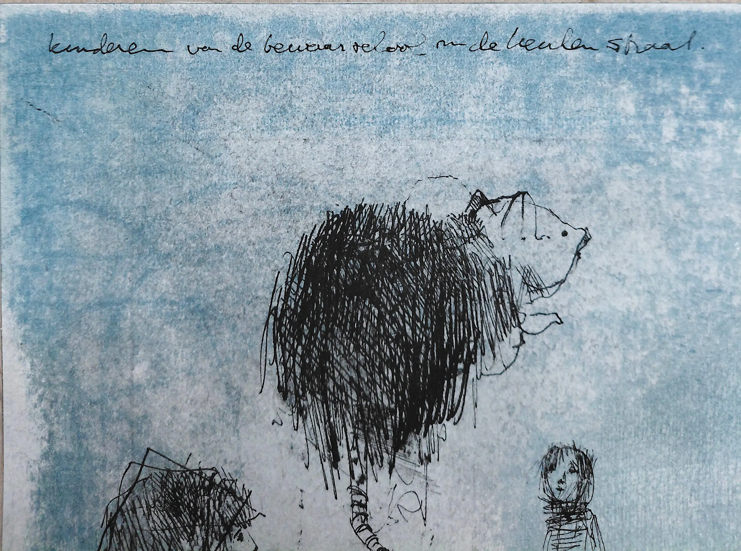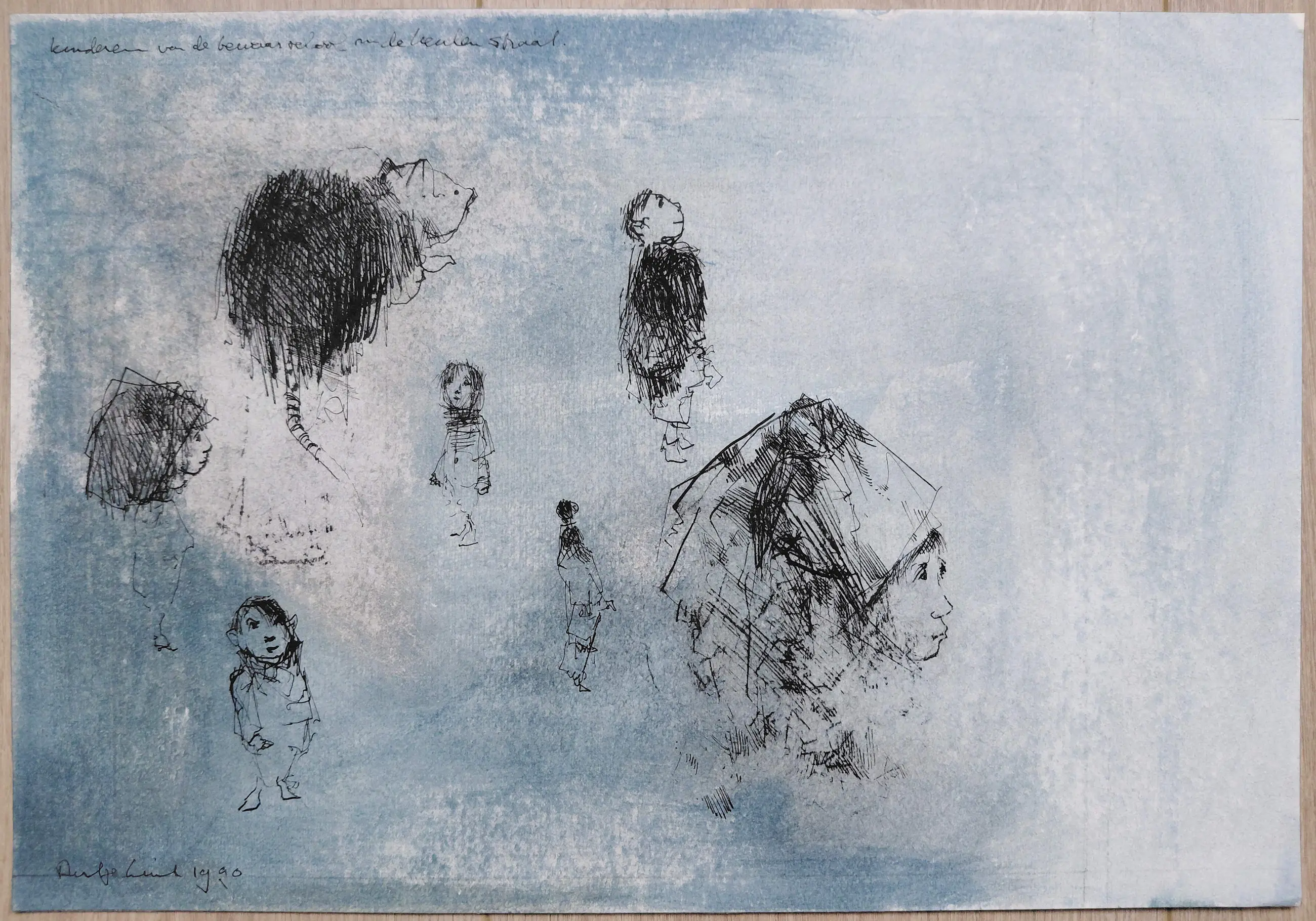 Karakteristiek, origineel werk van Dirkje Kuik. Kinderen van de protestantse bewaarschool in de Utrechtse Keukenstraat. Inkttekening op geschept papier, met inkt gesigneerd en gedateerd (1990) linksonder, getiteld linksboven. In zeer goede conditie.