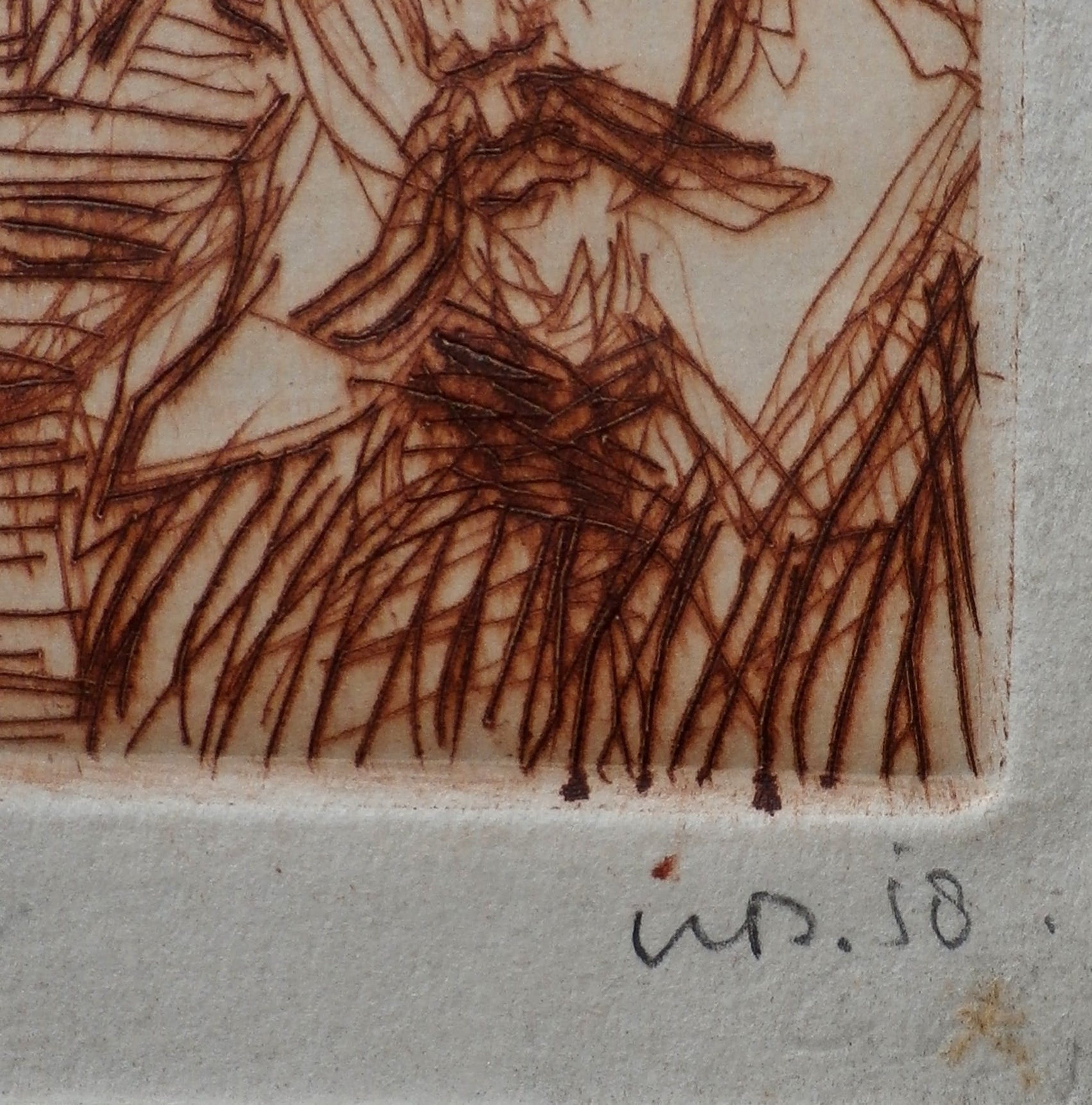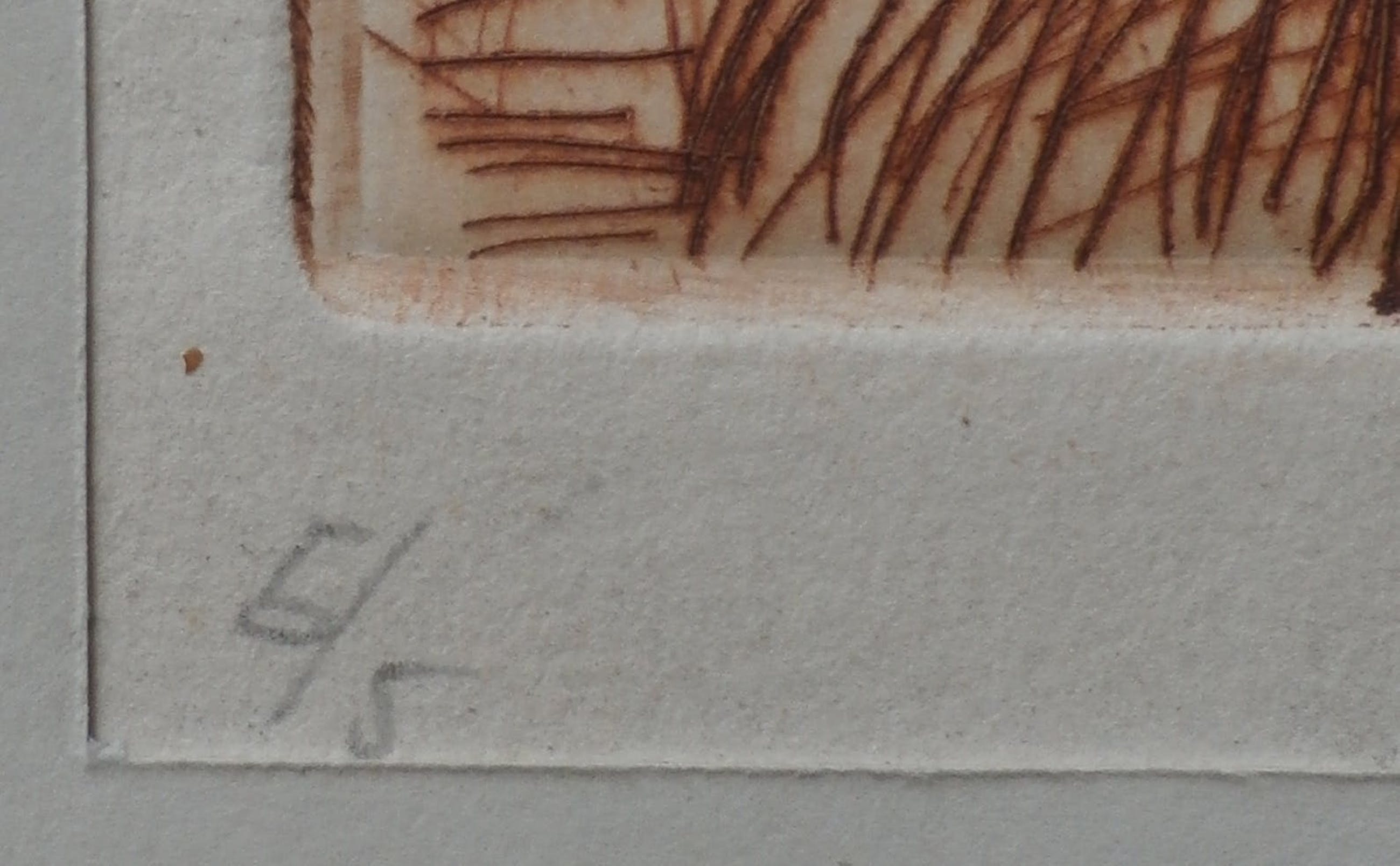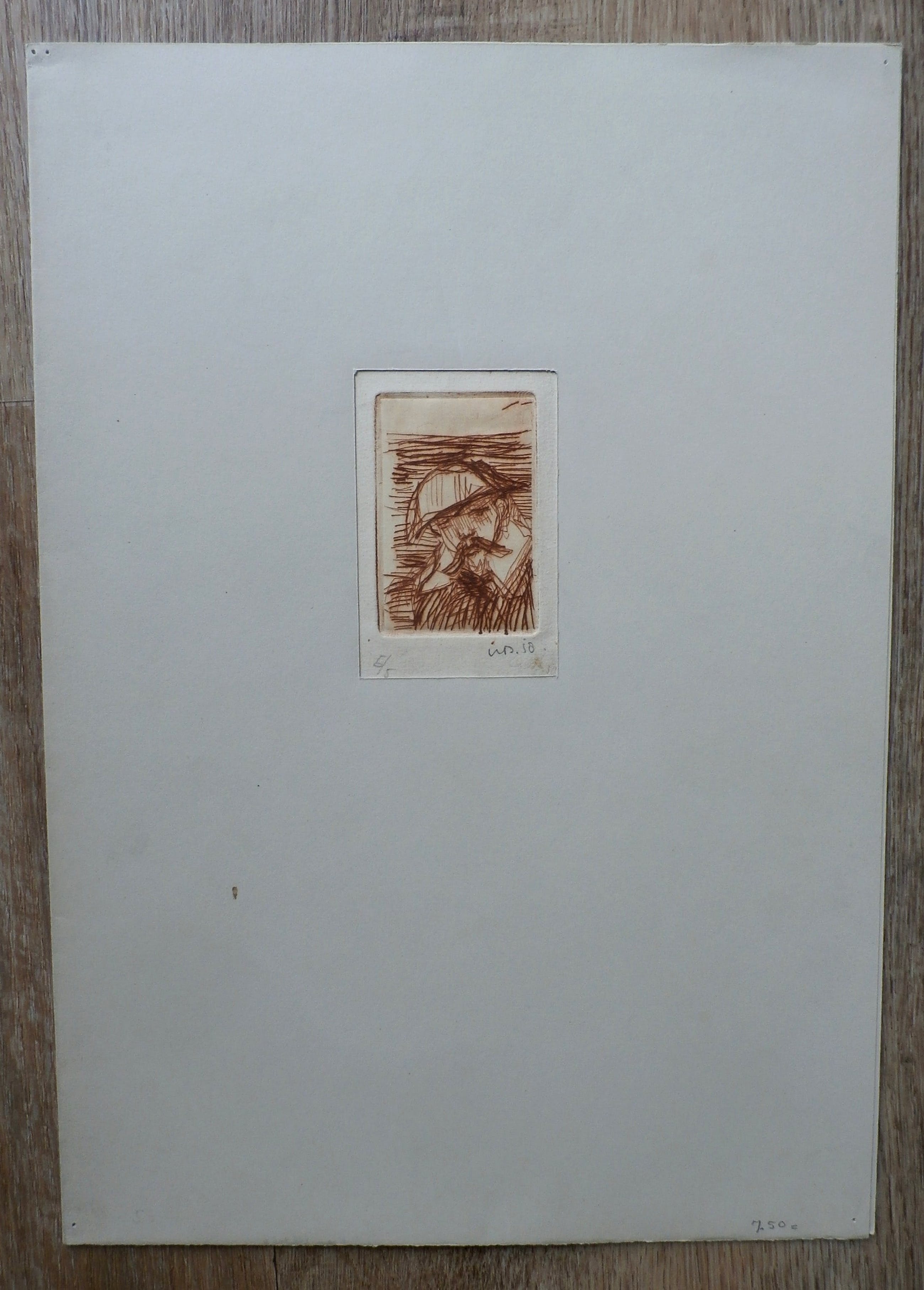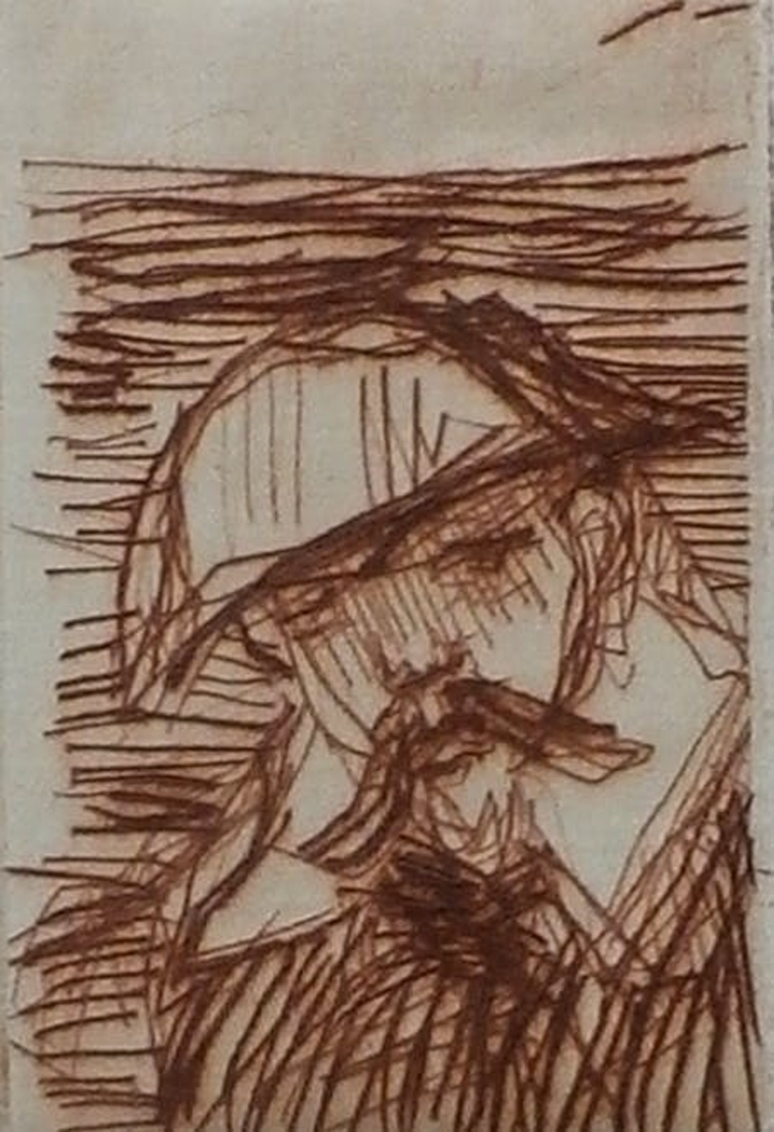 Kleine ets van Dirkje Kuik. Nummer: 5/5. Afmetingen blad incl passepartout: H35 x b25 cm. Afmetingen voorstelling: H6.5 x b4.5 cm. Het werk is rechtsonder, met potlood, gesigneerd door de kunstenaar.