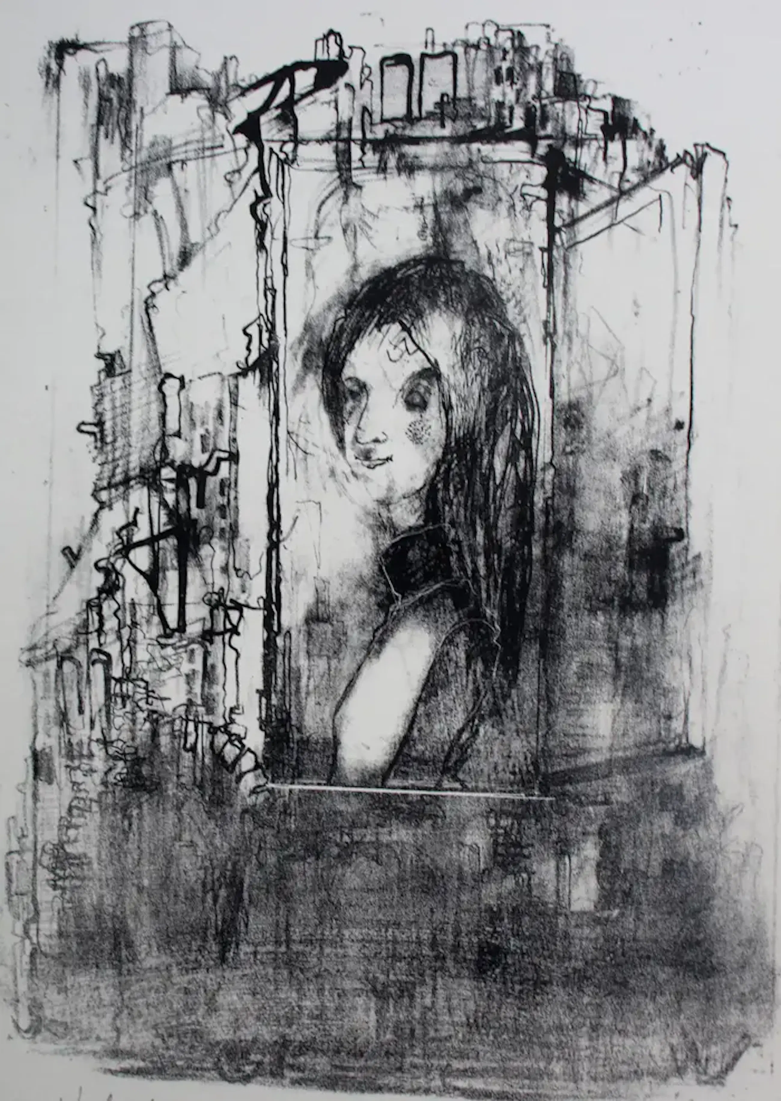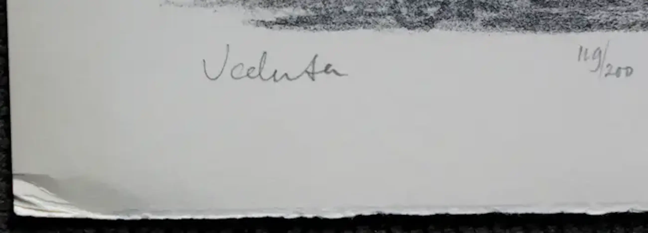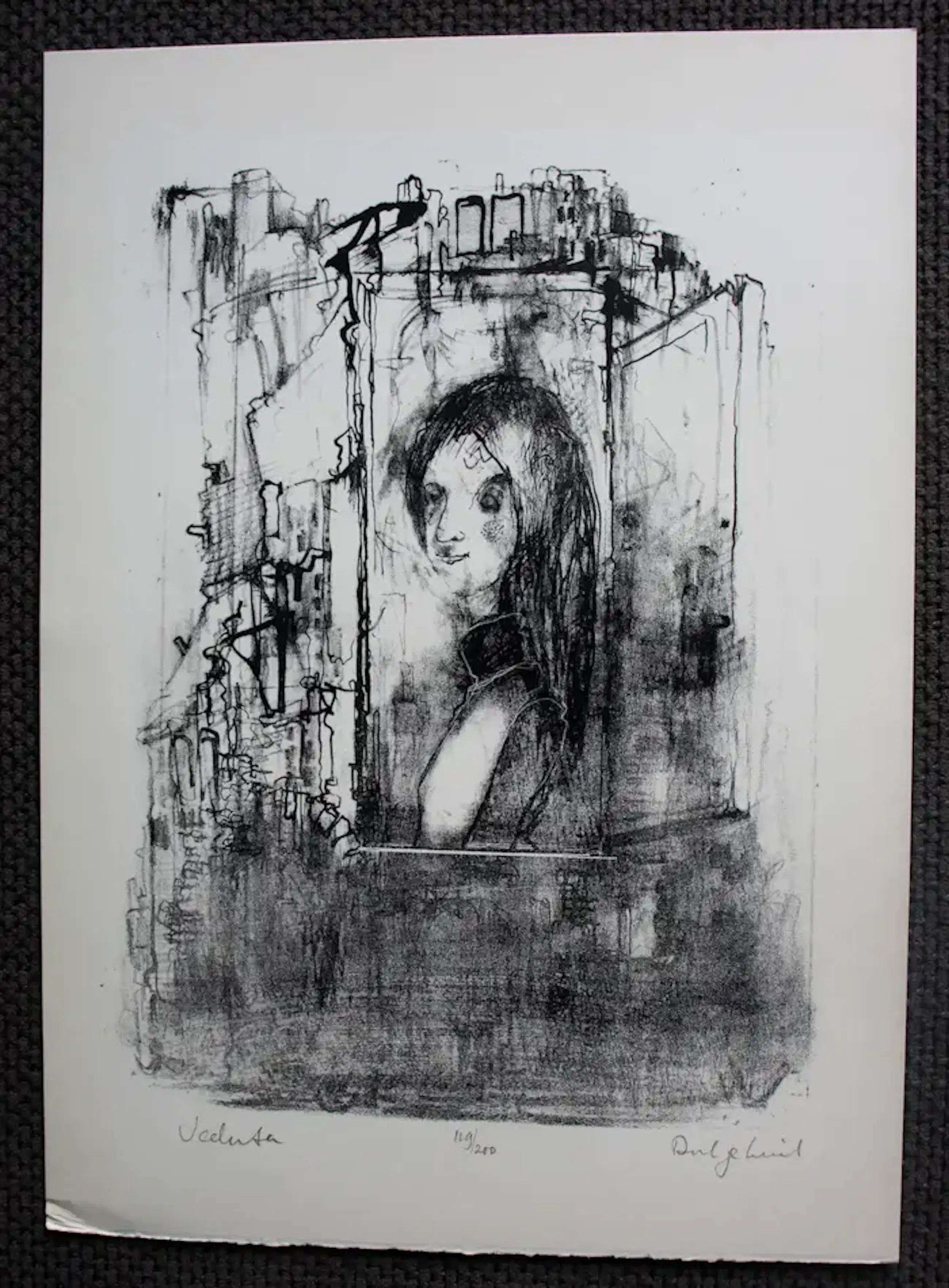 Litho van Dirkje Kuik. Jaar: 1979. Titel: Veduta. Nummer: 119/200. Afmetingen blad: H32 x b23cm. Afmetingen voorstelling: H25 x b18cm. Rechts onderaan, door de kunstenares, gesigneerd met potlood. De authenticiteit van het, aangeboden, werk wordt volledig gegarandeerd. Een certificaat van echtheid kan, op aanvraag, worden gemaild.