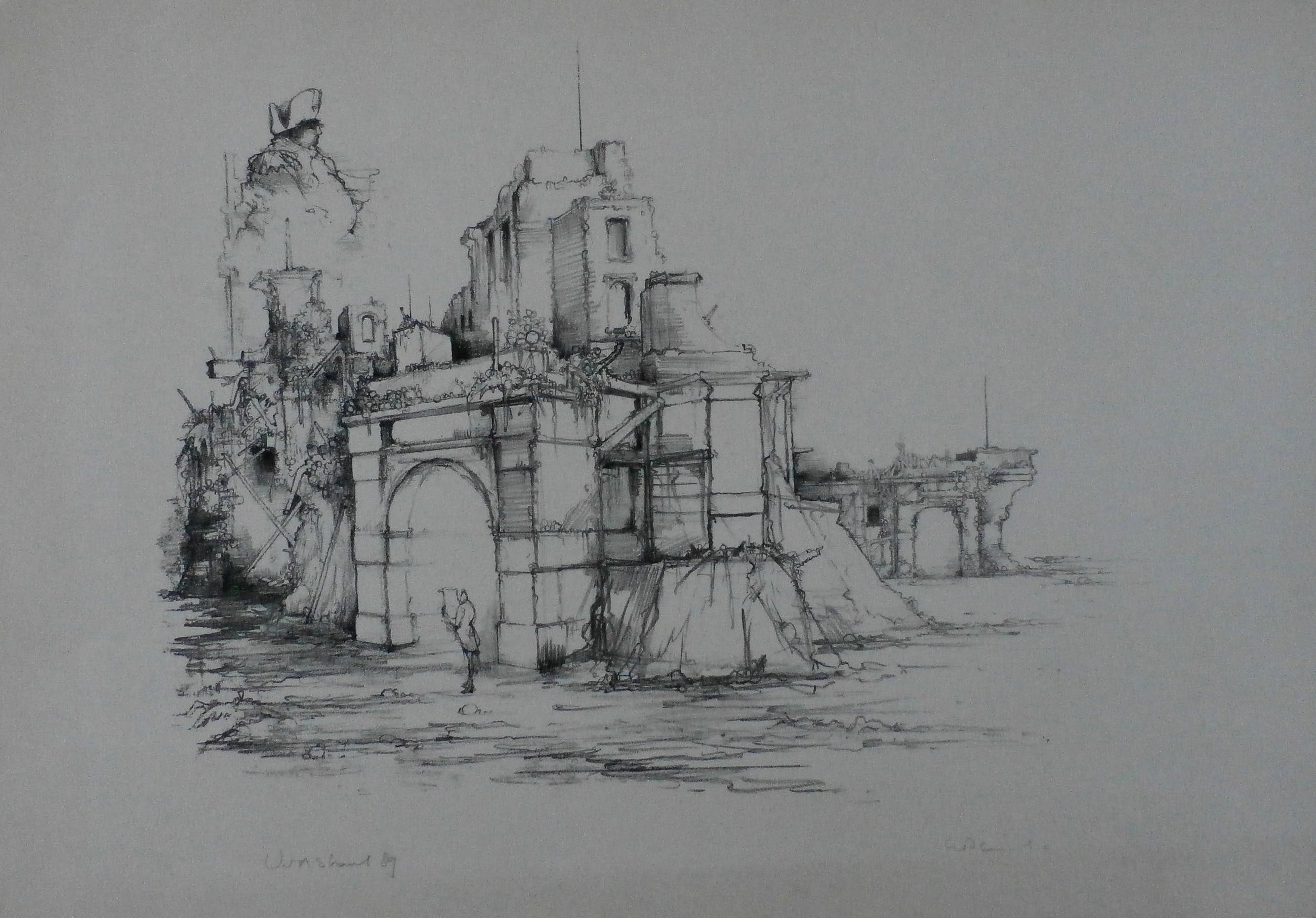 Grote litho van Dirkje Kuik uit 1989. Titel: Voorschout. Het werk is rechtsonder, met potlood, gesigneerd door de kunstenaar. Afmetingen blad: H42 x b60 cm. Afmetingen voorstelling: H32 x b42 cm.