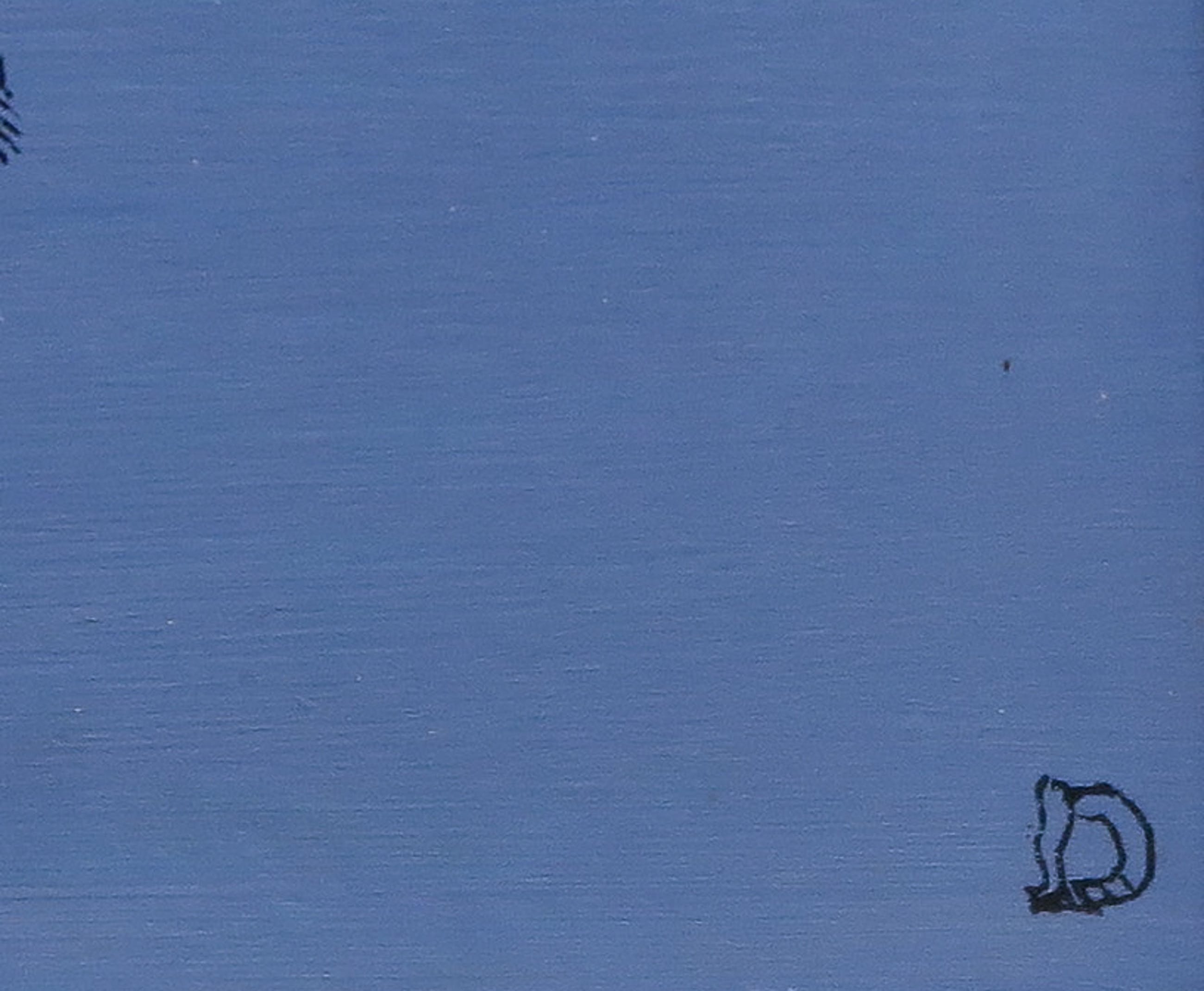 Over het algemeen zeer goede staat. Craquelé zonder verfverlies. Paar lichte oppervlakkige beschadigingen, zoals een deukje/butsje of een krasje. Verder enkele lichte vlekjes/spikkeltjes in het beeld en langs de randen. | |