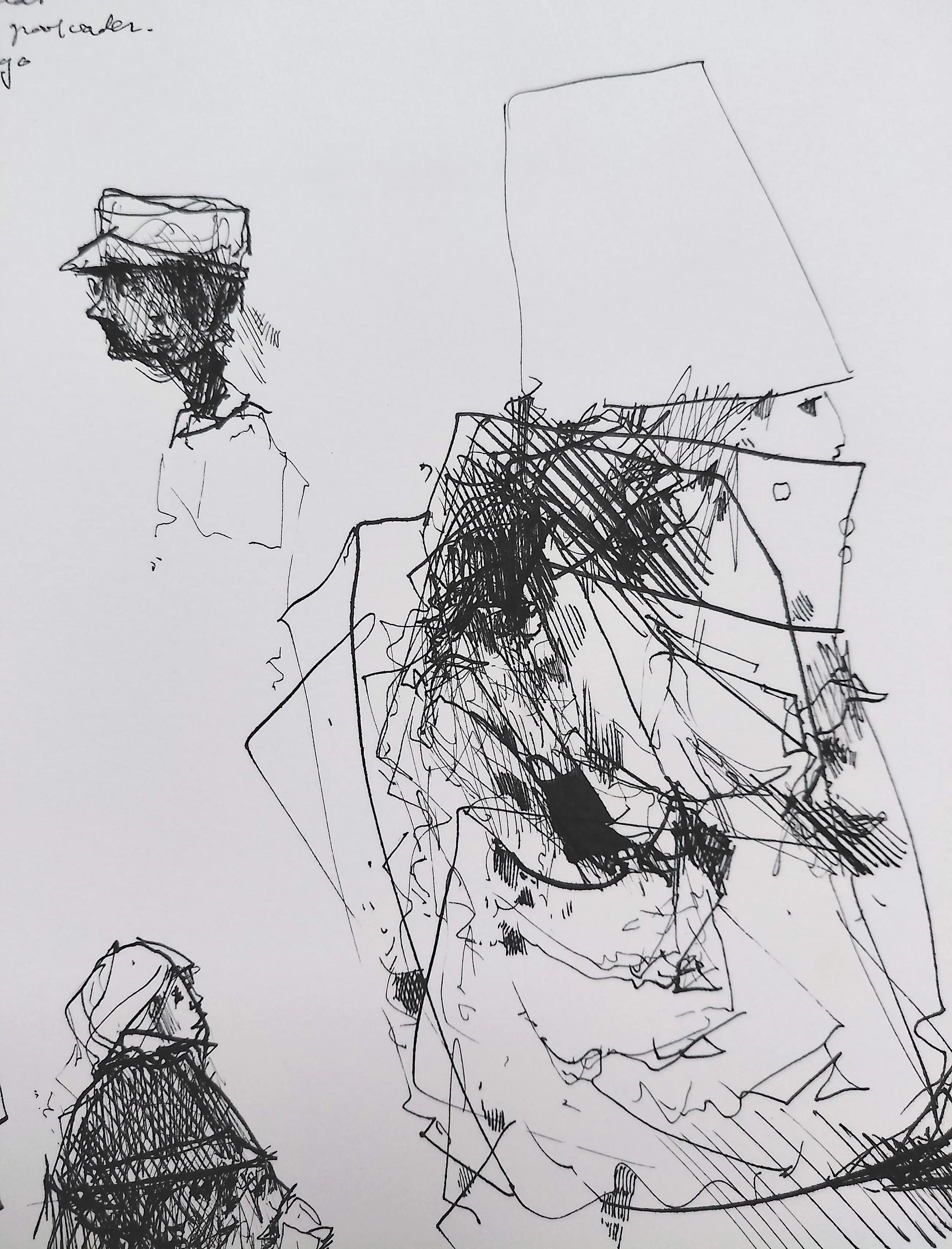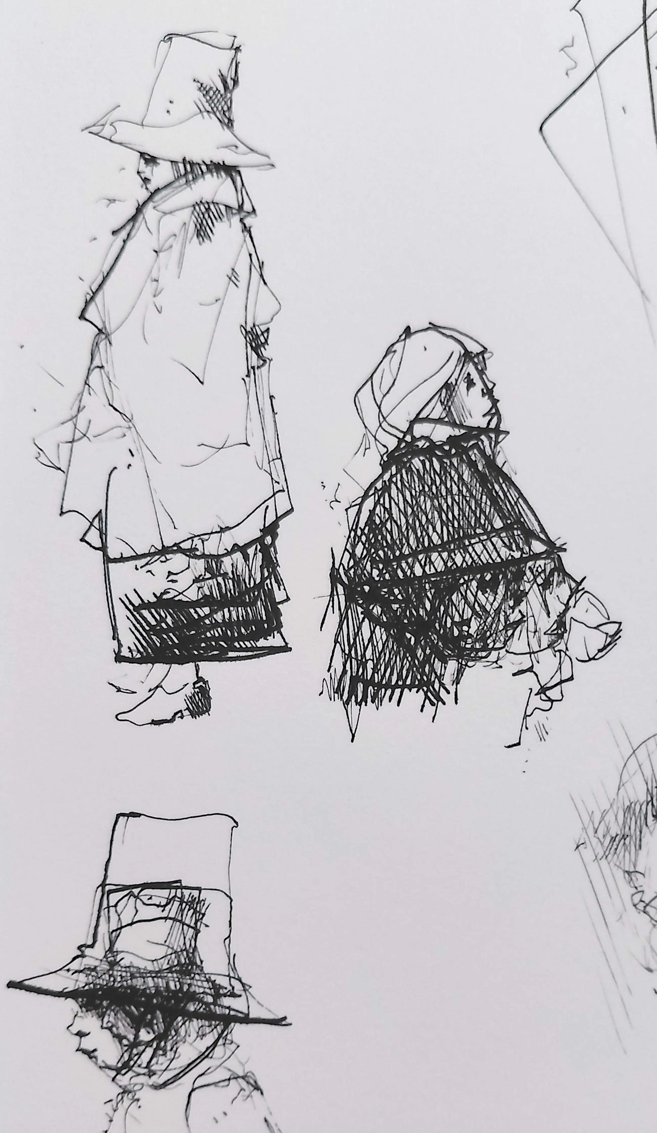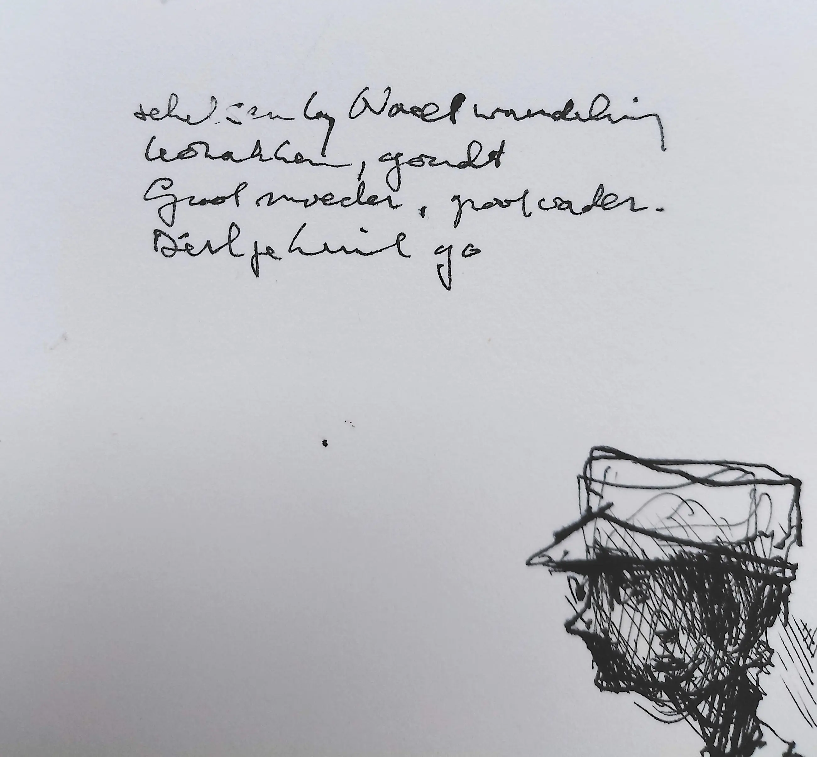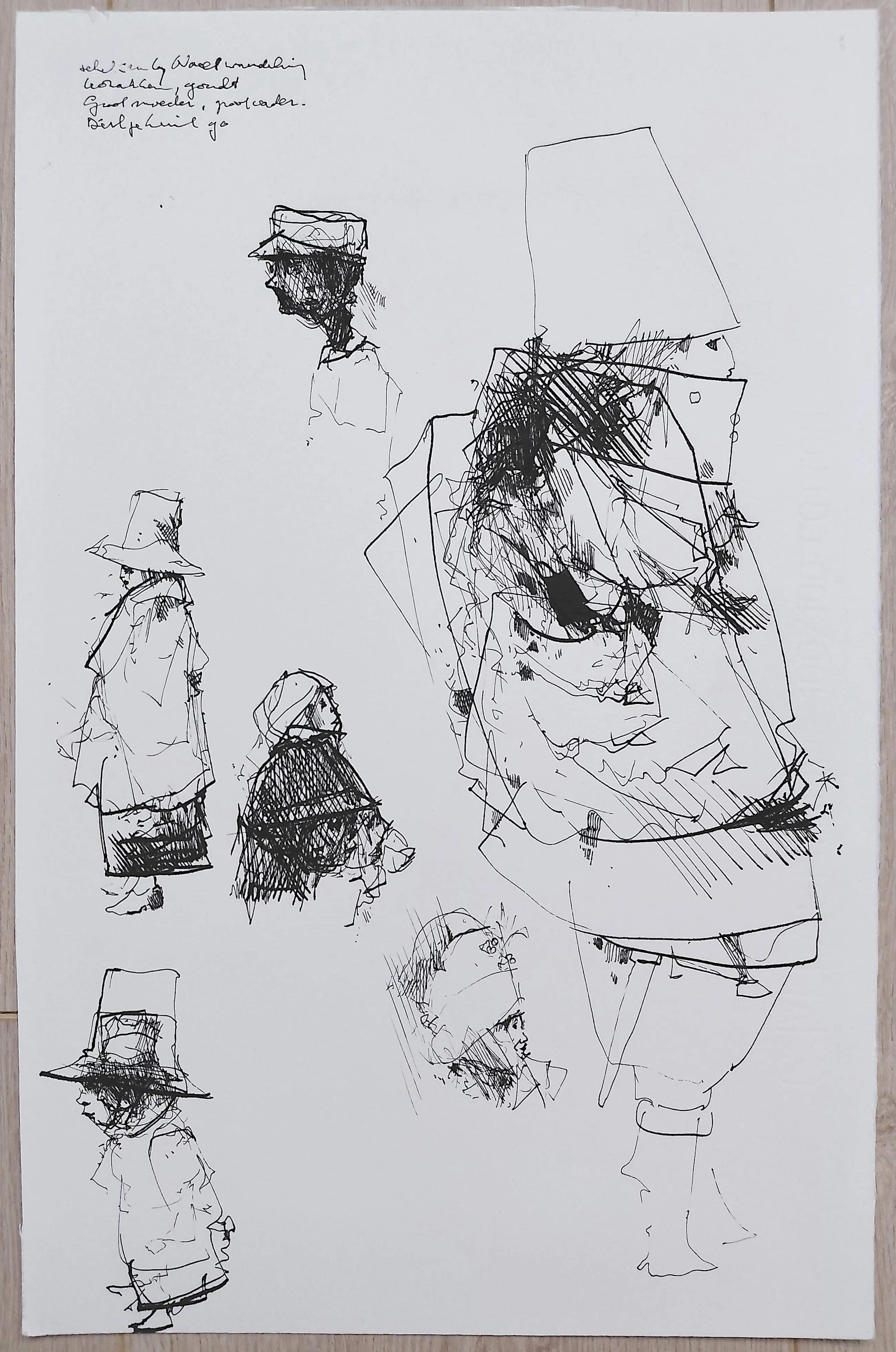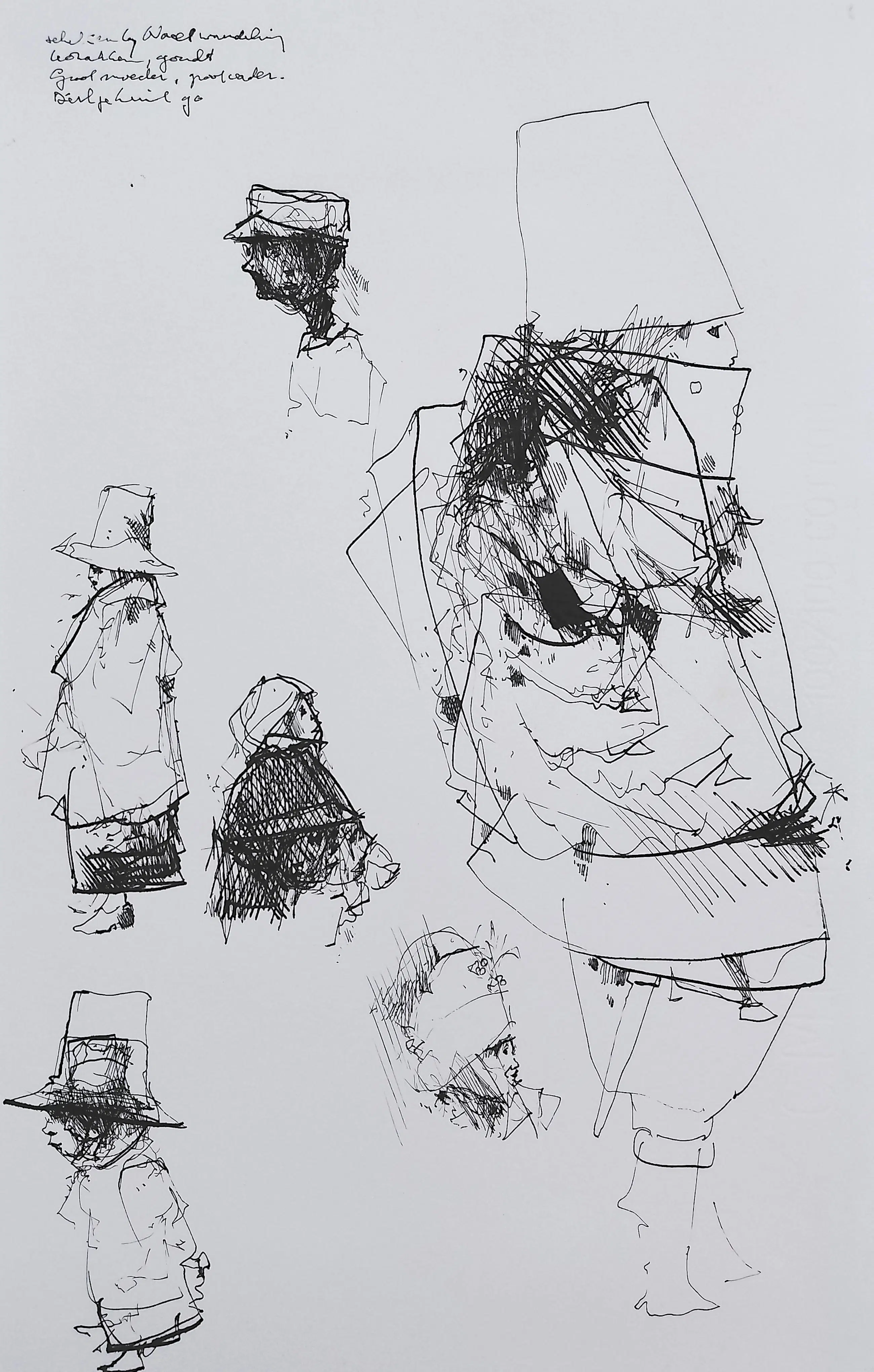 Karakteristiek, origineel werk van Dirkje Kuik. Inkttekening op Fabriano papier, met inkt gesigneerd, gedateerd (1990) en omschreven (Nachtwandeling kozakken onleesbaar Grootmoeder, grootvader) linksboven. In zeer goede conditie.