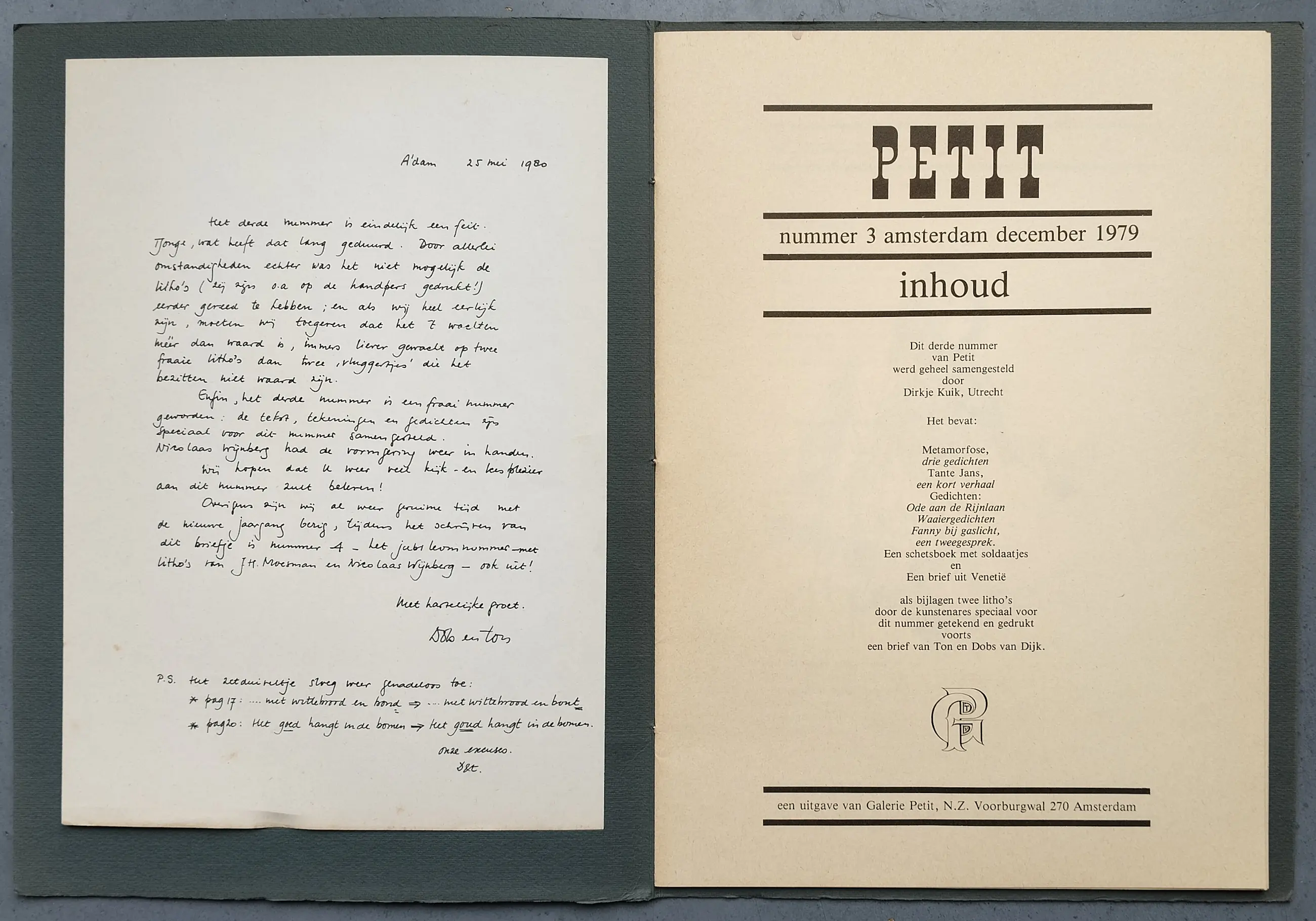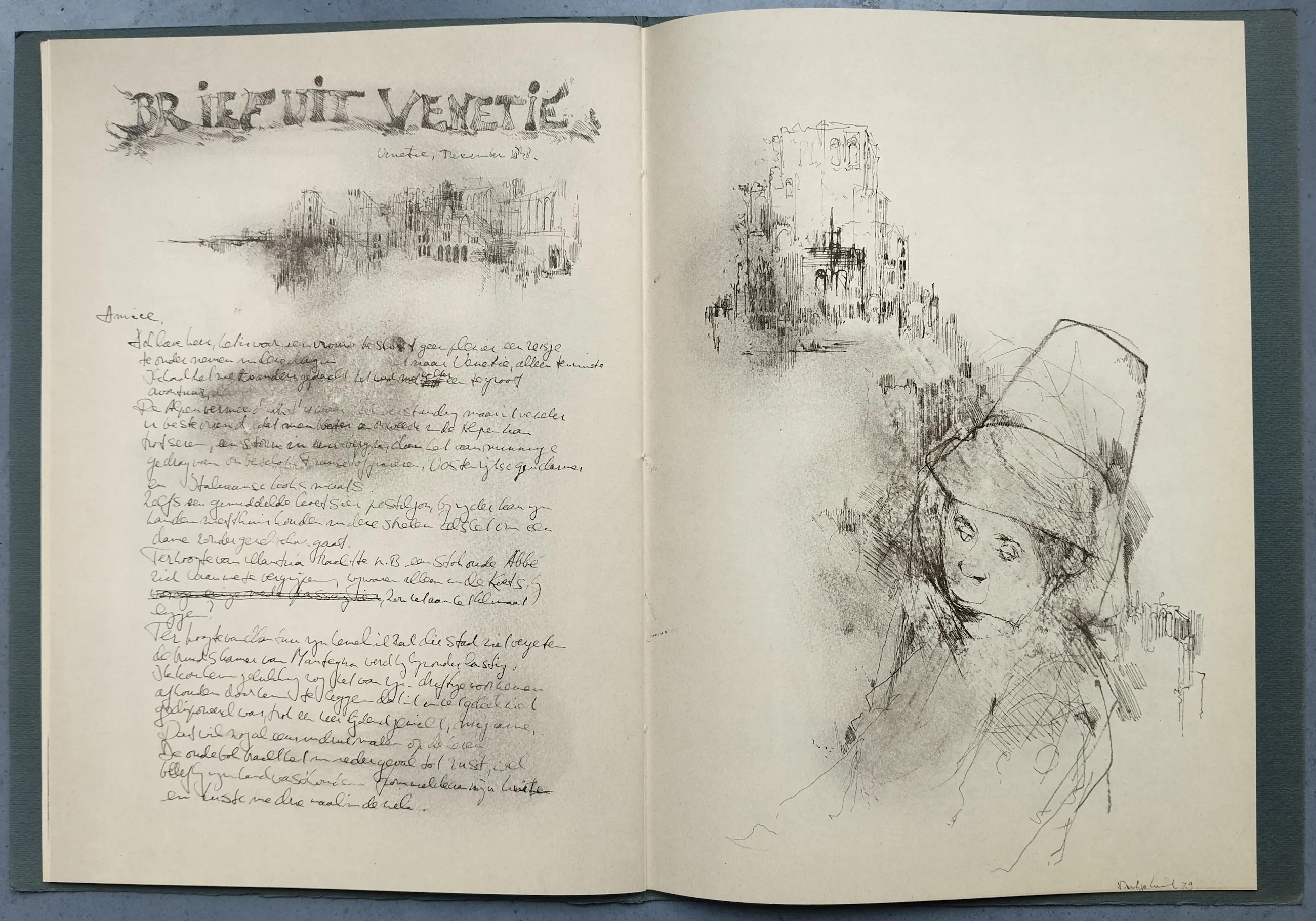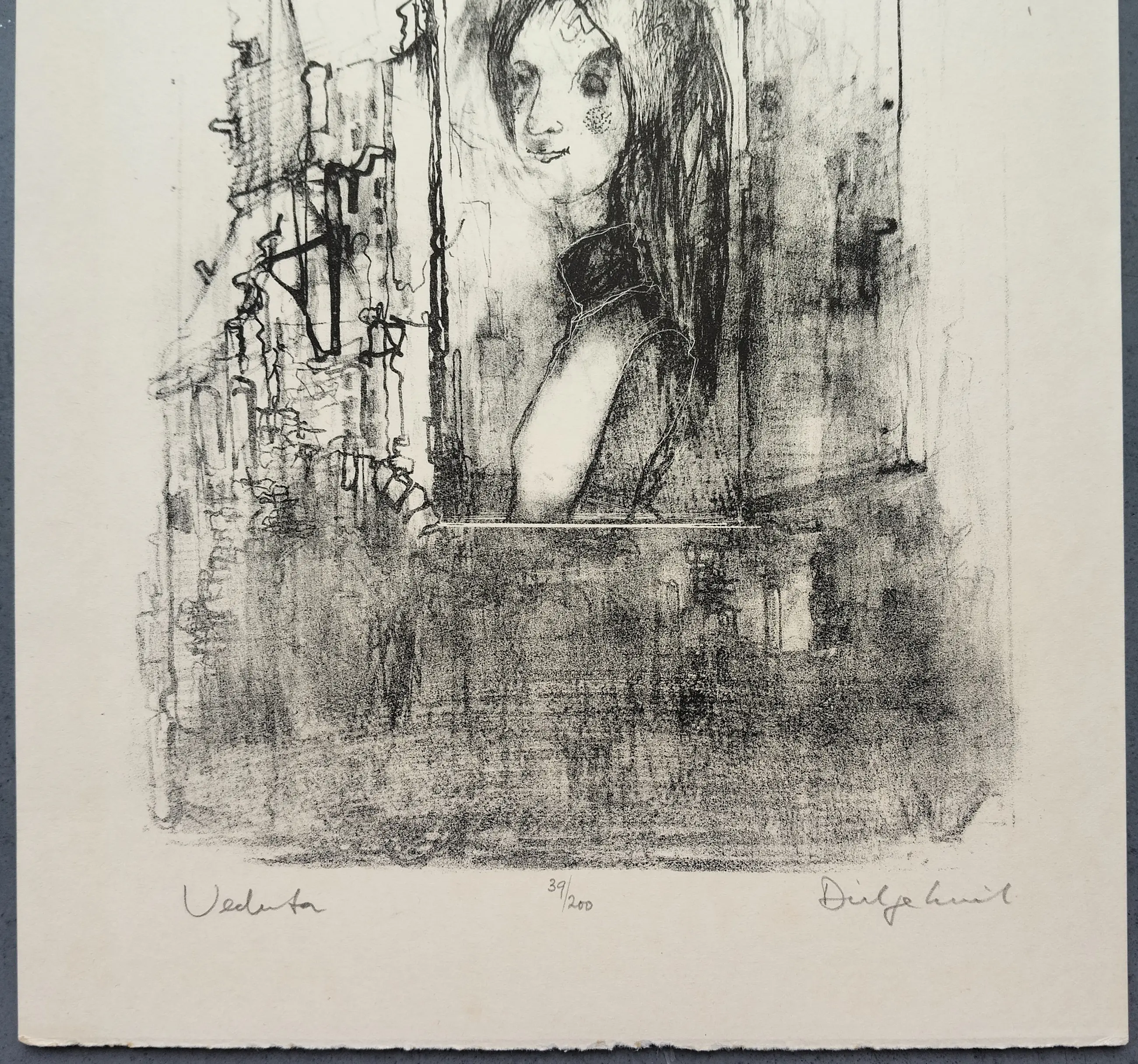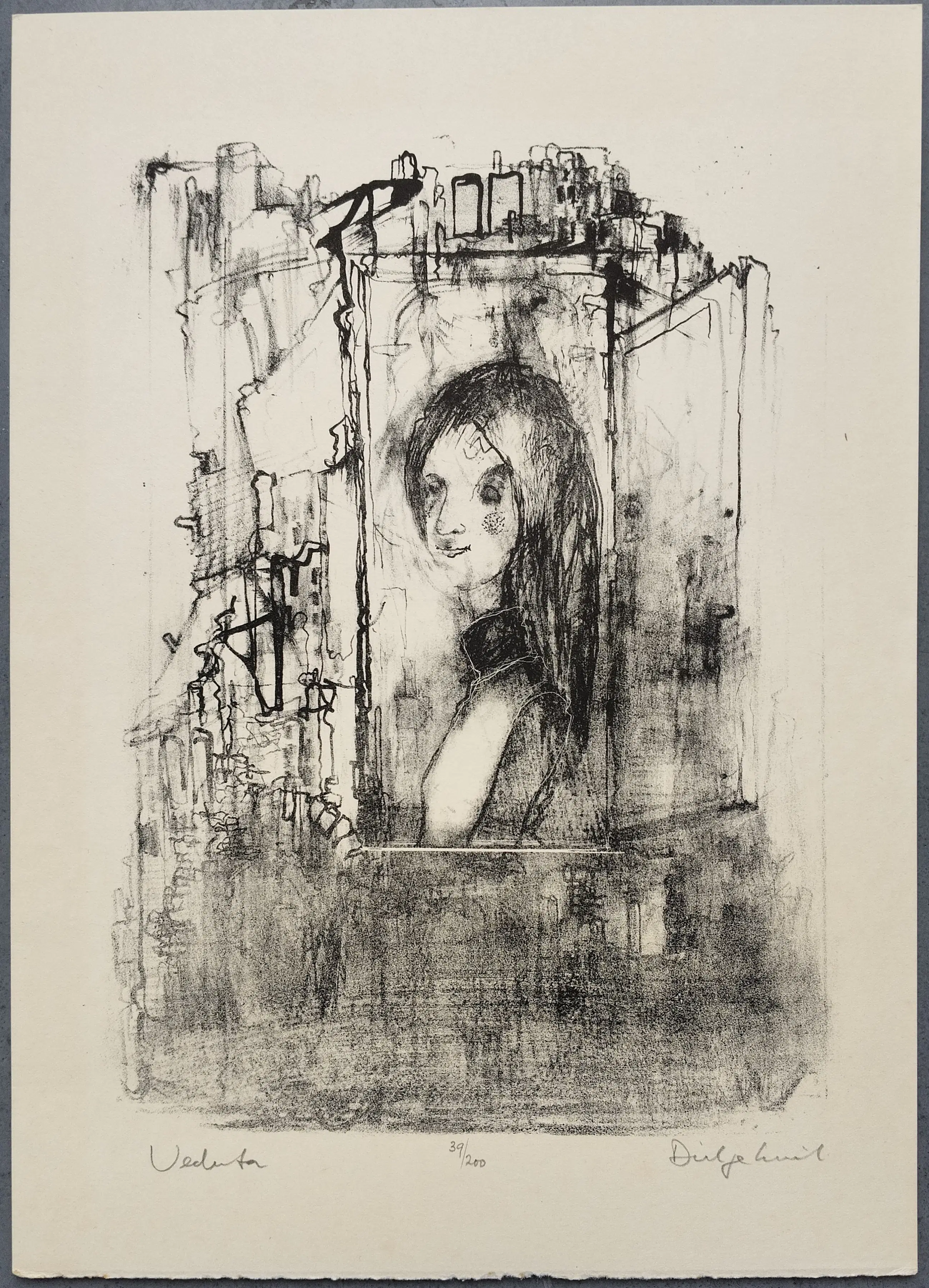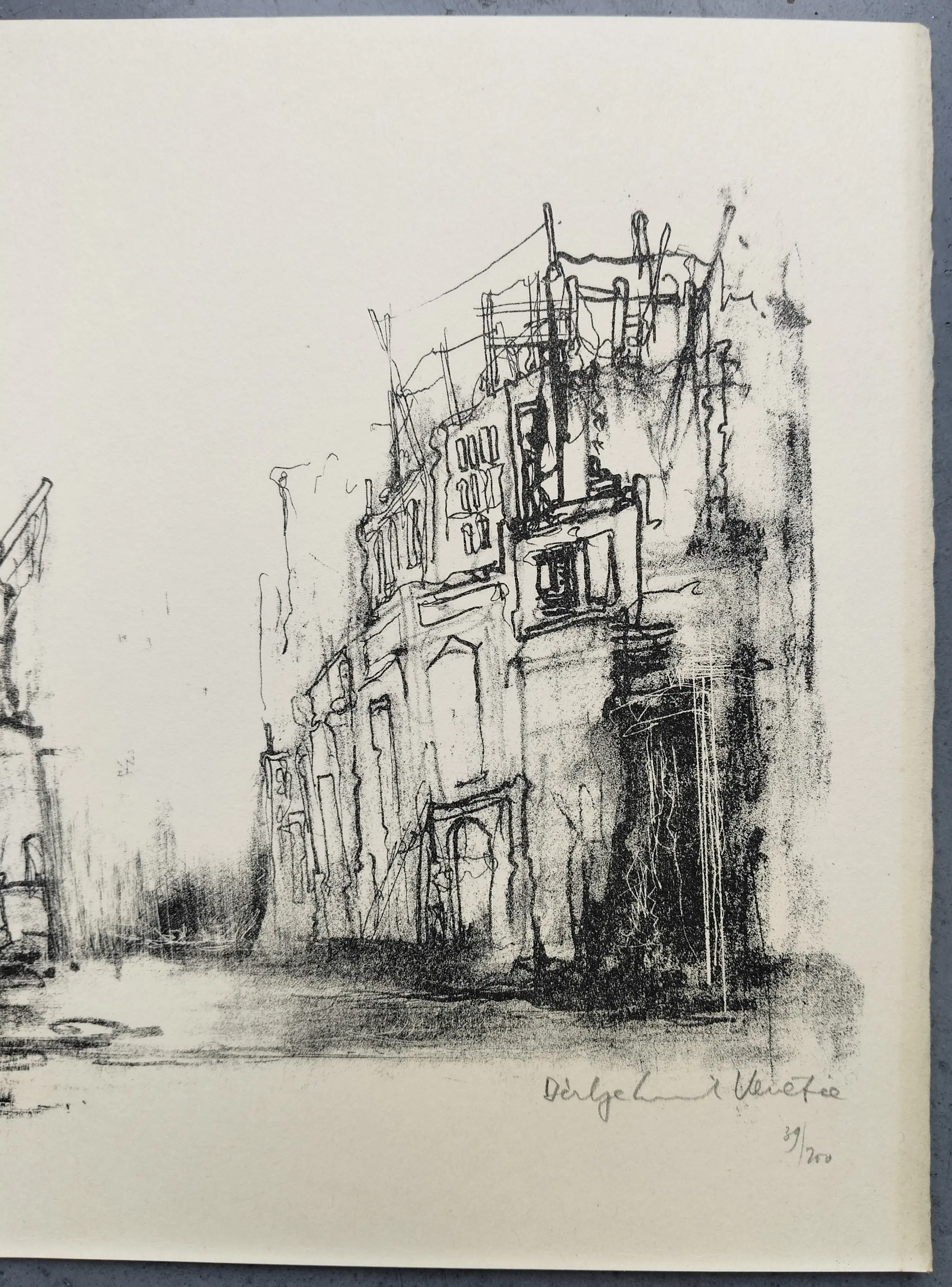 Dirkje Kuik (1929 – 2008), complete set Petit 3 met 2 gesigneerde litho’s. Gedrukt in een oplage van 200 stuks. Beide werken zijn gesigneerd en genummerd 39/200. Papiermaat 23 x 32cm. Bij de litho Venetië is langs de rechte rand een verkleuring van het papier te zien. Bij de litho Veduta is langs de linker rand een lichte verkleuring van het papier te zien en met name aan de onderzijde wat lichte vlekjes.