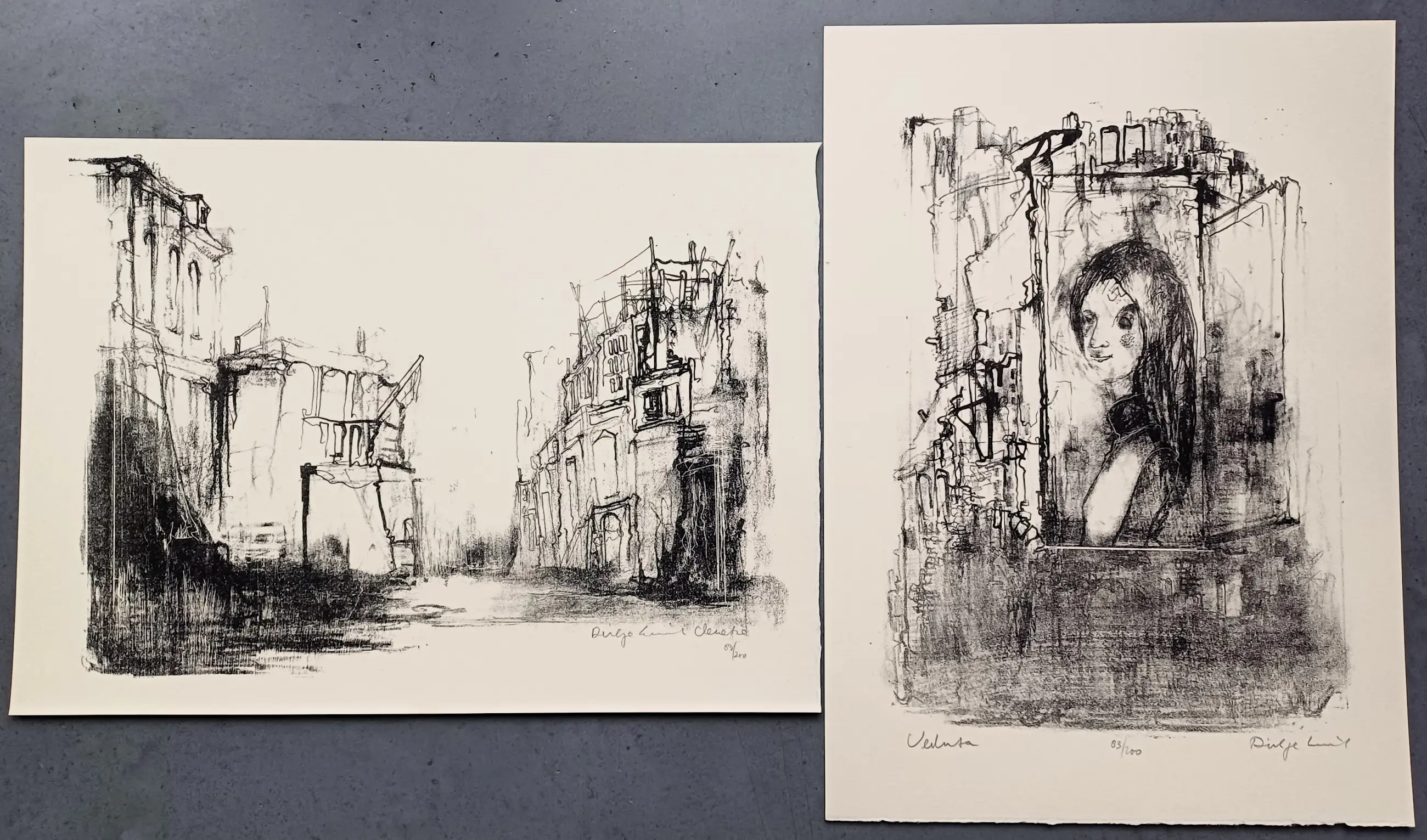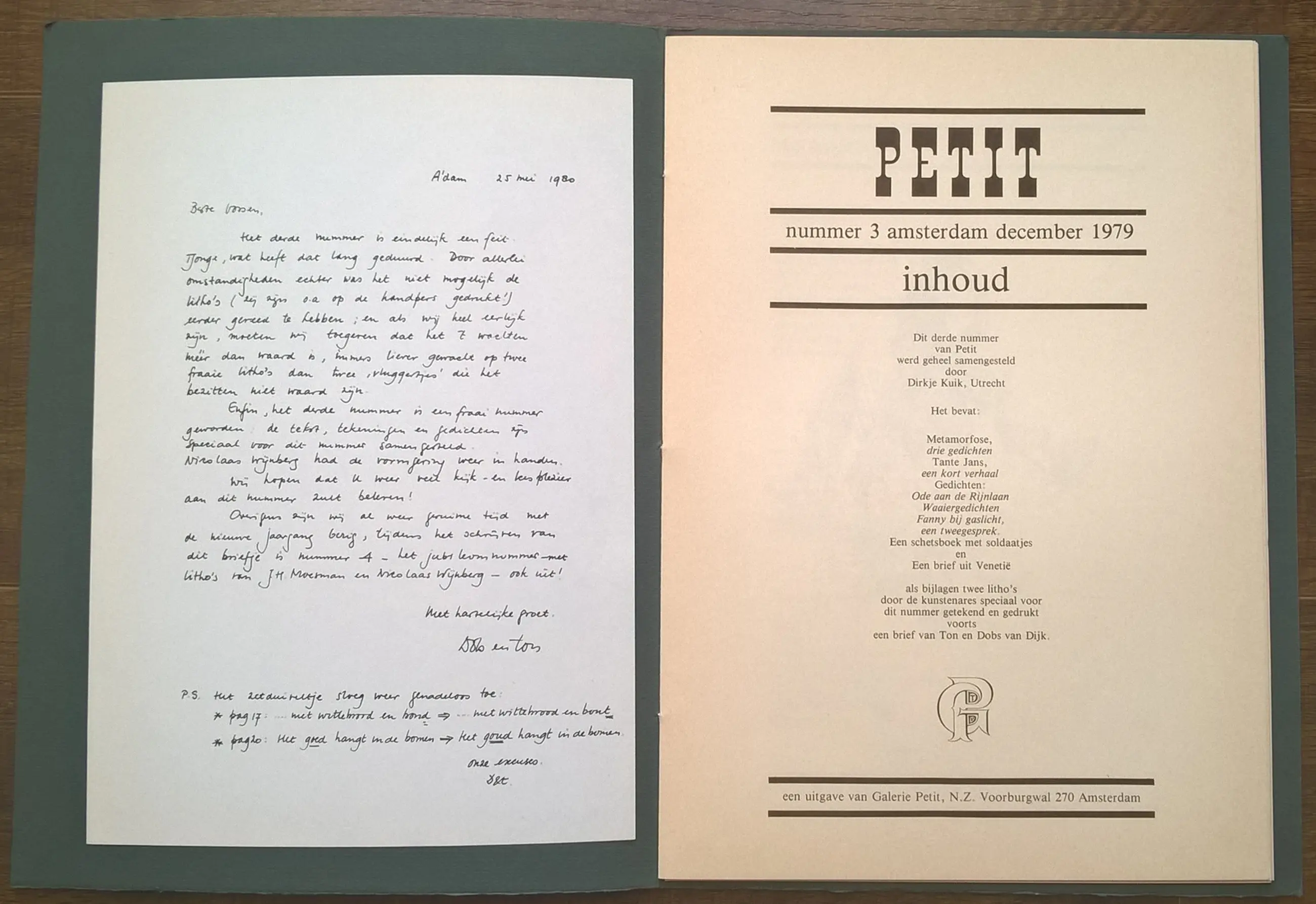 Dirkje Kuik (1929 – 2008), complete set Petit 3 met 2 gesigneerde litho’s. Gedrukt in een oplage van 200 stuks. Beide werken gesigneerd en genummerd 83/200. Papiermaat 23 x 32cm. Langs de linker rand van 1 litho zit een licht klein vlekje, het boekje Petit 3 heeft een vouw in de rechter bovenhoek. Verder alles in prima staat