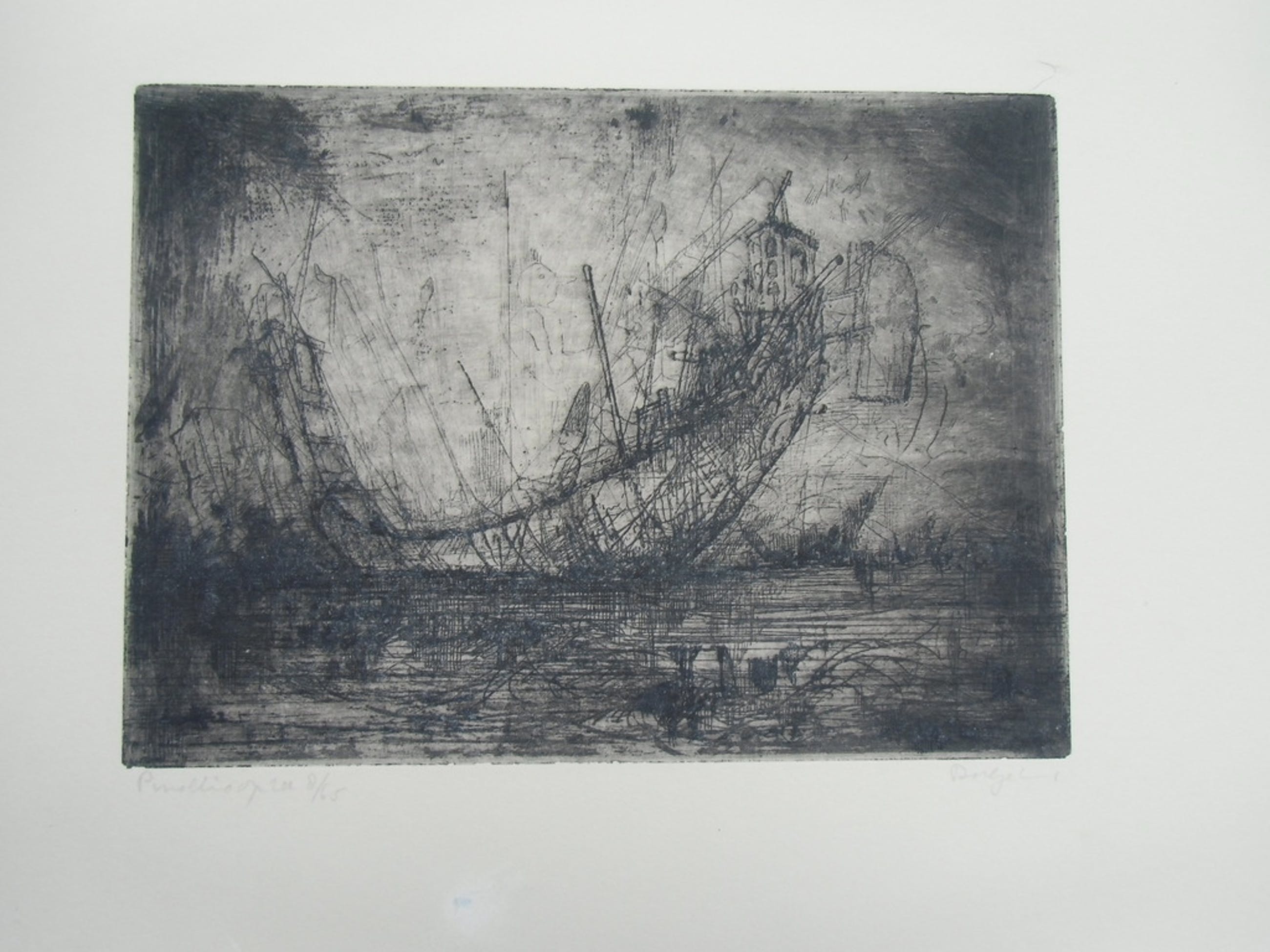 Uit het Leven van Pinokkio is dit Pinokkio op Zee. Deze ets heeft een beeldmaat van 17.8 x 24.9 cm op een blad van 35 x 50 cm.